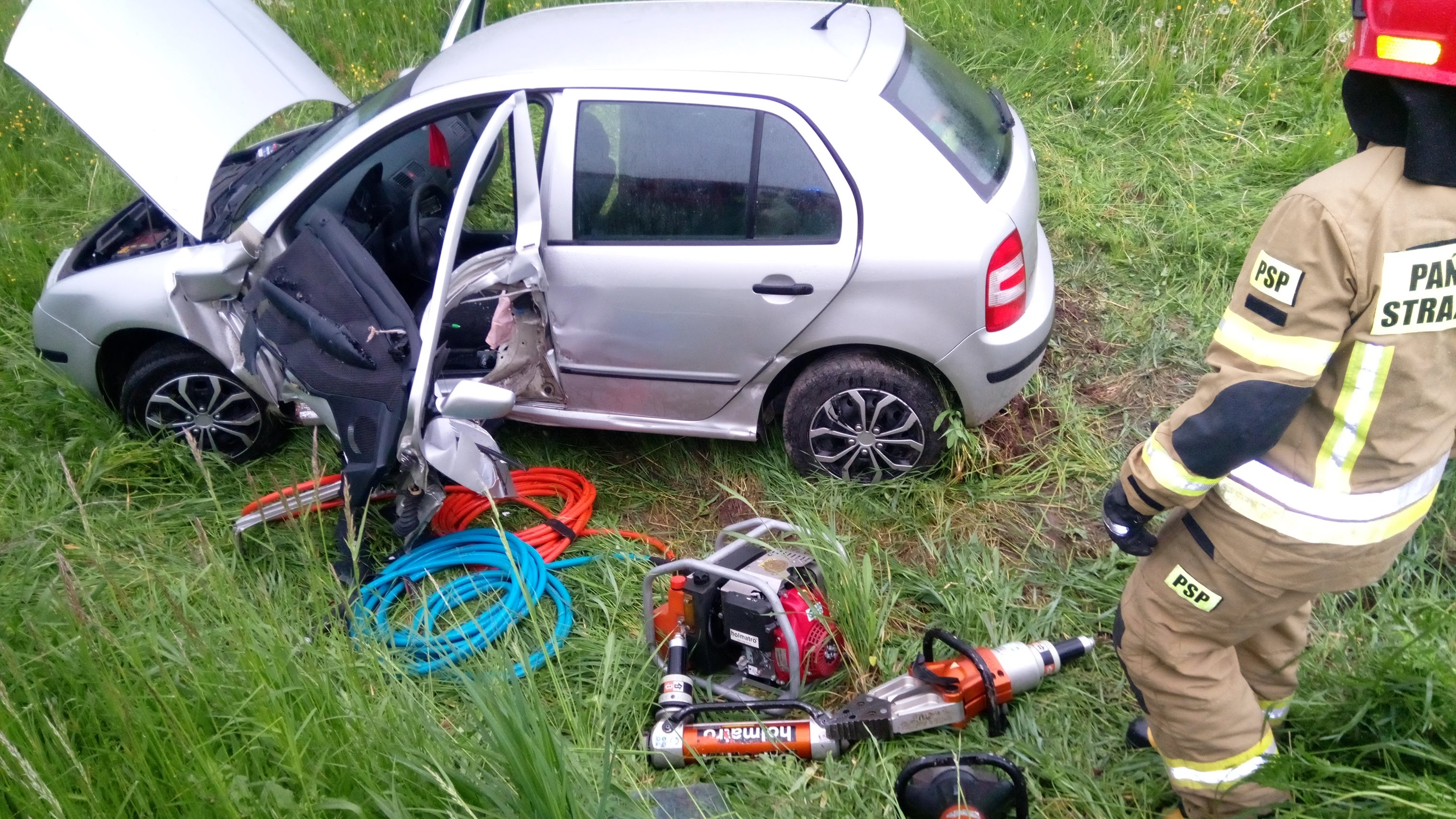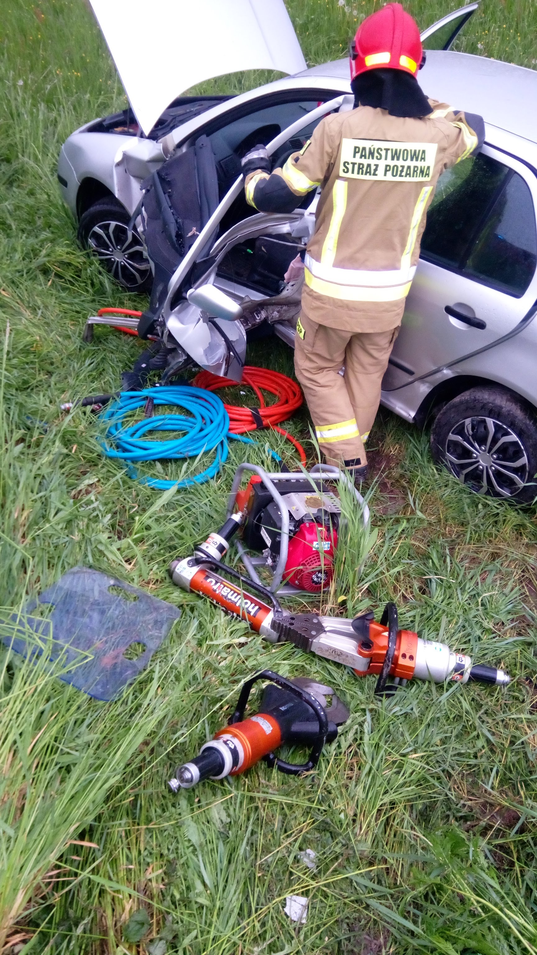 Po dojeździe na miejsce zdarzenia zastępów straży pożarnej stwierdzono, że w miejscowości Wygiełzów, samochód osobowy uderzył w barierę energochłonną i wypadł z drogi. Pojazd stał na kołach obok nasypu drogi, na pobliskiej łące. Brak wycieków płynów eksploatacyjnych. Samochodem podróżował jedynie kierowca, który w wyniku uszkodzenia nadwozia został uwięziony w pojeździe. Na miejscu zdarzenia znajdowała się Policja. Działania straży polegały na zabezpieczeniu miejsca zdarzenia, udzieleniu kierowcy pojazdu (osoba przytomna) wsparcia psychicznego. Następnie wykonano dostęp do osoby poszkodowanej przy pomocy urządzeń hydraulicznych. Po wydobyciu, mężczyznę przetransportowano na noszach typu deska do karetki pogotowia. Dalsze czynności dochodzeniowe prowadzi Policja.