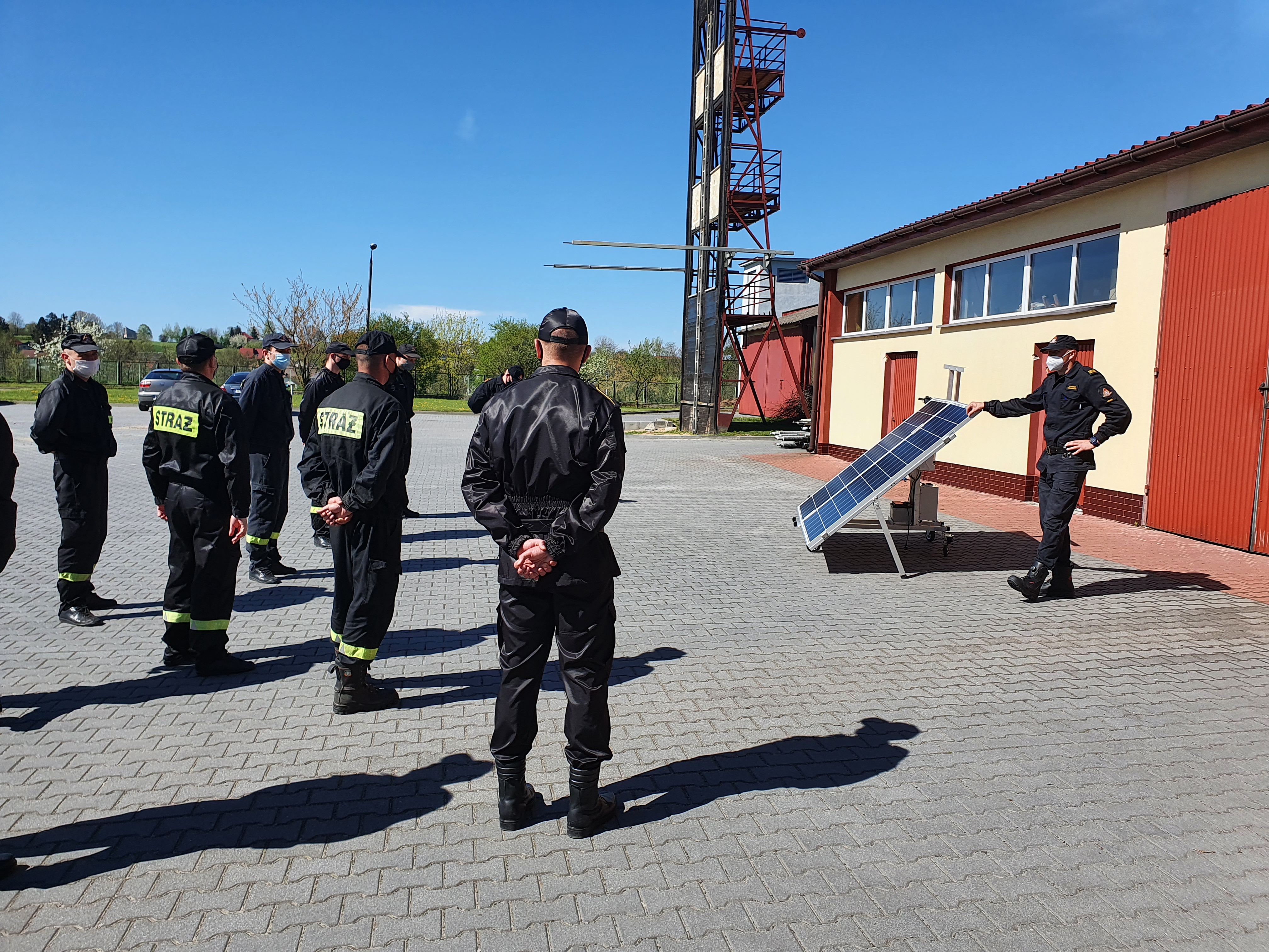 W części praktycznej szkolenia zapoznano się z budową paneli fotowoltaicznych na specjalnie przygotowanym trenażerze instalacji fotowoltaicznej, możliwościami odłączania zasilania paneli, a także sposobami prowadzenia akcji gaśniczej w przypadku wystąpienia pożaru lub awarii. Pokazy dotyczące zobrazowania dolnej i górnej granicy wybuchowości prowadzone były przy użyciu stanowiska zwanego „Akwarium Giselssona”.