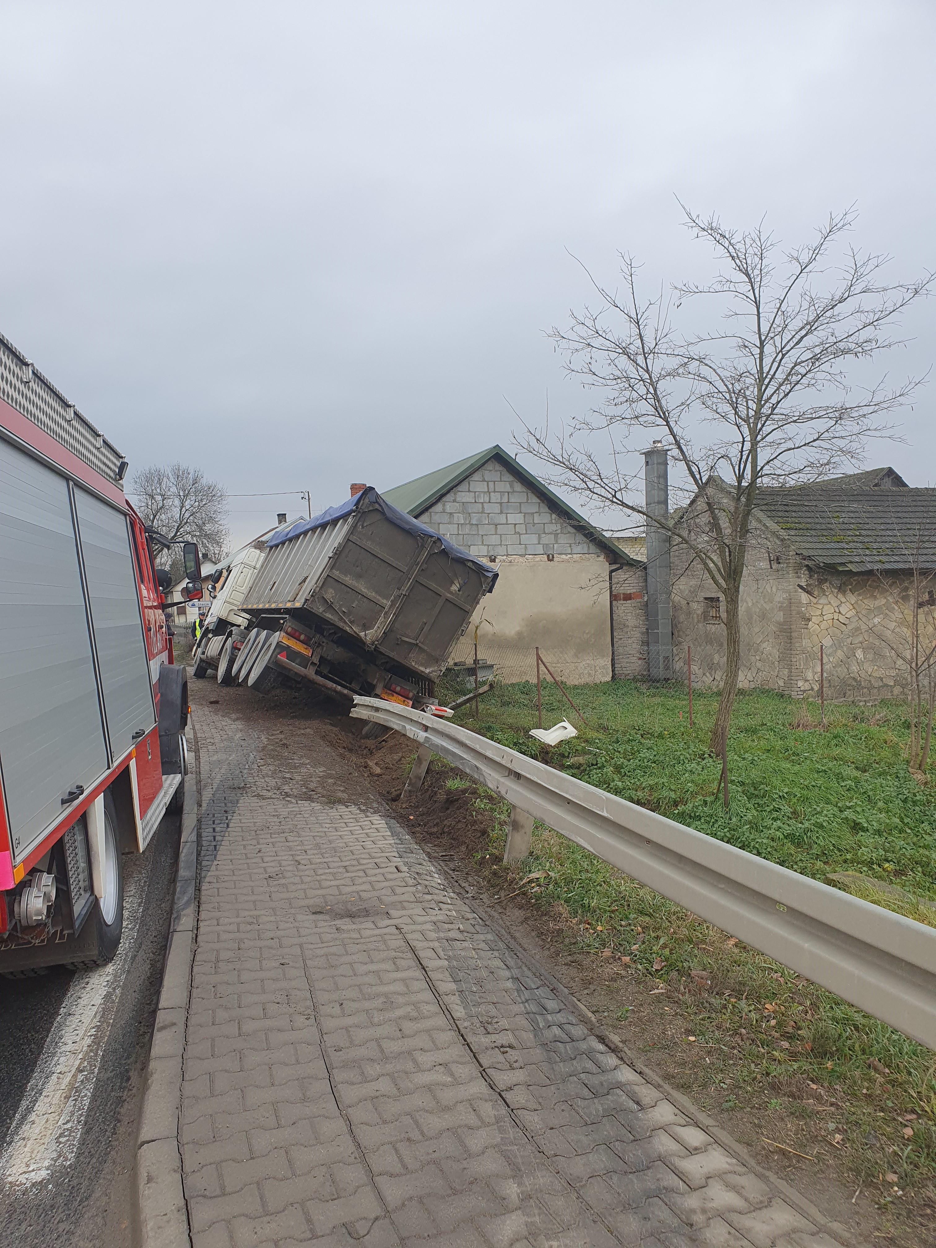 W Bidzinach gm. Wojciechowice ciągnik siodłowy z naczepą uderzył w budynek mieszkalny jednorodzinny