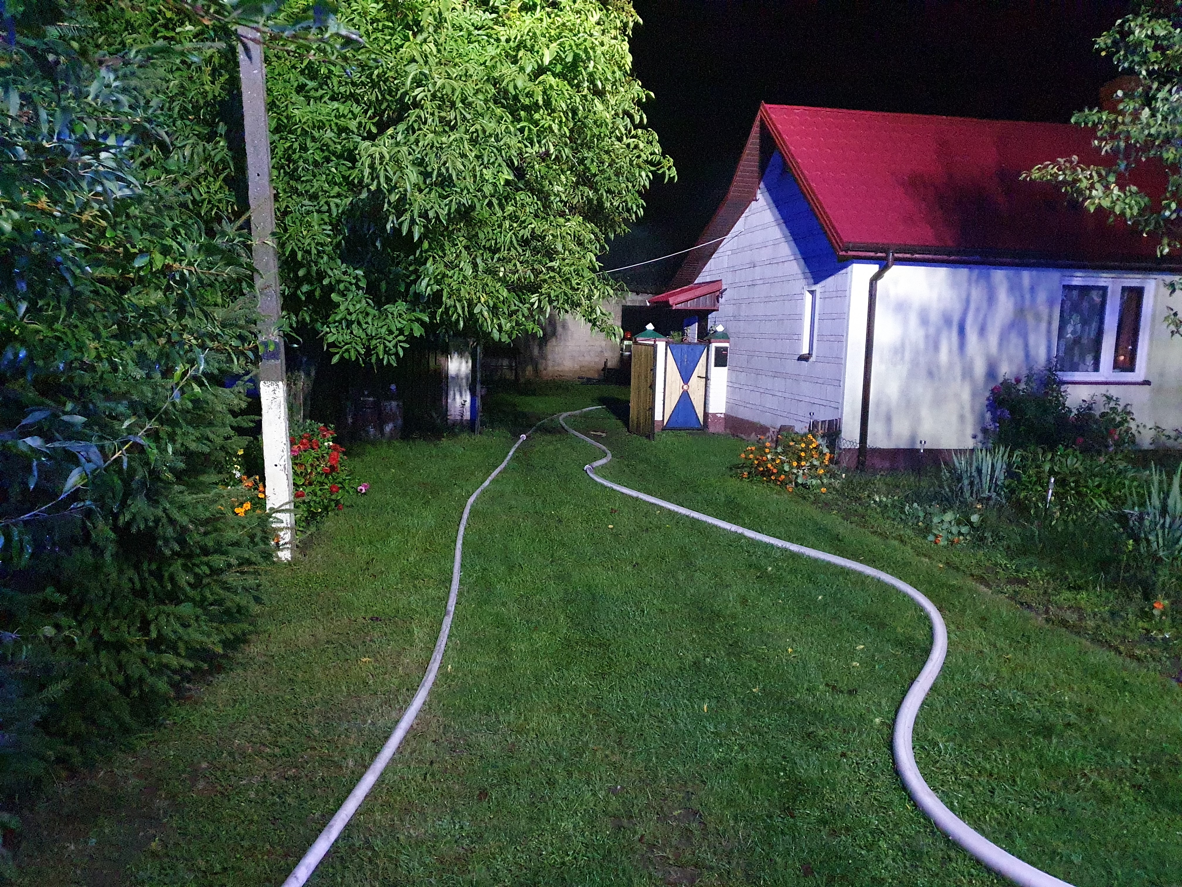 W chwili przybycia na miejsce zdarzenia zastępów straży pożarnej, ogniem objęta była cała stodoła konstrukcji murowanej kryta eternitem oraz znajdujące się wewnątrz dwa samochody osobowe (Opel Corsa, Opel Meriva) i składowane w niej materiały budowlane (styropian, deski, krokwie). Działania zastępów straży pożarnej polegały na podaniu trzech prądów wody w natarciu na palącą się więźbę dachową stodoły oraz znajdujące się w niej samochody osobowe i materiały budowlane. Dokonano niezbędnych prac rozbiórkowych konstrukcji budynku stodoły grożących zawaleniem. Nadpalone elementy stodoły wyniesiono na zewnątrz i dokładnie dogaszono. Na zakończenie działań cały budynek sprawdzono kamerą termowizyjną w celu wykluczenia ukrytych zarzewi ognia.