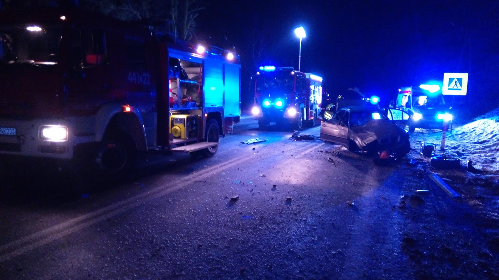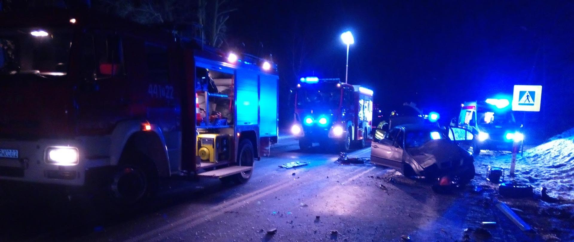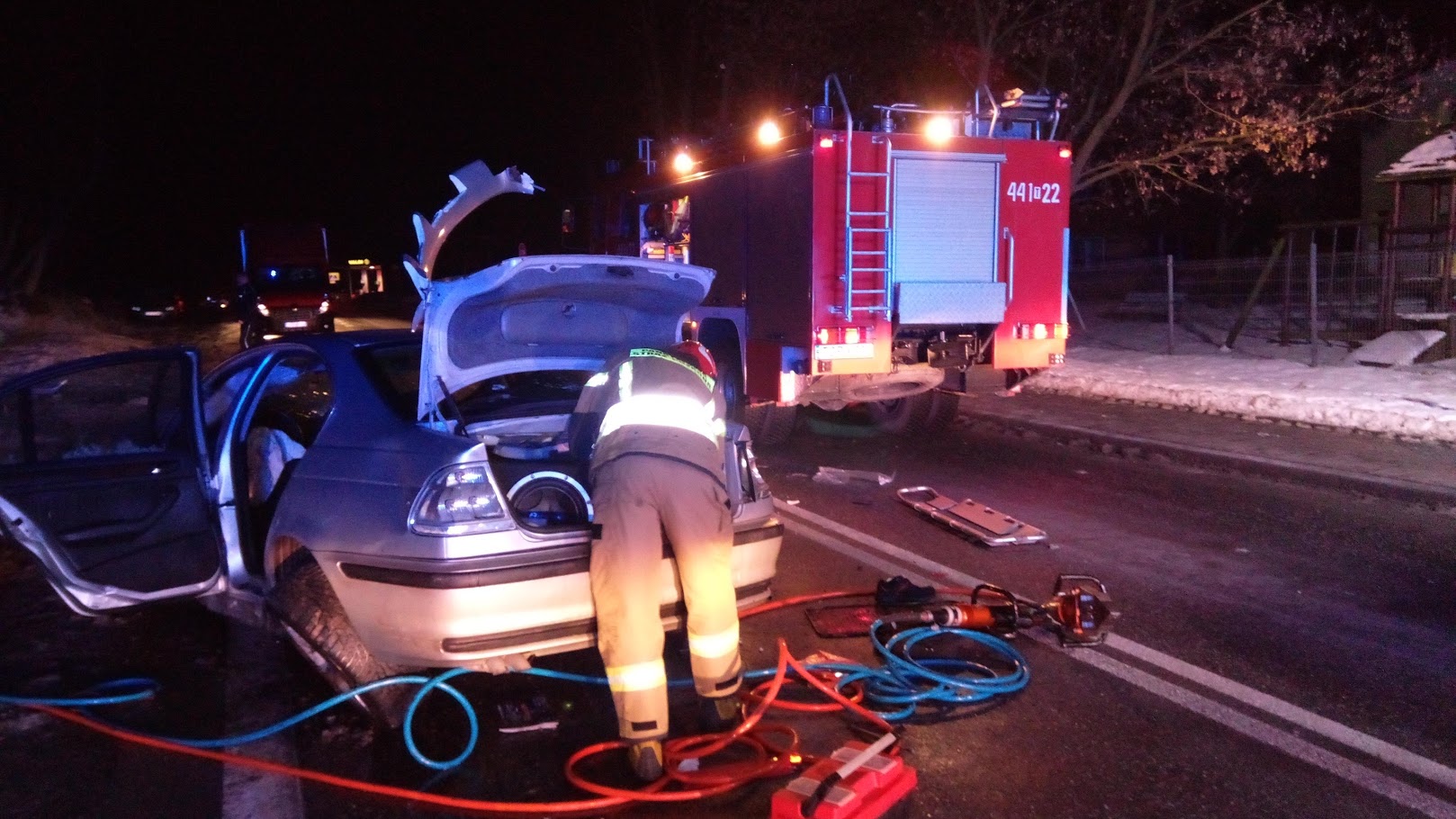 Po przybyciu na miejsce zdarzenia zastępów straży pożarnej stwierdzono, że samochód osobowy marki BMW zjechał z drogi i uderzył w ogrodzenie prywatnej posesji. Samochodem podróżowało czterech mężczyzn, jeden z nich znajdował się poza pojazdem a pozostałe trzy osoby wewnątrz. Działania JOP polegały na zabezpieczeniu miejsca zdarzenia, udzieleniu kwalifikowanej pierwszej pomocy uczestnikom zdarzenia z równoczesnym wykonaniem dostępu do poszkodowanych znajdujących się wewnątrz pojazdu przy pomocy narzędzi hydraulicznych. Wszyscy uczestnicy zdarzenia po ewakuowaniu z samochodu i przebadaniu przez obecnego na miejscu lekarza zostali zabrani przez Zespoły Ratownictwa Medycznego do szpitala. Po zakończeniu czynności dochodzeniowych prowadzonych przez Policję z jezdni usunięto plamę rozlanych płynów eksploatacyjnych i pozostałości powypadkowe.