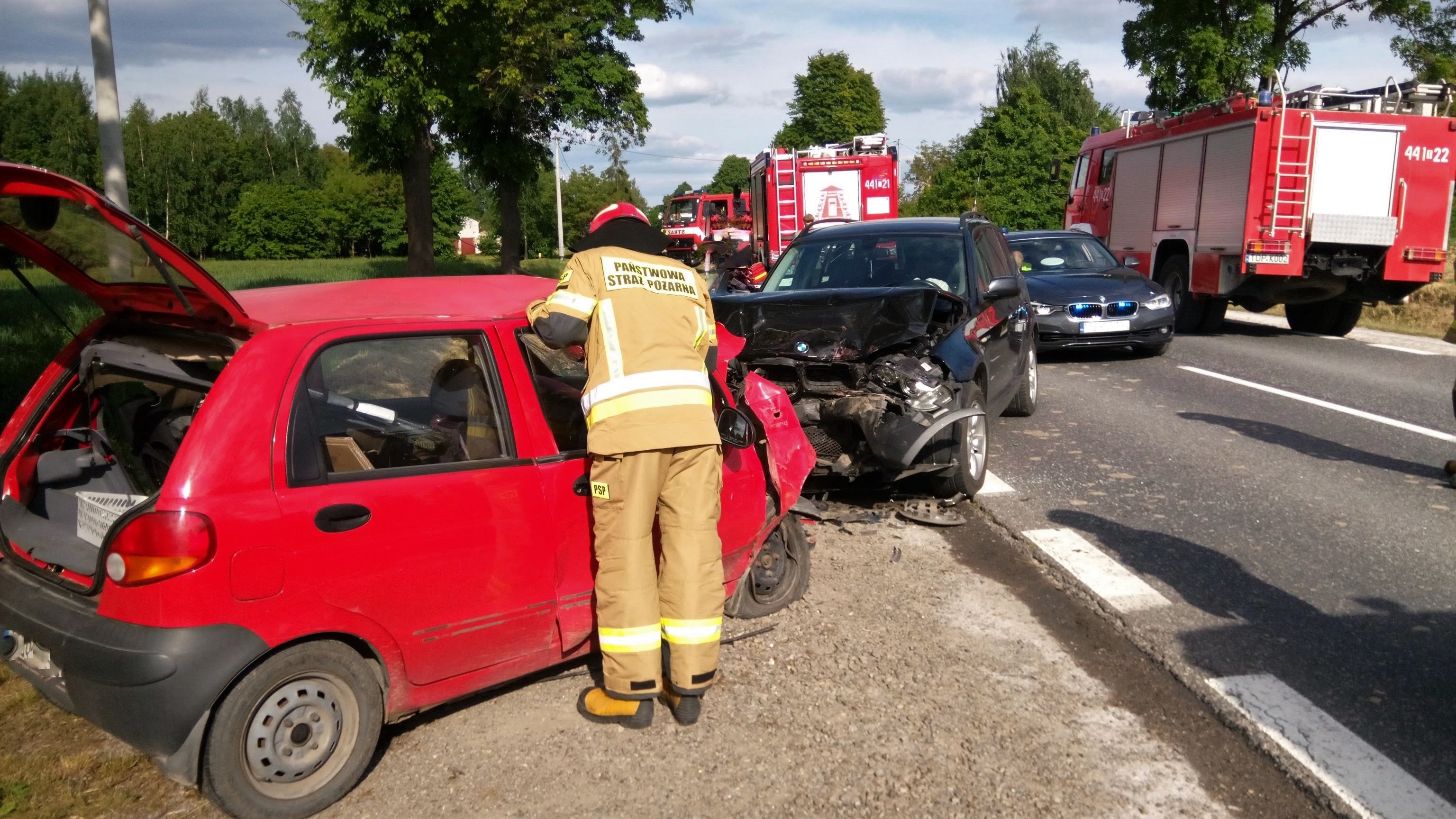 Po przyjeździe na miejsce zdarzenia zastępów straży pożarnej stwierdzono, że na odcinku DK74 w miejscowości Gierczyce gm. Wojciechowice doszło do zdarzenia drogowego, w którym uczestniczyły dwa samochody osobowe. Jeden z pojazdów znajdował się częściowo na lewej stronie jezdni oraz poboczu a drugi poza jezdnią w obrębie pasa drogowego na wjeździe do posesji prywatnej. W wyniku zdarzenia i prowadzonych działań ratowniczych ruch na drodze był całkowicie zablokowany. W chwili przybycia na miejsce zdarzenia kierowca BMW, który nie odniósł żadnych obrażeń znajdował się poza pojazdem a kierująca Daewoo kobieta z obrażeniami ciała znajdowała się przytomna, wewnątrz pojazdu. Działania zastępów straży pożarnej w pierwszej fazie polegały na zabezpieczeniu miejsca zdarzenia, odłączeniu akumulatorów w pojazdach, ustabilizowaniu pojazdu Daewoo oraz udzielaniu kwalifikowanej pierwszej pomocy medycznej osobom biorącym udział w zdarzeniu. Do kierującej samochodem Matiz w asyście ratowników ZRM wykonano dostęp poprzez wycięcie drzwi kierowcy a następnie po ułożeniu na noszach typu deska przeniesieniu jej do karetki pogotowia. Kierowca BMW po przebadaniu przez ratownika medycznego z ZRM pozostał na miejscu, natomiast kierująca z Daewoo Matiz na mocy decyzji przybyłego na miejsce zdarzenia lekarza z Lotniczego Pogotowia Ratunkowego została przetransportowana do szpitala w celu dalszej hospitalizacji.
