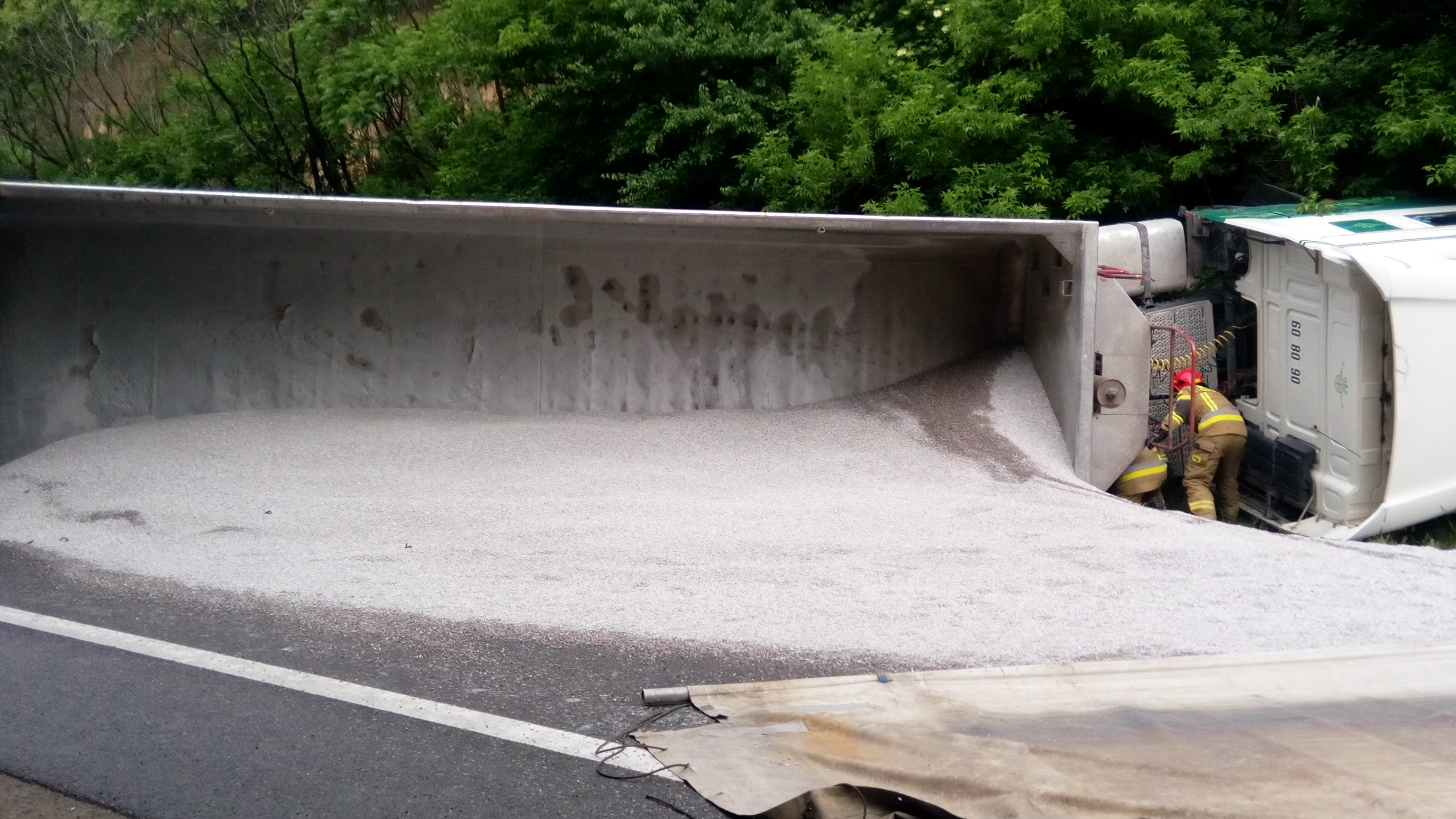 2 czerwca w godzinach porannych Stanowisko Kierowania Komendanta Powiatowego Państwowej Straży Pożarnej w Opatowie otrzymało zgłoszenie o przewróceniu się ciągnika siodłowego z naczepą na drodze krajowej numer 74.