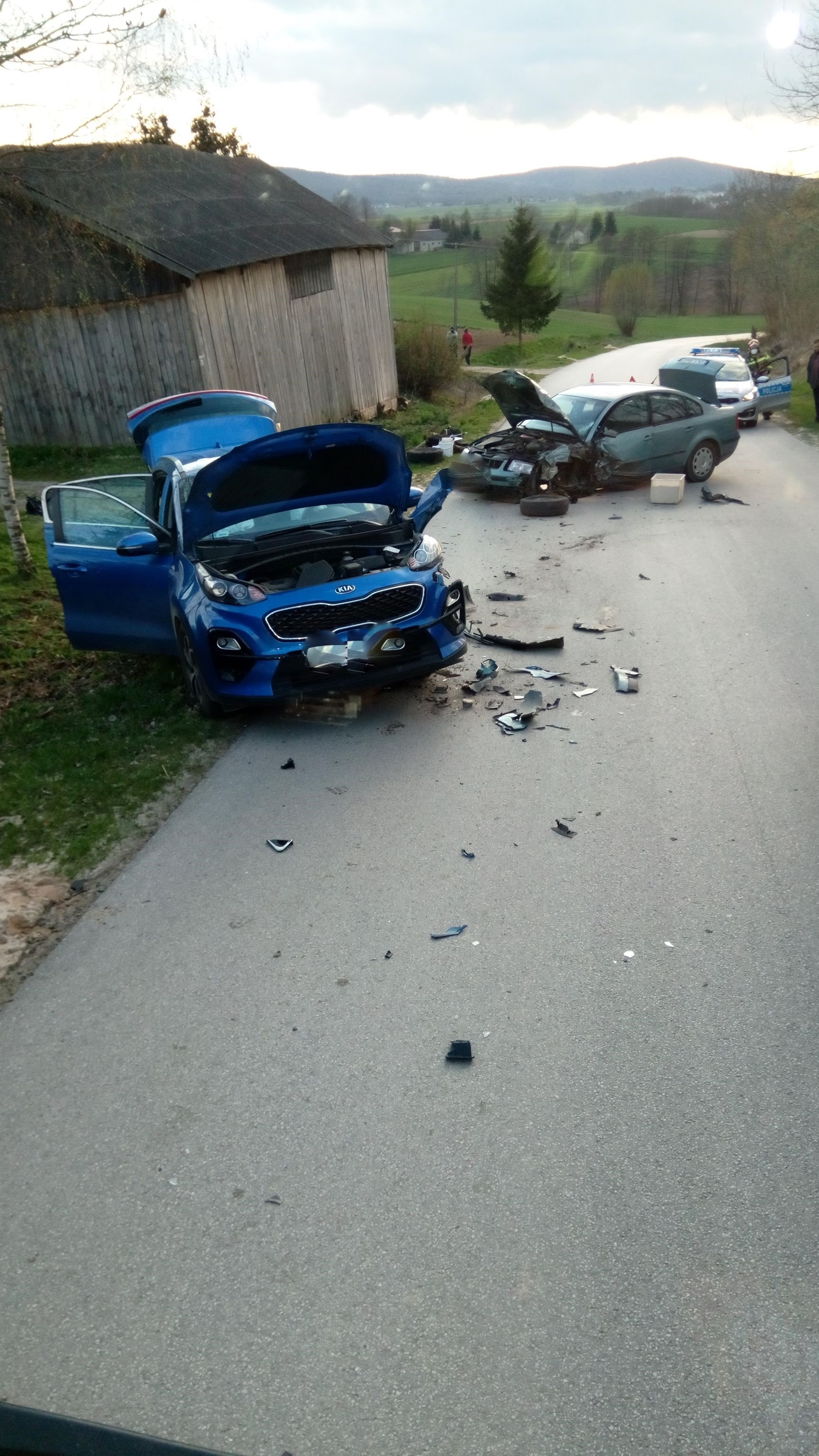 Po przyjeździe na miejsce zdarzenia zastępów straży pożarnej stwierdzono, że na drodze powiatowej w miejscowości Turskolasy doszło do zderzenia dwóch samochodów osobowych. Samochodami łącznie podróżowało sześć osób - 3 osoby dorosłe oraz 3 dzieci, wszyscy uczestnicy zdarzenie znajdowali się poza pojazdami. Pojazdy zajmowały część jednego pasa drogowego oraz pobocze, wyciekały z nich płyny eksploatacyjne. W trakcie działań zastępów straży pożarnej na miejscu zdarzenia ruch na drodze został zamknięty. Działania zastępów straży pożarnej polegały na zabezpieczeniu miejsca zdarzenia, udzieleniu kwalifikowanej pierwszej pomocy osobom poszkodowanym, odłączeniu akumulatorów w obydwu pojazdach, zakręceniu zaworu gazu LPG w samochodzie VW oraz dokonaniu sorpcji rozlanych płynów eksploatacyjnych. Po przybyciu na miejsce zdarzenia Zespołu Ratownictwa Medycznego wszystkie osoby biorące udział w zdarzeniu przekazano pod opiekę ratowników medycznych. Po przebadaniu przez ratowników medycznych dzieci wraz z rodzicami podróżujące jednym z pojazdów zostały zabrane do szpitala, a kierowca VW pozostał na miejscu zdarzenia. Dalsze działania polegały na oświetleniu terenu akcji do momentu zakończenia czynności dochodzeniowych prowadzonych przez Policję oraz uprzątnięciu pozostałości powypadkowych z jezdni.