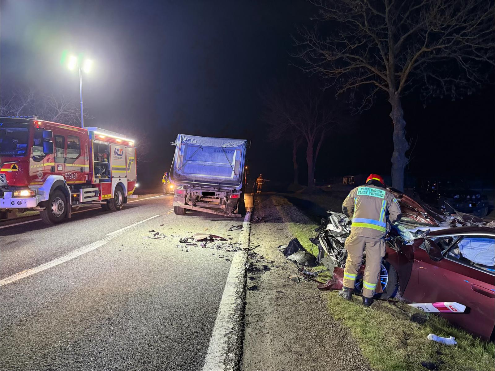 Po dojeździe na miejsce pierwszych zastępów straży pożarnej stwierdzono, że doszło do najechania samochodu osobowego na tył naczepy pojazdu ciężarowego przewożącego kruszywo.