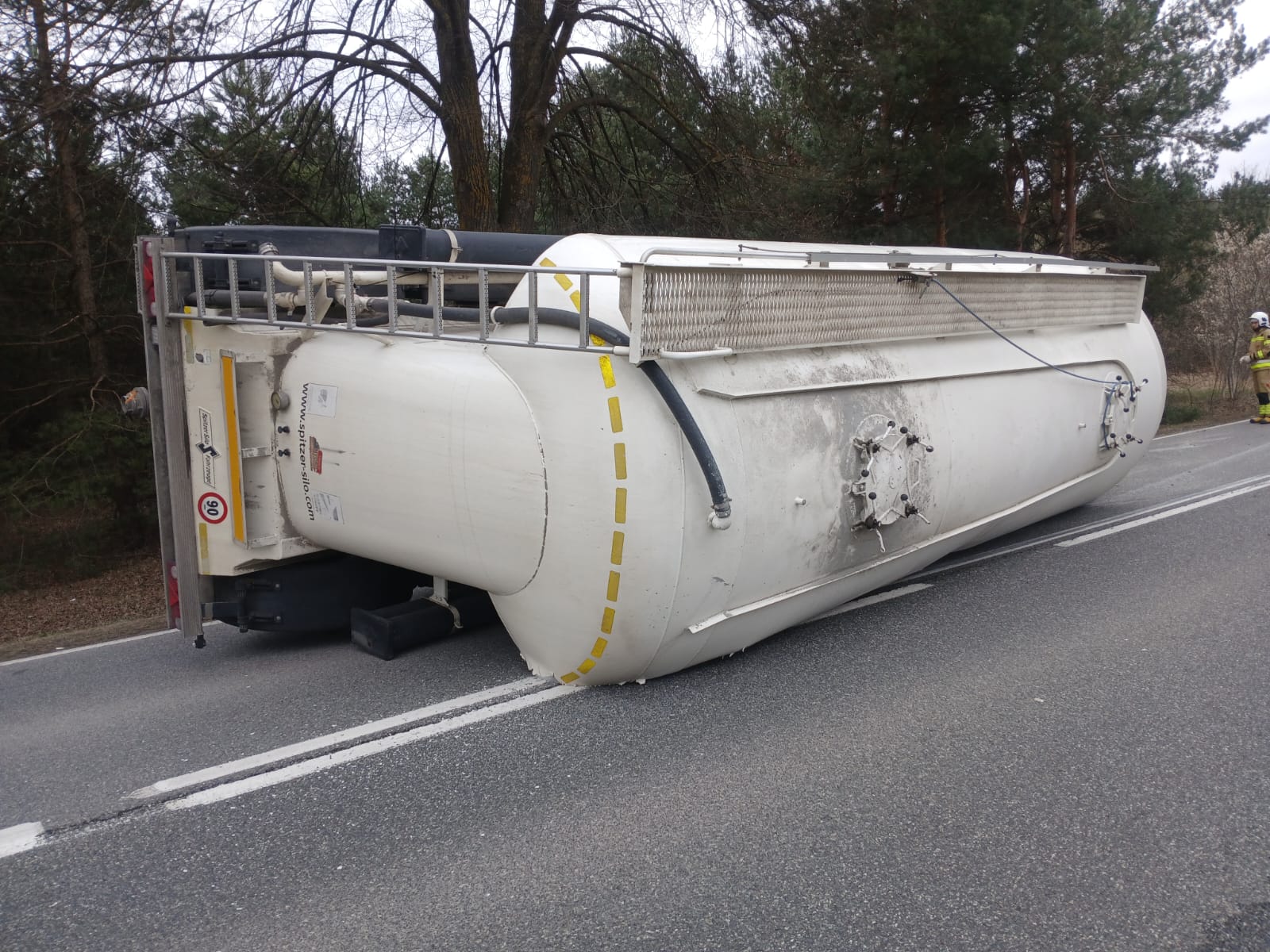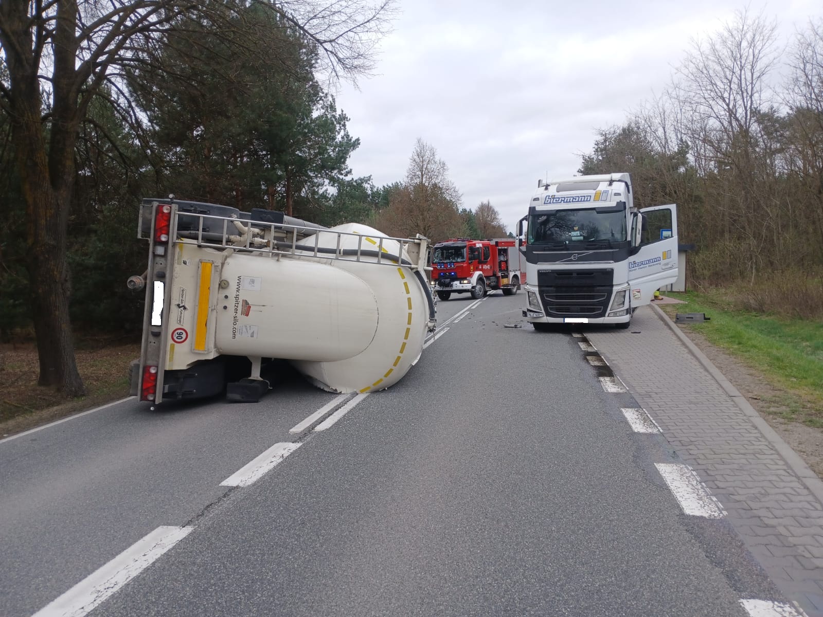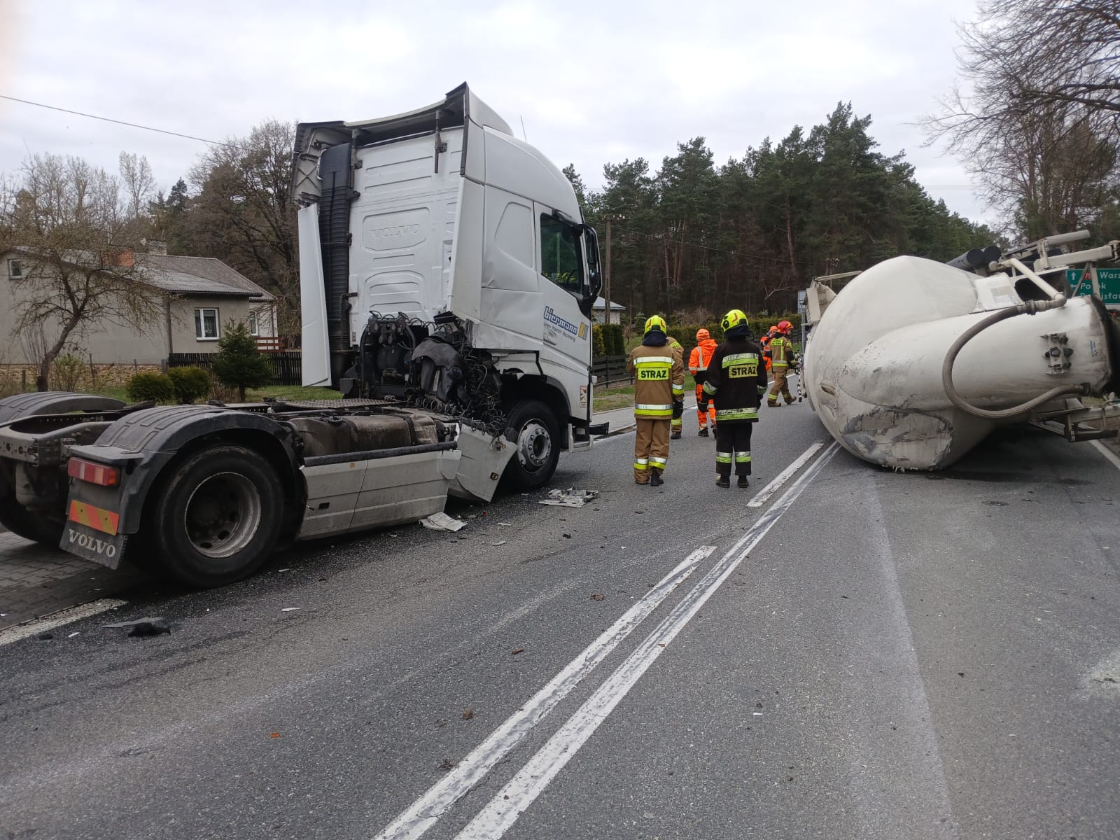 Po przybyciu na miejsce zdarzenia zastępów straży pożarnej ustalono, że doszło do rozprzęgnięcia zespołu pojazdów składającego się z ciągnika siodłowego oraz naczepy do przewozu cementu. Naczepa przewróciła się na prawy bok, co spowodowało całkowitą blokadę ruchu w obu kierunkach drogi krajowej.