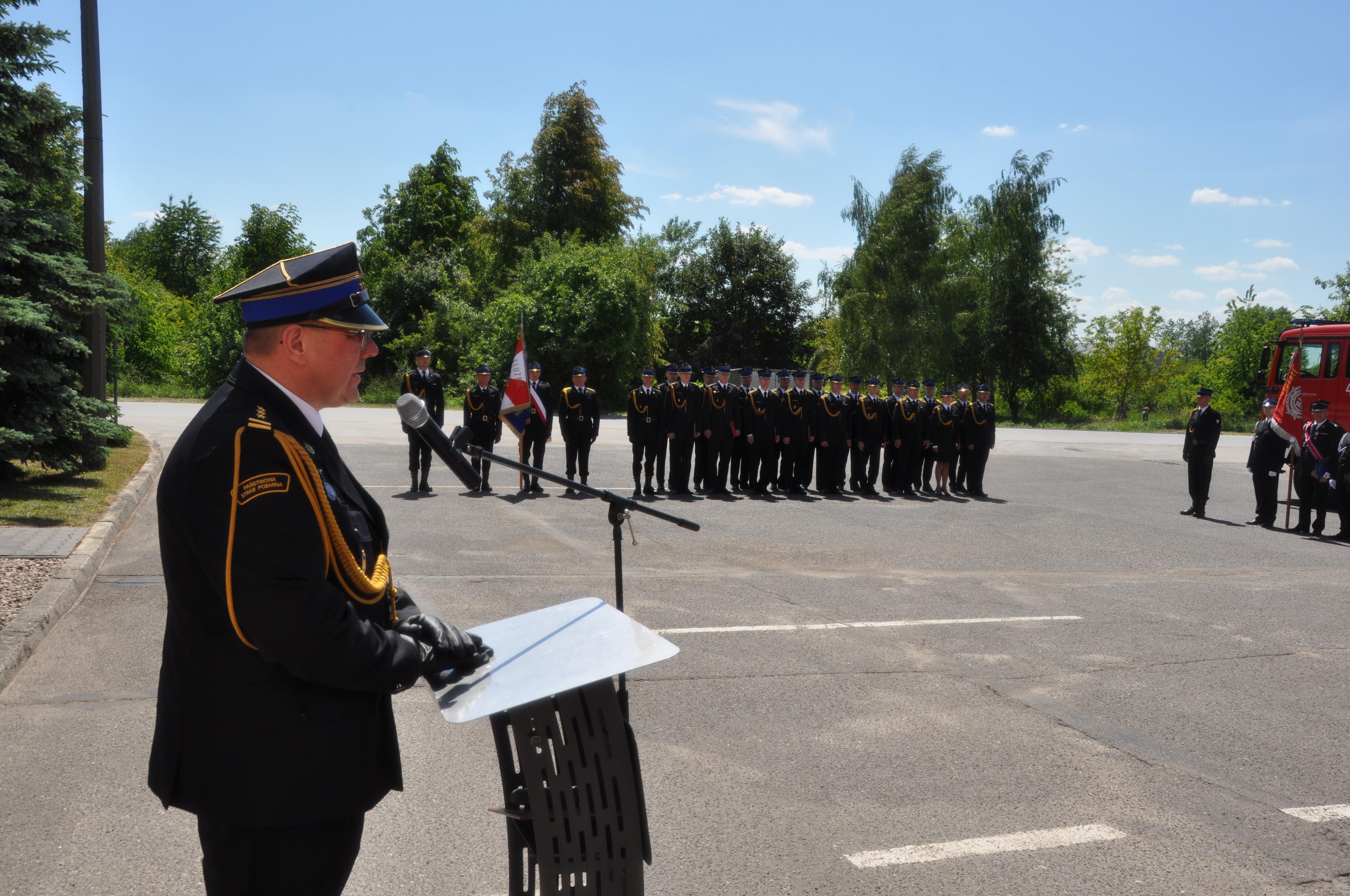 Starszy brygadier Dariusz Polański Komendant Powiatowy PSP w Opocznie przywitał zaproszonych gości podkreślając udział w tegorocznych obchodach wszystkich byłych komendantów rejonowych i powiatowych PSP w Opocznie. W swoim wystąpieniu podziękował wszystkim funkcjonariuszom za codzienną pracę, władzom samorządowym i podmiotom współpracującym za zaangażowanie w rozwój bezpieczeństwa przeciwpożarowego na terenie powiatu opoczyńskiego. Końcowym aktem uroczystości było odczytanie listu okolicznościowego od Posła na Sejm Rzeczypospolitej Polskiej Adriana Witczaka.