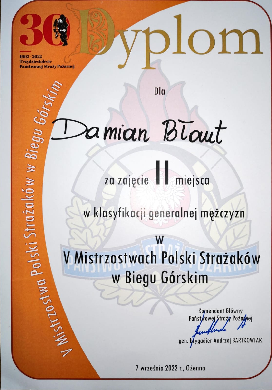 7 września w Ożennej pow. jasielski woj. podkarpackie odbyły się V Mistrzostwa Polski Strażaków w Biegu Górskim. W biegu wystartowało 104 funkcjonariuszy Państwowej Straży Pożarnej, a pośród nich strażak z ostródzkiej Komendy Powiatowej PSP asp. Damian Błaut. Zawodnicy mieli do pokonania dystans 9200 metrów w trudnym górzystym terenie. Walka o mistrzostwo była zacięta do samego końca. Zwycięzca osiągnął czas 32 minuty i 6 sekund, asp. Damian Błaut ukończył bieg z czasem 32 minuty i 11 sekund. Jak zapowiedział świeżo upieczony Wicemistrz Polski Strażaków na kolejnych zawodach będzie atakował pierwszą pozycję.