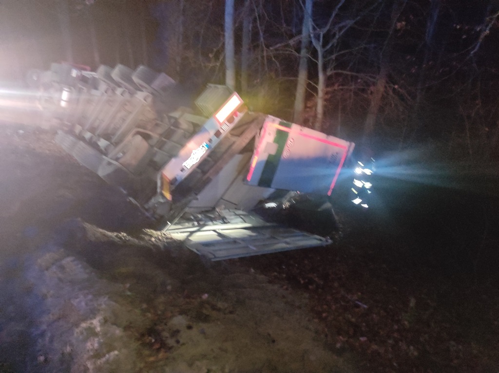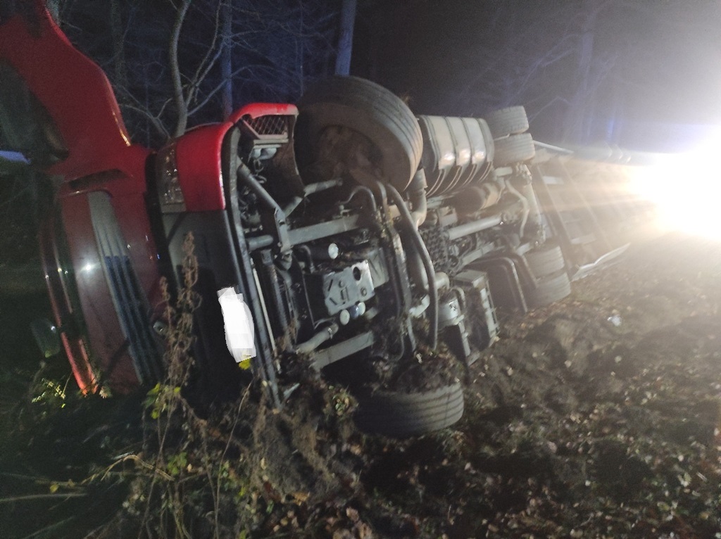 Około godziny 17:30 15 listopada na drodze krajowej nr 15 tuż przed Ostródą ciągnik siodłowy z naczepą, na łuku drogi zjechał z jezdni i wpadł do rowu. Zestaw ciężarowy przewoził ponad dwudziestotonowy ładunek płyt wiórowych. Pojazdem podróżował prowadzący go mężczyzna, który samodzielnie zdołał się wydostać z szoferki. Do akcji ratowniczej z ostródzkiej JRG wyjechał samochód ratowniczo-gaśniczy oraz samochód specjalny ratownictwa technicznego. Na miejscu wypadku strażacy zastali zestaw ciężarowy, który leżał na boku kilka metrów poniżej poziomu jezdni. Obok pojazdu siedział jego kierowca. Mężczyzna był przytomny z ogólnymi potłuczeniami. Został zabrany przez ratowników Państwowego Ratownictwa Medycznego do ambulansu na badania. Strażacy zabezpieczyli miejsce zdarzenia, odłączyli zasilanie elektryczne w zestawie ciężarowym. Następnie sprawdzili, czy nie ma wycieków płynów eksploatacyjnych z ciągnika siodłowego. Sprawdzono również teren wokół przewróconej ciężarówki, na ewentualność zderzenia z innym pojazdem. Policjanci poddali kierowcę badaniu trzeźwości. Wynik niestety był pozytywny. Wykazał kilka promili alkoholu w wydychanym powietrzu. Ostatecznie mężczyzna został zabrany do szpitala. Droga krajowa nr 15 w obrębie wypadku była zablokowana blisko godzinę.
