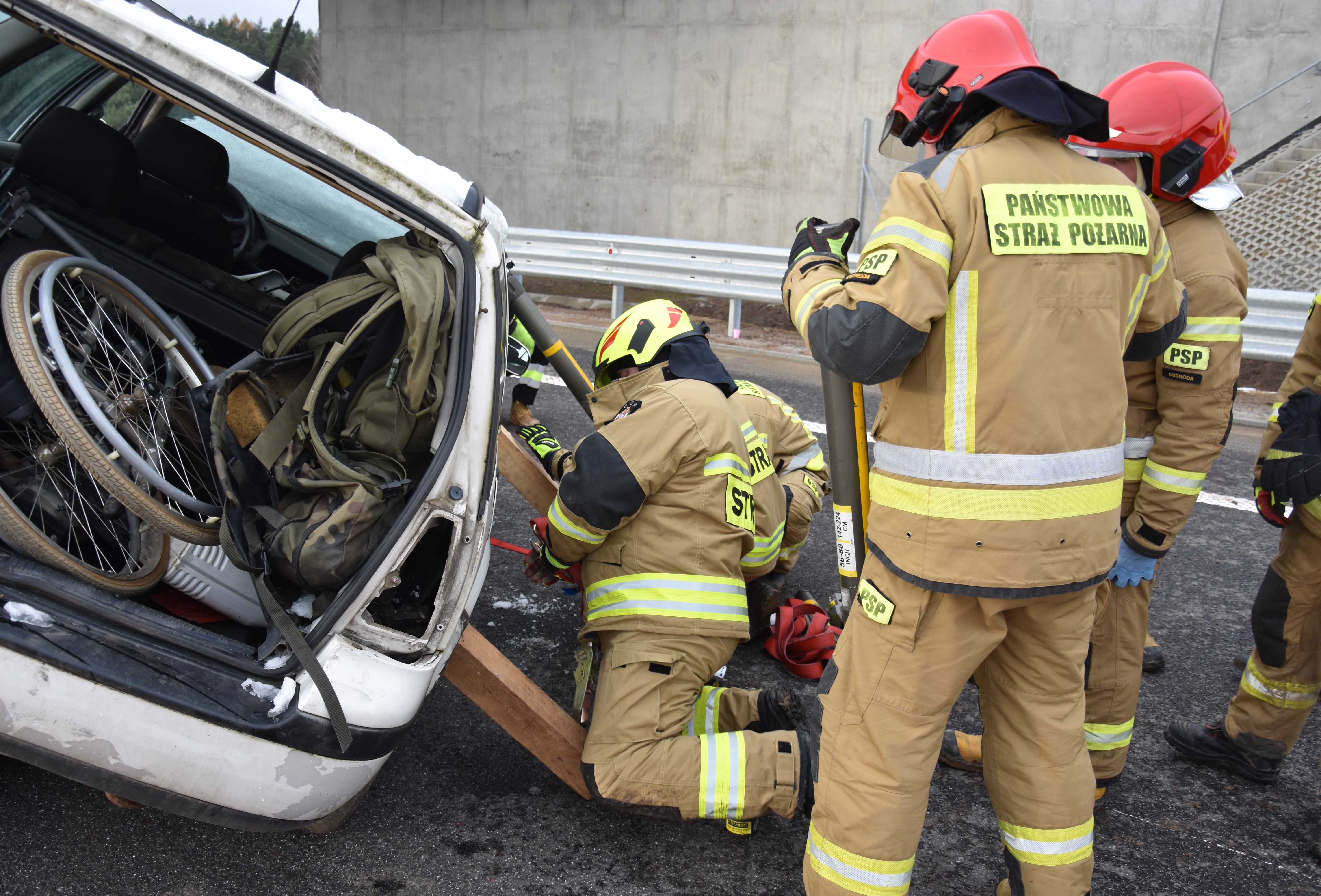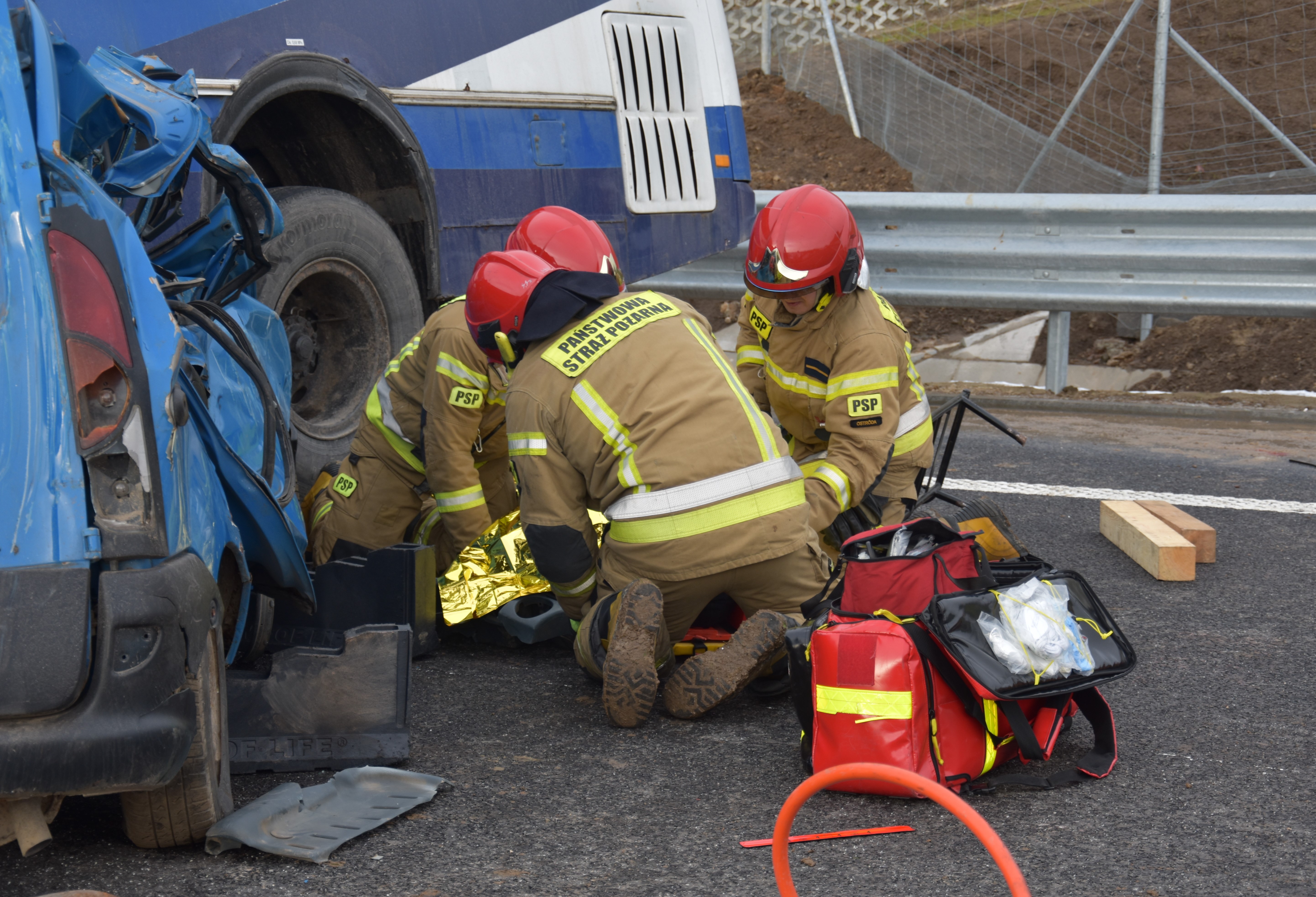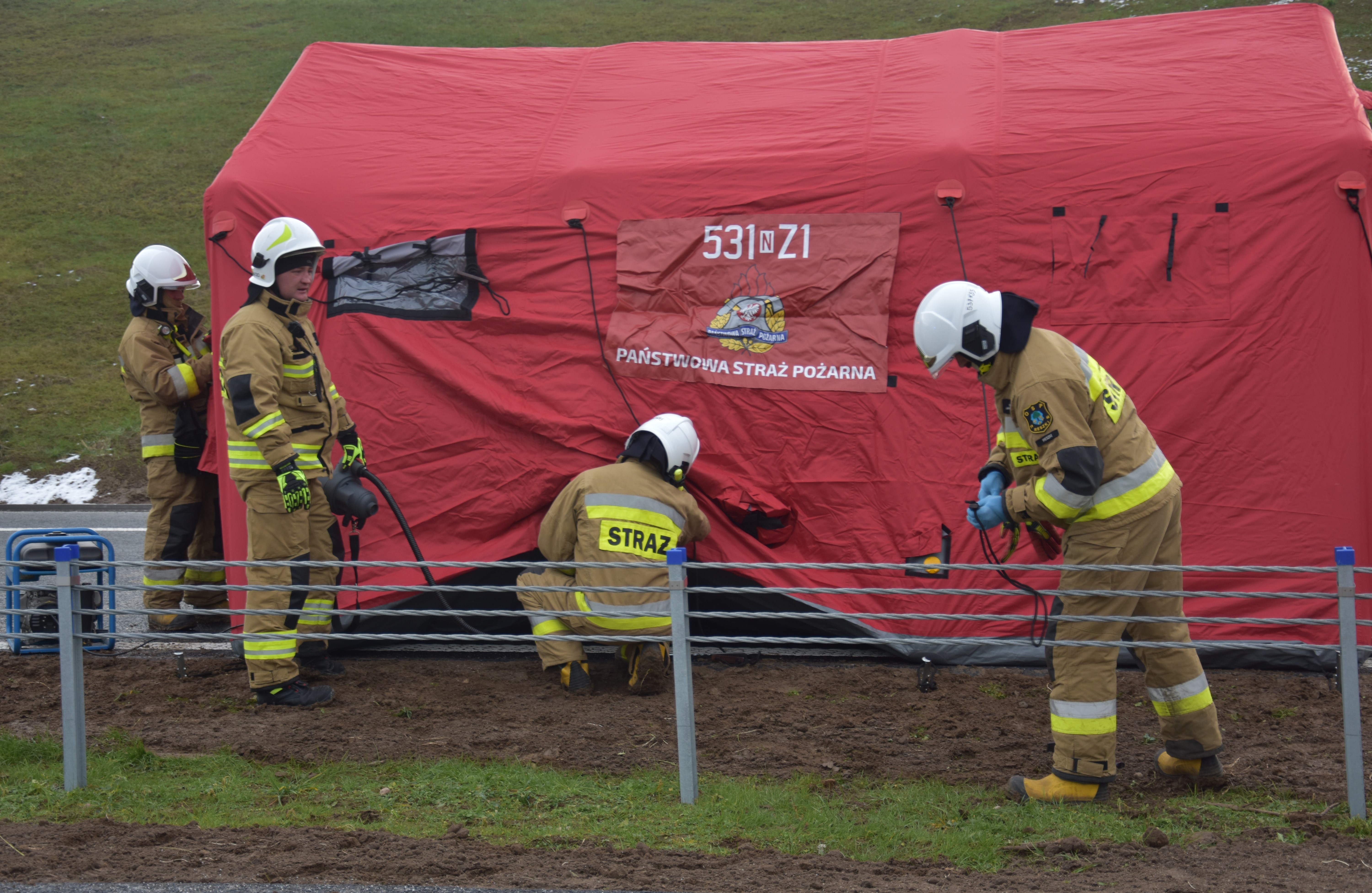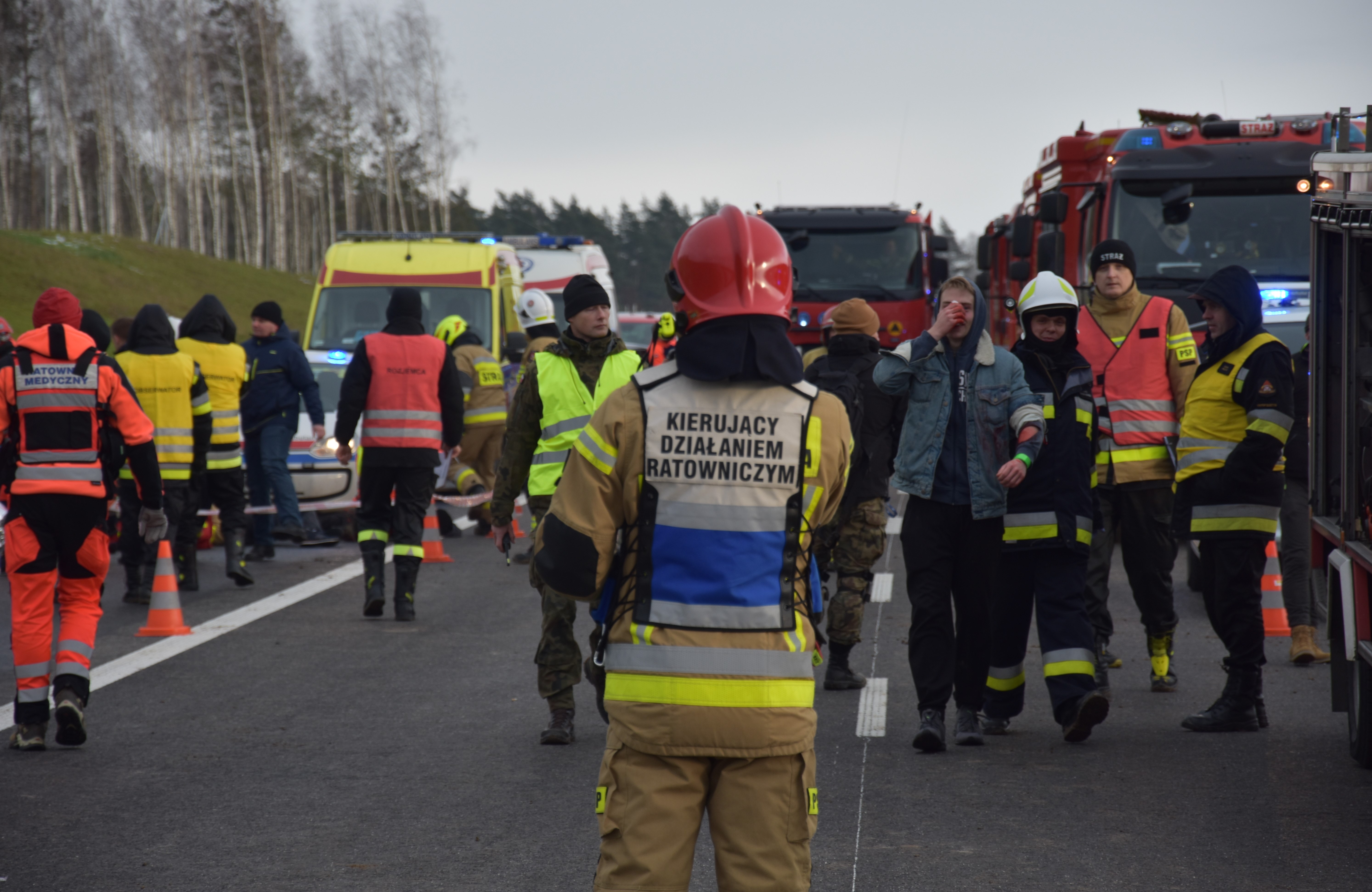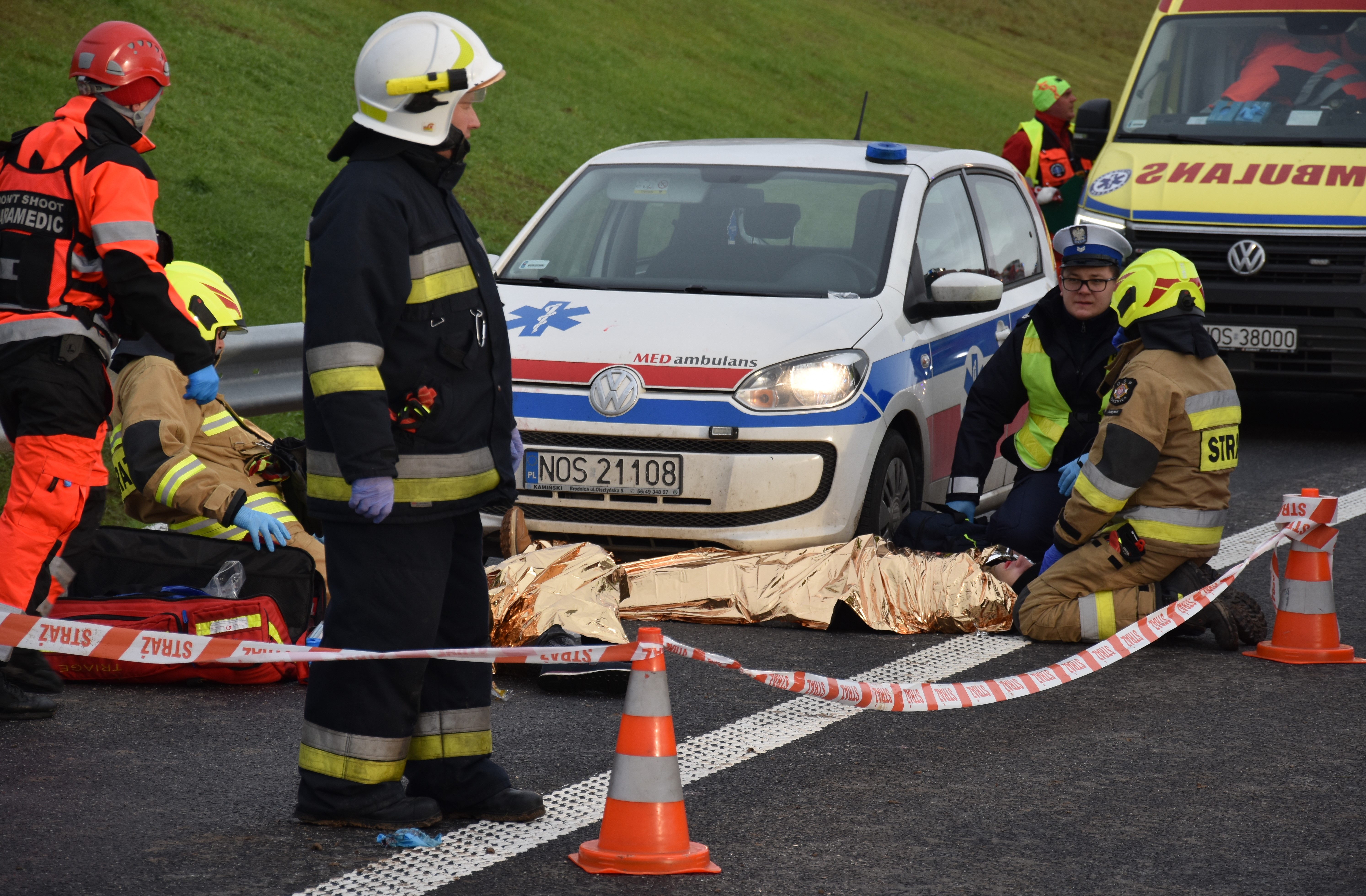 Ósmego grudnia na nowym odcinku drogi ekspresowej S5 odbyły się ćwiczenia współdziałania służb ratowniczych organizowane przez Komendę Powiatową PSP w Ostródzie we współpracy ze Starostwem Powiatowym oraz Gminą Wiejską Ostróda. Scenariusz ćwiczeń zakładał pozorowany wypadek z udziałem autobusu oraz trzech samochodów osobowych. W wyniku tego zdarzenia obrażeń doznało 27 osób. Zdarzenie zostało zgłoszone telefonicznie przez osobę postronną podróżująca nową drogą ekspresową. Dyżurny Stanowiska Kierowania Komendanta Powiatowego PSP w Ostródzie zadysponował na miejsce zdarzenia samochody z jednostki ratowniczo-gaśniczej w Ostródzie i Morągu oraz Ochotniczych Straży Pożarnych w: Ostródzie, Samborowie, Reszkach, Smykówku i Turznicy. Na miejsce akcji wyjechały także dwa patrole policji oraz trzy zespoły ratownictwa medycznego. Tą samą drogą przemieszczał się pododdział żołnierzy Wojsk Obrony Terytorialnej z Morąga. Dowódca WOT zaoferował służbom ratowniczym pomoc. Kierujący działaniami ratowniczymi mł. bryg. Marcin Wiśniewski po rozpoznaniu sytuacji przydzielił zadania zastępom pożarniczym i służbom współdziałającym. Wypadek miał charakter zdarzenia masowego, to oznacza, że występował deficyt ratowników względem osób poszkodowanych. Dowódca akcji zażądał zadysponowania kolejnych sił i środków. Działania ratownicze prowadzone były wielopłaszczyznowo. Niezbędne było przeprowadzenie przez ratowników medycznych procedury „triage”, która ma na celu możliwie najszybszą ocenę stanu poszkodowanych i nadanie im priorytetu ratowniczego w zależności od obrażeń. Na miejsce wypadku dostarczone zostały namioty pneumatyczne wraz z łóżkami polowymi, które stanowiły swoisty „szpital polowy”, czyli miejsce pracy ratowników medycznych, gdzie udzielano pierwszej pomocy i podejmowano decyzje o dalszym transporcie poszkodowanych do placówek medycznych. W dalszej fazie dowodzenie akcją przejął Komendant Powiatowy PSP w Ostródzie mł. bryg. Łukasz Jasiński, który w porozumieniu z przedstawicielami Powiatowego Zarządzania Kryzysowego polecił zorganizować dodatkowe miejsce schronienia dla poszkodowanych w szkole podstawowej w Samborowie. Dodatkowo zobligował żołnierzy WOT do rozstawienia zadysponowanych łóżek polowych oraz polecił przeszukać okolice miejsca zdarzenia w celu odnalezienia ewentualnych osób poszkodowanych, które mogły się oddalić w wyniku doznanego szoku. Ćwiczenia „Wypadek 2022” miały charakter zgrywający pracę służb ratowniczych w naszym powiecie. Ponadto pozwoliły uczestnikom na bliższe poznanie specyfiki zagrożeń w ruchu drogowym, w szczególności na trasach szybkiego ruchu. Dzięki takim symulowanym zdarzeniom wypracowywane są metody udoskonalające współpracę podmiotów przy realnych zdarzeniach. Ćwiczenia odbyły się dzięki uprzejmości Generalnej Dyrekcji Dróg Krajowych i Autostrad, generalnemu wykonawcy budowy odcinka drogi firmie „Budimex” oraz firmie "Stalzłom", która udostępniła pojazdy użyte do pozoracji wypadku.