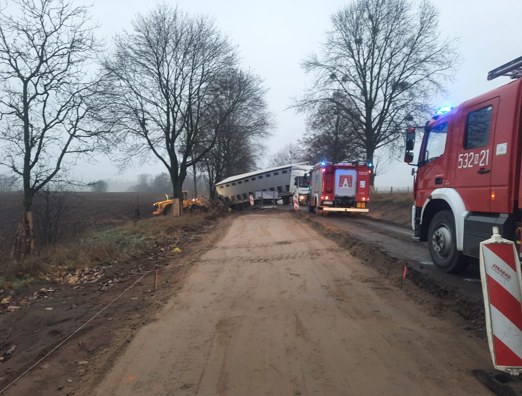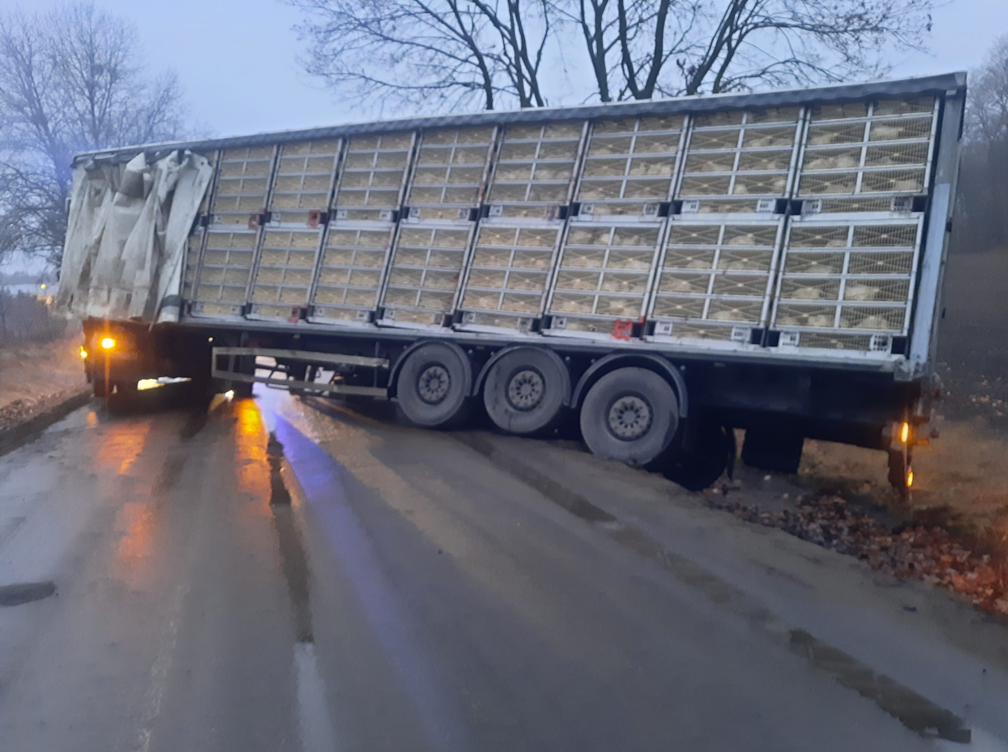 Natomiast o godzinie 6:25 wpłynęło zgłoszenie o samochodzie ciężarowym, który wypadł z drogi w miejscowości Zawroty. Na miejsce udały się 2 zastępy z JRG Morąg oraz zastęp z JRG Ostróda w tym samochód ratownictwa drogowego "Rotator" z dźwigiem. Część naczepy samochodu przewożącego zwierzęta drobiowe wystawała poza pas jezdni, co groziło przewróceniem całego pojazdu. Działania związane z postawieniem pojazdu na pas jezdni zobowiązał się wykonać użytkownik pojazdu, który w tym celu wykorzystał koparkę wraz z operatorem. Pojazd powrócił na drogę bez uszczerbku dla przewożonych zwierząt.