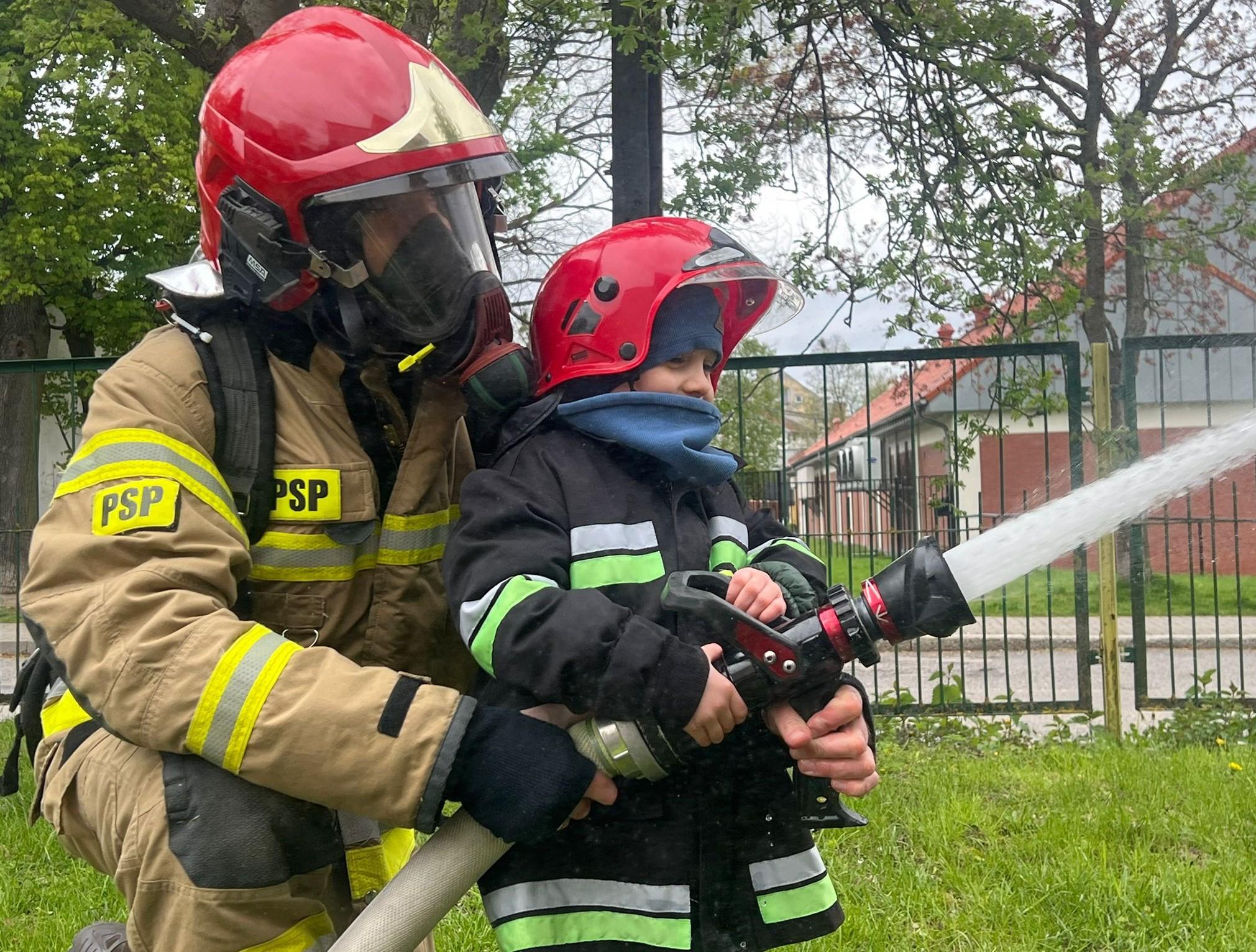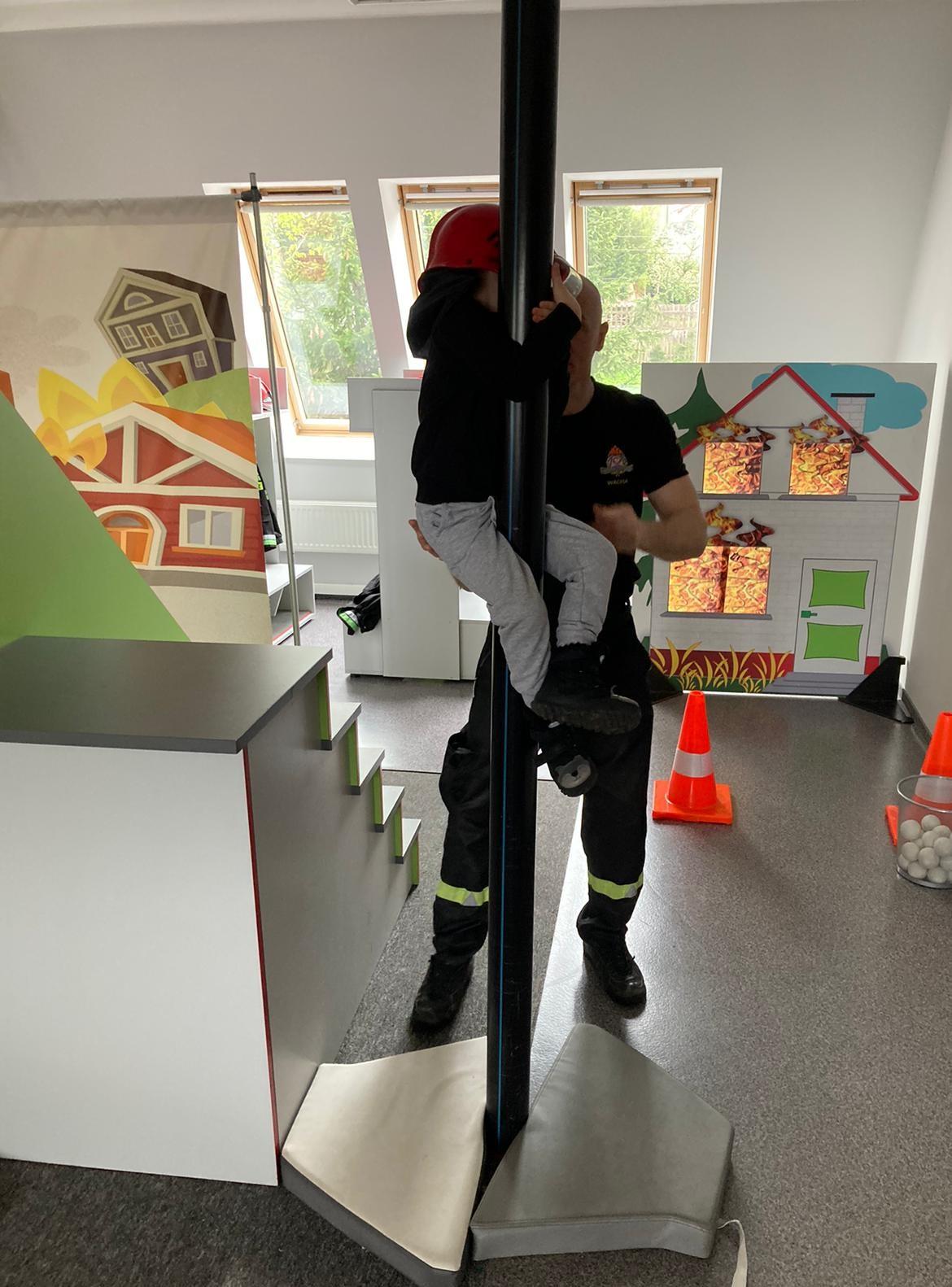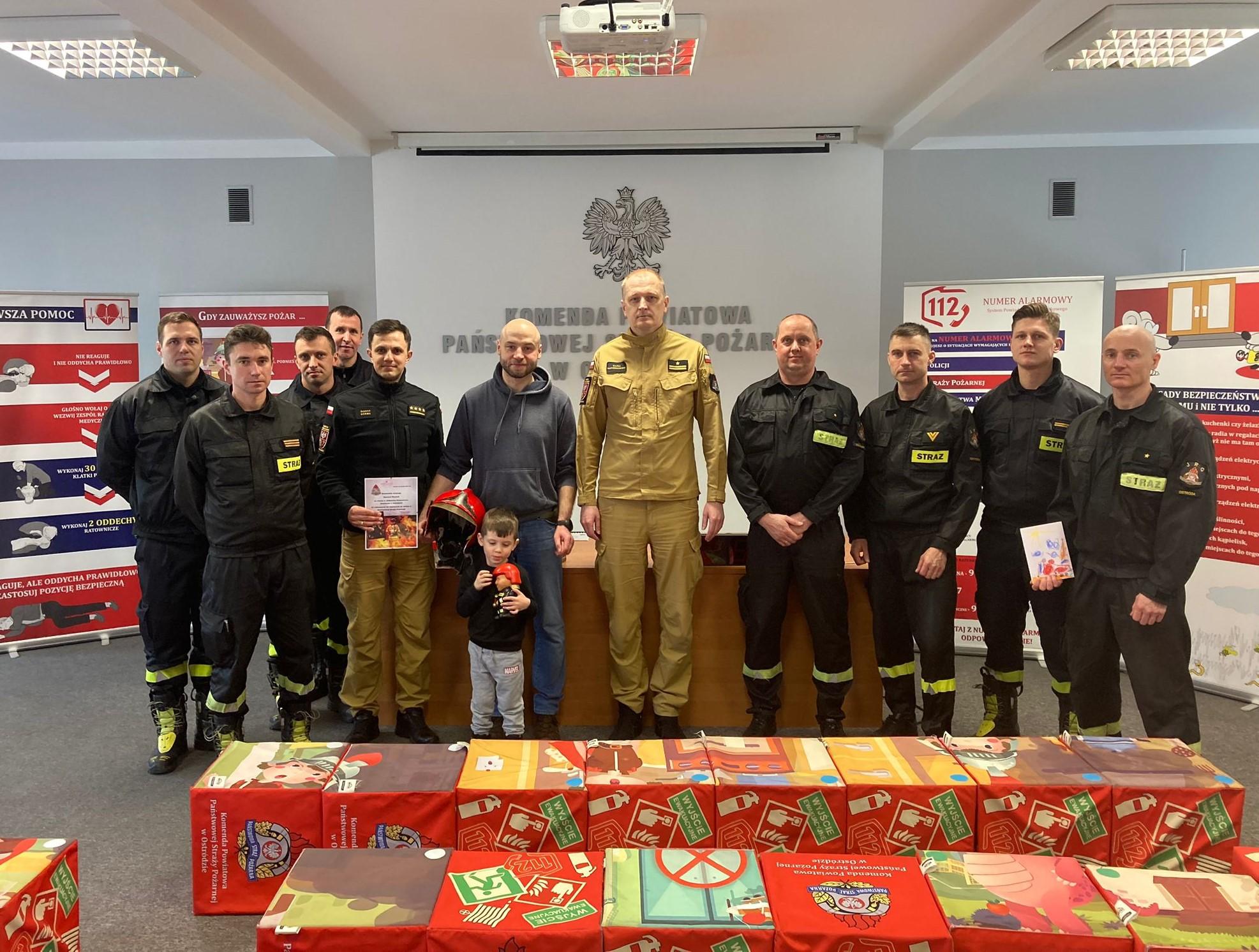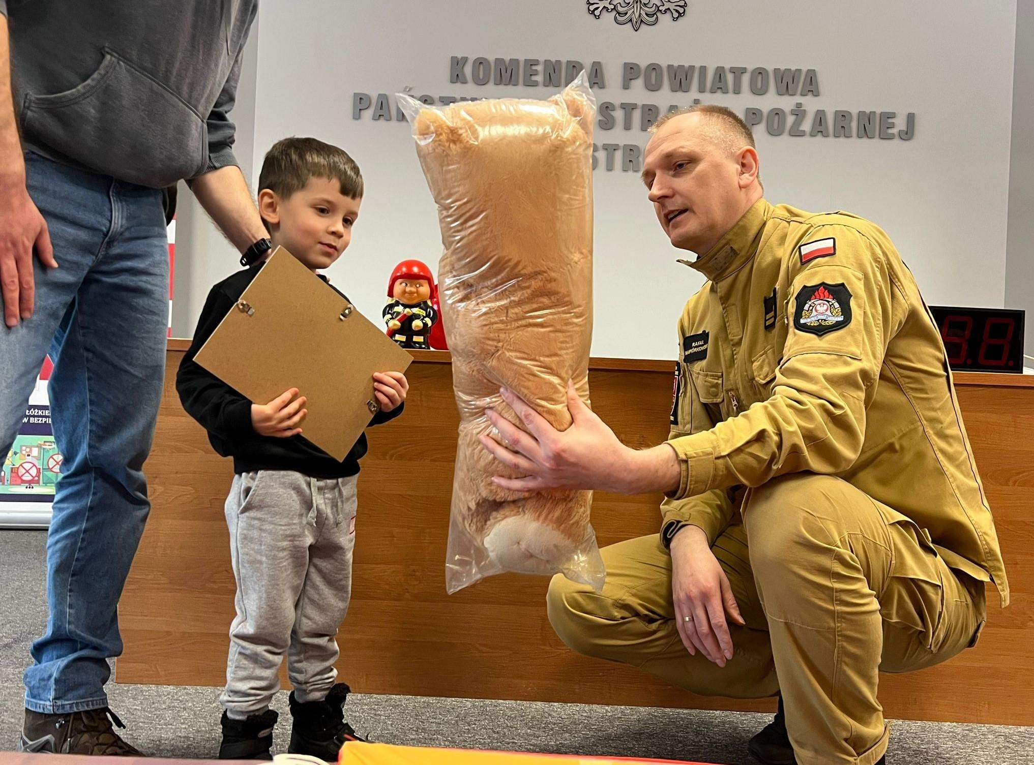 Na koniec wizyty Komendant Powiatowy PSP w Ostródzie mł. bryg. Rafał Napiórkowski wręczył chłopcu symboliczne upominki i zaprosił do służby w PSP już za kilkanaście lat.