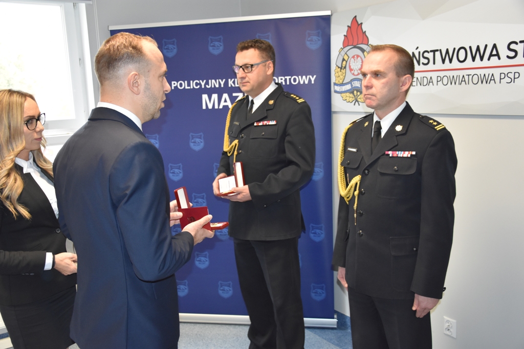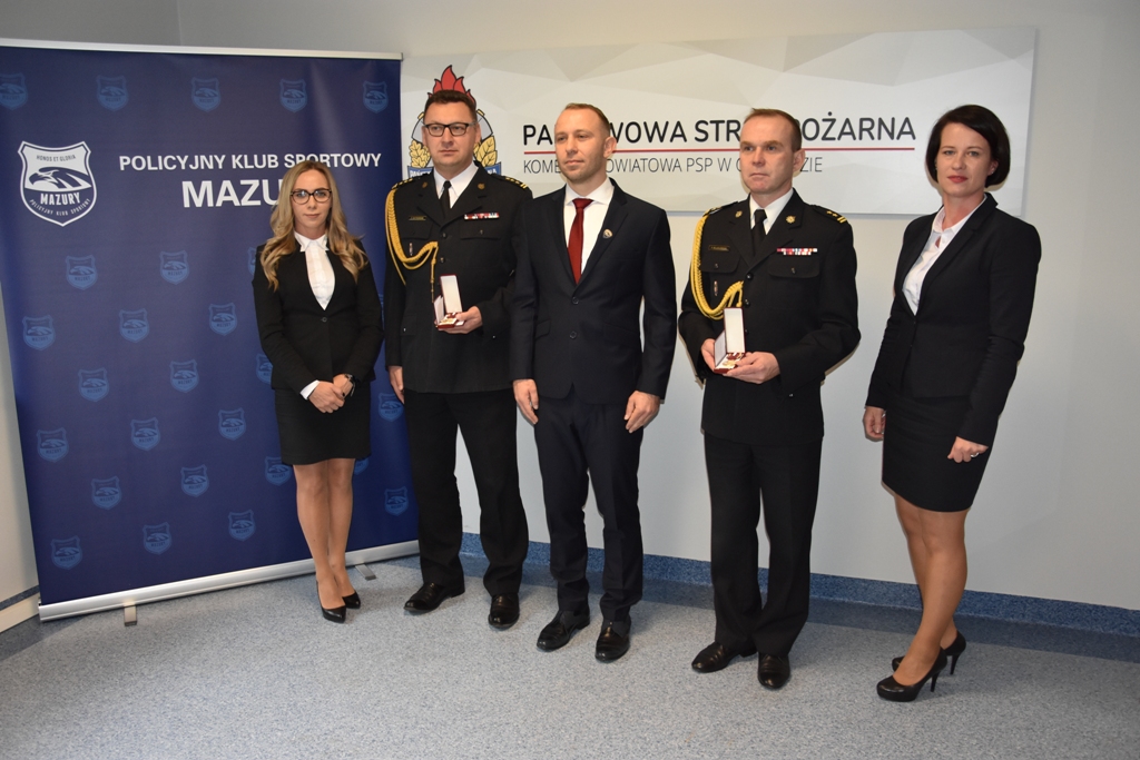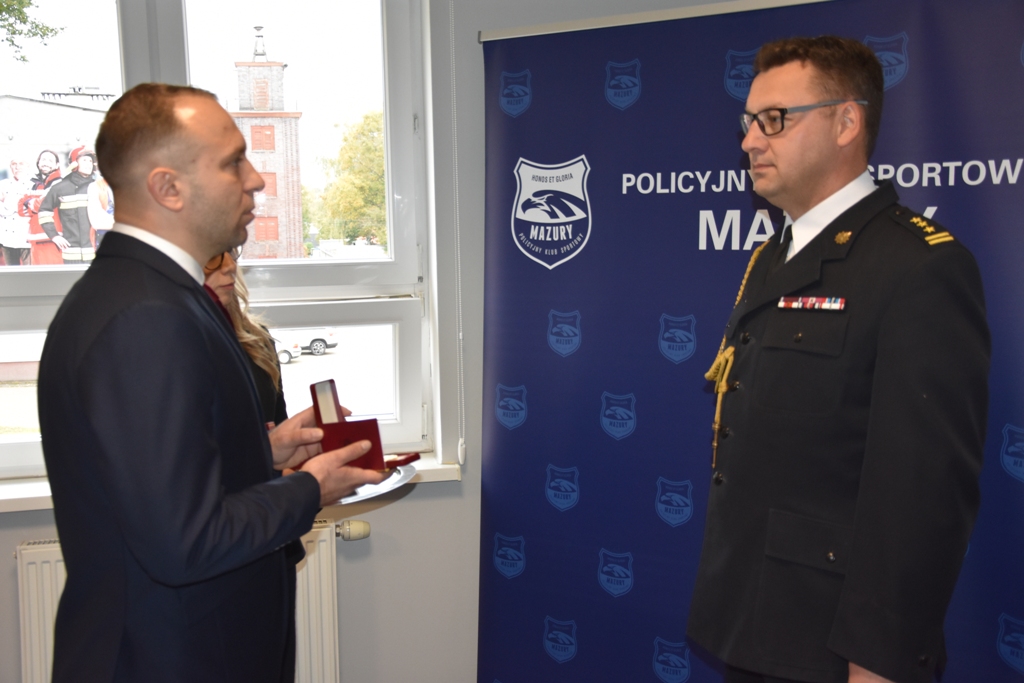 W czwartek 14 października, w siedzibie ostródzkiej Komendy Powiatowej Państwowej Straży Pożarnej odbyła się uroczystość wręczenia medali. Policyjny Klub Sportowy „Mazury” odznaczył Złotym Medalem Zasługi PKS „Mazury” st. bryg. Tomasza Ostrowskiego Komendanta Powiatowego PSP w Ostródzie oraz iławskiego Komendanta Powiatowego PSP bryg. Piotra Wlazłowskiego. Wręczając odznaczenia Prezes Policyjnego Klubu Sportowego „Mazury” Mateusz Dobroński, podkreślił, jak ważne jest dbanie o kulturę fizyczną w służbach, które służą społeczeństwu. Wskazał, że Komendanci systematycznie propagują działalność sportową i szeroko rozumianą aktywność fizyczną, nawet w czasie pandemii SarsCov 2 w regionie Warmii i Mazur.