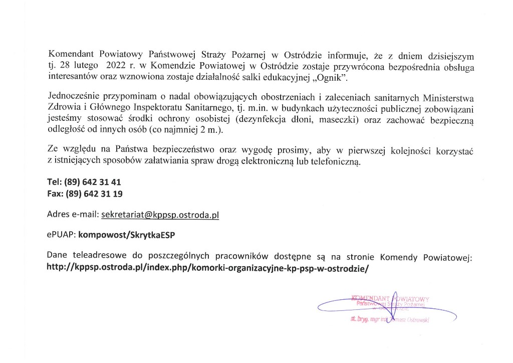 Komendant Powiatowy Państwowej Straży Pożarnej w Ostródzie informuje, że z dniem 28 lutego 2022 roku w Komendzie Powiatowej PSP w Ostródzie zostaje przywrócona bezpośrednia obsługa interesantów oraz wznowiona zostaje działalność sali edukacyjnej „Ognik”.