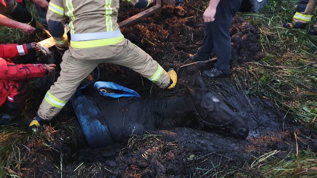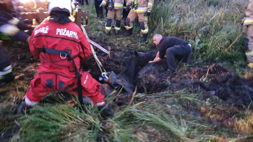 W czwartek 23 września około godziny osiemnastej wpłynęło zgłoszenie do stanowiska kierowania komendanta powiatowego w Ostródzie, z informacją o uwięzionym koniu na podmokłym torfowisku, w Miłomłynie. Do akcji ratowniczej z ostródzkiej JRG wyjechał samochód ratowniczo-gaśniczy oraz dwa pojazdy pożarnicze z Ochotniczej Straży Pożarnej w Miłomłynie. Strażacy na miejscu zdarzenia zastali uwięzionego konia w wypełnionym błotem torfowym rowie. Zwierzę nie było w stanie samodzielnie się wydostać z grzęzawiska. Strażacy odkopali częściowo torf, co pozwoliło umieścić zawiesia pasowe pod koniem. Przy pomocy traktora z wysięgnikiem, koń został powoli wyciągnięty z błotnej pułapki. Gdy został przeniesiony na stabilny grunt, po chwili o własnych siłach spokojnie poszedł do stajni.