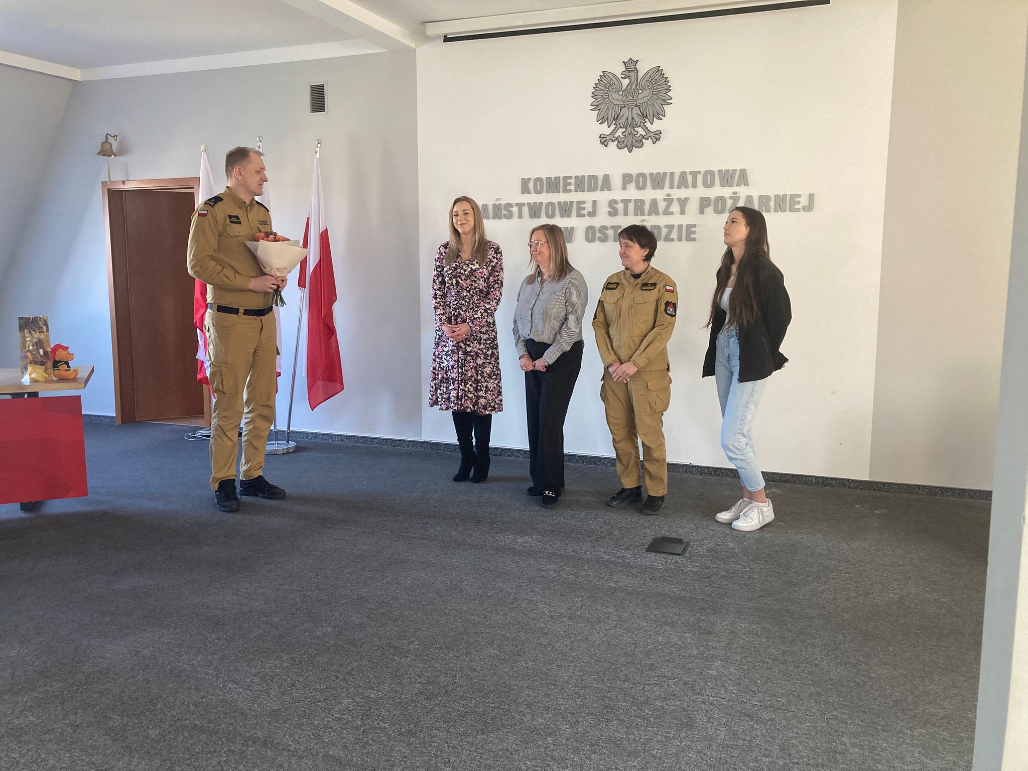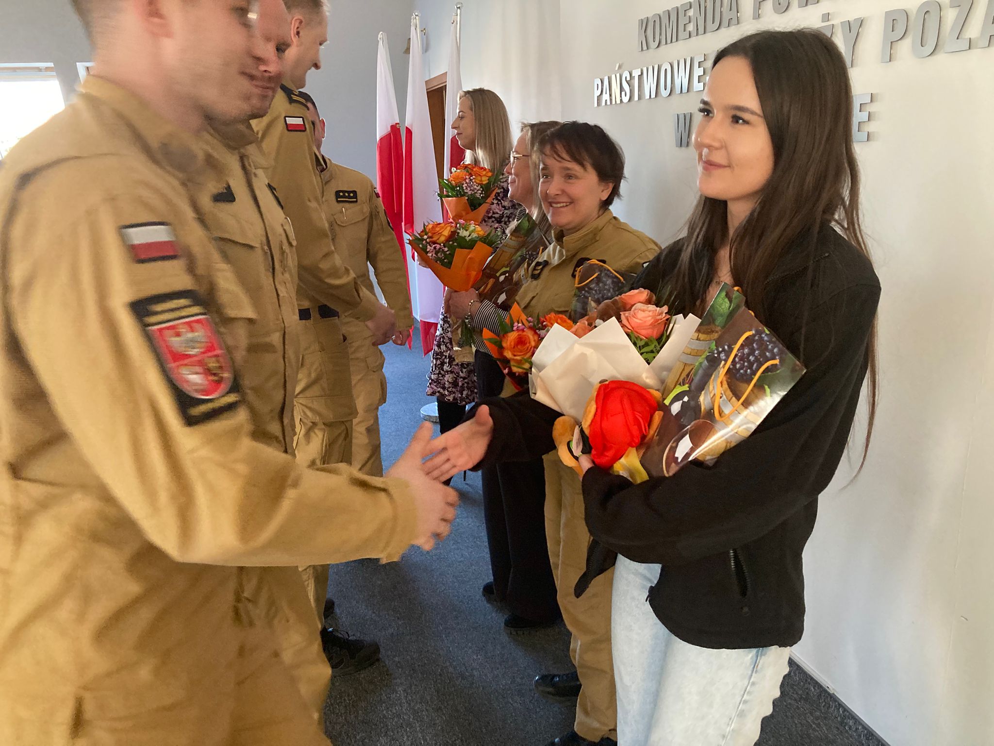 Panie mł. bryg. Katarzyna Wiśniewska, Agnieszka Licznerska, Agnieszka Jaroszewska oraz Wiktoria Bartkowska otrzymały również symboliczne kwiatki jako wyraz podziękowania za uśmiech, wytrwałość i zaangażowanie w codziennej pracy.