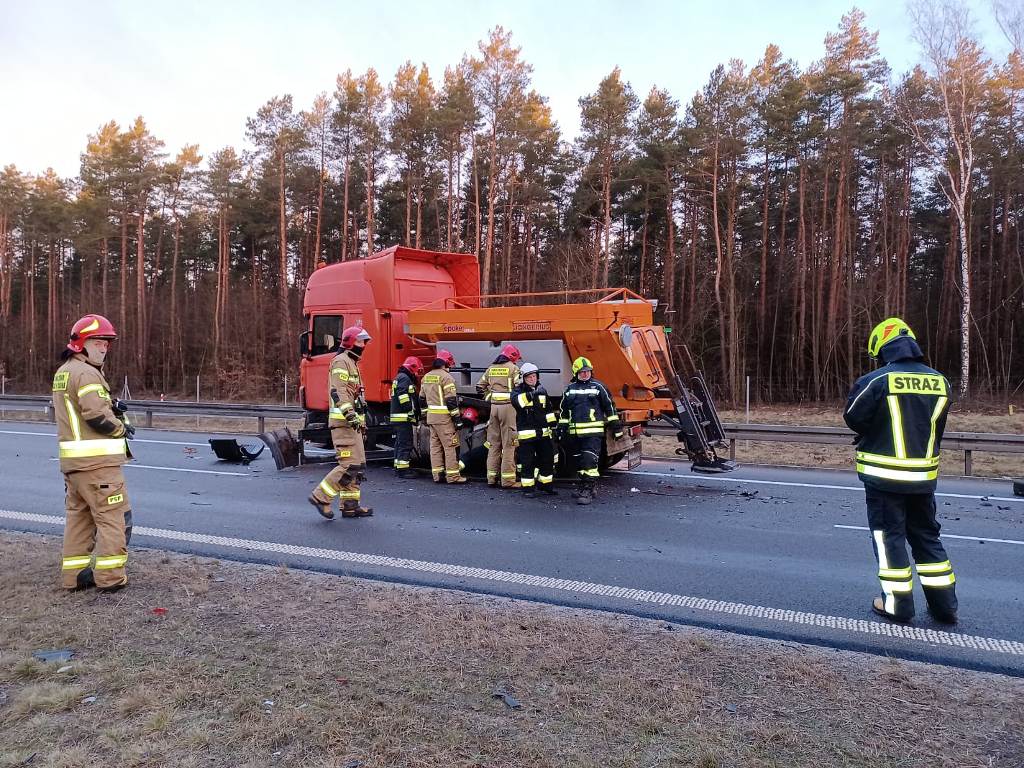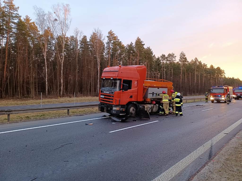 Kwadrans przed godziną siódmą doszło do zderzenia samochodu osobowego z pługopiaskarką na drodze ekspresowej S7. Na pograniczu powiatu ostródzkiego i olsztyńskiego, na pasie jezdni w kierunku Gdańska z niewyjaśnionych przyczyn osobowy fiat uderzył w piaskarkę, po czym dachował. Do akcji ratowniczej z ostródzkiej JRG wyjechał samochód ratowniczo-gaśniczy oraz samochód pożarniczy z Ochotniczej Straży Pożarnej w Gierzwałdzie. Ponadto z powiatu olsztyńskiego udział w akcji ratowniczej brali strażacy z JRG 1 Olsztyn i OSP Olsztynek. Autem osobowym podróżowali kobieta i mężczyzna. Kierujący pojazdem mężczyzna odniósł powierzchowne obrażenia i pozostał na miejscu zdarzenia. Kobieta była poważnie ranna, została zabrana do szpitala. Kierowca pługopiaskarki nie odniósł żadnych obrażeń. Strażacy wraz z ratownikami medycznymi udzielili pomocy medycznej poszkodowanym. Ponadto zabezpieczyli pojazdy pod względem pożarowym.