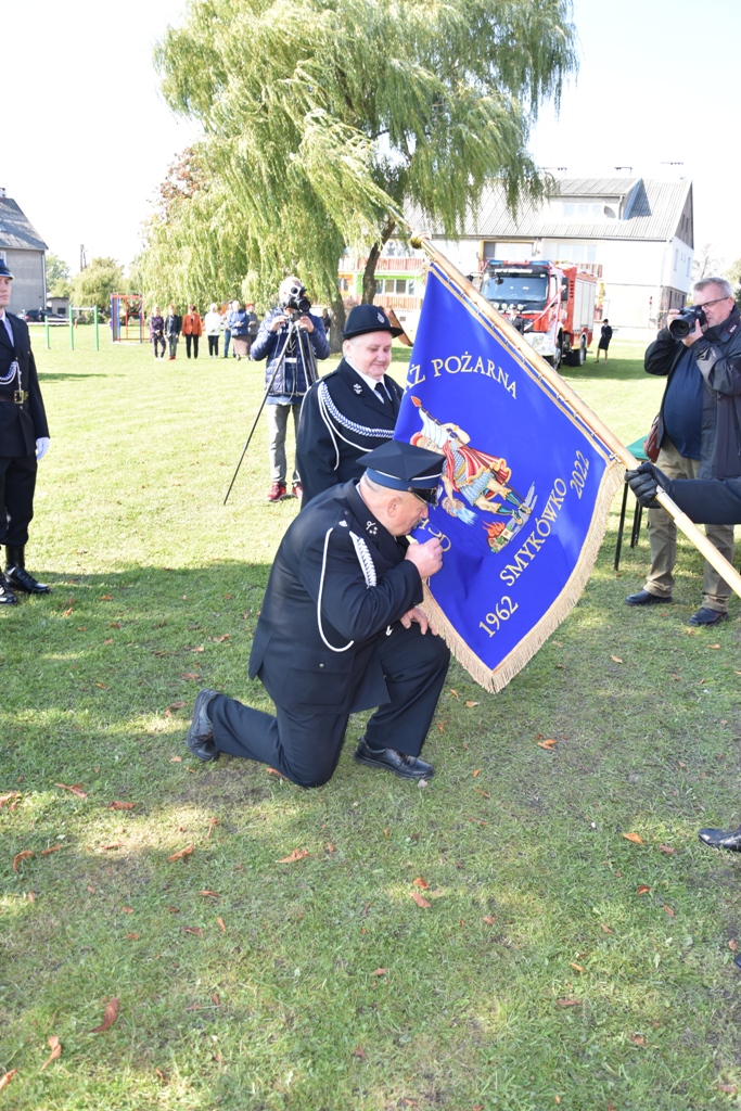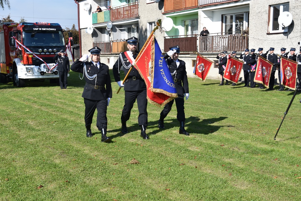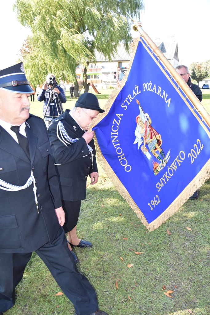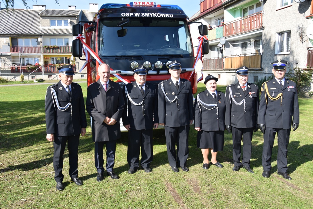 W sobotę 1 października w samo południe w Smykówku rozpoczęła się uroczysta zbiórka z okazji nadania sztandaru Ochotniczej Straży Pożarnej Smykówko oraz oficjalnego przekazania nowego samochody ratowniczo-gaśniczego. Przewodniczącą Komitetu Fundacji Sztandaru była Pani Senator Bogusława Orzechowska, która w symboliczny sposób przekazała sztandar w ręce strażaków. Kolejnym punktem uroczystości było oficjalne przekazanie i poświęcenie nowego samochodu ratowniczo-gaśniczego Volvo, który zakupiono ze środków MSWiA w uzupełnieniu o środki samorządu województwa oraz gminy Ostróda. Jak strażacy przyznali, nowy pojazd pożarniczy to spełnienie ich marzeń. Kluczyki i dokumenty w symboliczny sposób przekazali Poseł na Sejm RP Zbigniew Babalski, dh Gustaw Marek Brzezin Prezes Zarządu Oddziału Wojewódzkiego ZOSP RP, a zarazem Marszałek Województwa, Zastępca Warmińsko-Mazurskiego Komendanta Wojewódzkiego PSP st. bryg. Tomasz Ostrowski oraz Wójt Gminy Ostróda Bogusław Fijas. Podczas uroczystości wręczone były odznaczenia oraz wyróżnienia. Prezes OSP Smykówko dh Irena Jara przekazała podziękowania wszystkim darczyńcom i osobom, które pomogły w organizacji uroczystości. Oprócz licznej grupy strażaków OSP w uroczystości udział wzięli strażacy PSP na czele z mł. bryg. Łukaszem Jasińskim ostródzkim Komendantem Powiatowym PSP i Komendantem Powiatowym PSP w Iławie st. bryg. Piotrem Wlazłowskim, dh Ryszard Harasim Prezes ZOP ZOSP RP w Ostródzie, samorządowcy, leśnicy, oraz przedsiębiorcy oraz mieszkańcy Smykówka i sąsiednich miejscowości.