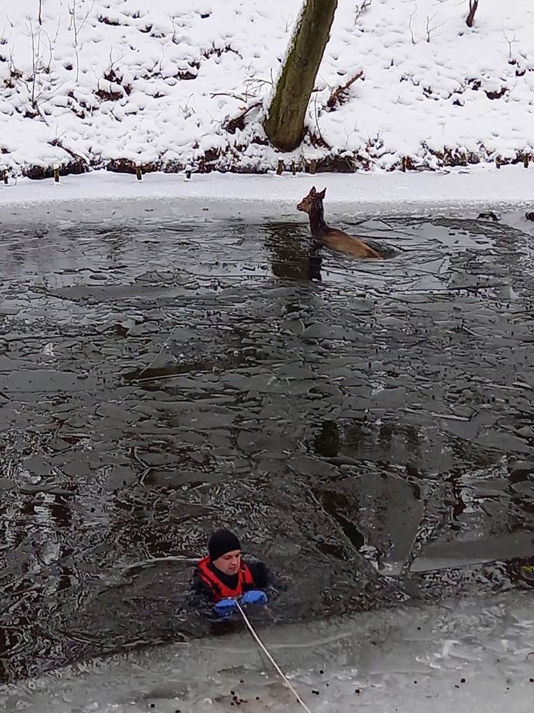 Kilka minut przed południem 19 stycznia strażacy z ostródzkiej jednostki ratowniczo-gaśniczej zostali zadysponowani do miejscowości Międzylesie. Na kanale żeglownym pod jeleniem zarwał się lód i zwierzę nie mogło wydostać się na brzeg. Pomimo kilkudniowych mrozów pokrywa lodowa na akwenach jest krucha i cienka. Strażacy skruszyli lód przy jednym z brzegów i ustawili się tyralierą po przeciwległej stronie kanału. Dzięki temu jeleń skierował się w miejsce, w którym wykonano dostęp do brzegu. Bezpiecznie wyszedł z akwenu cały i zdrowy oddalił się w głąb lasu.