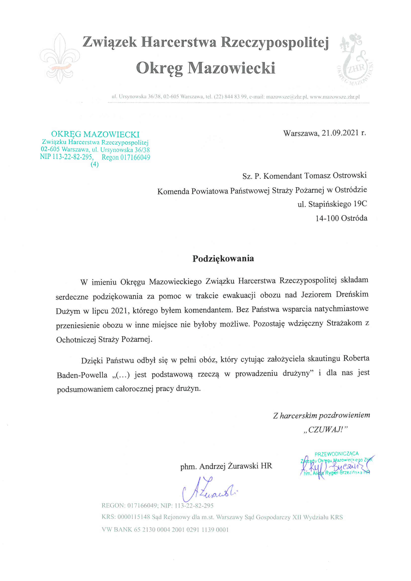 Podziękowania harcerzy za sprawnie przeprowadzoną ewakuację