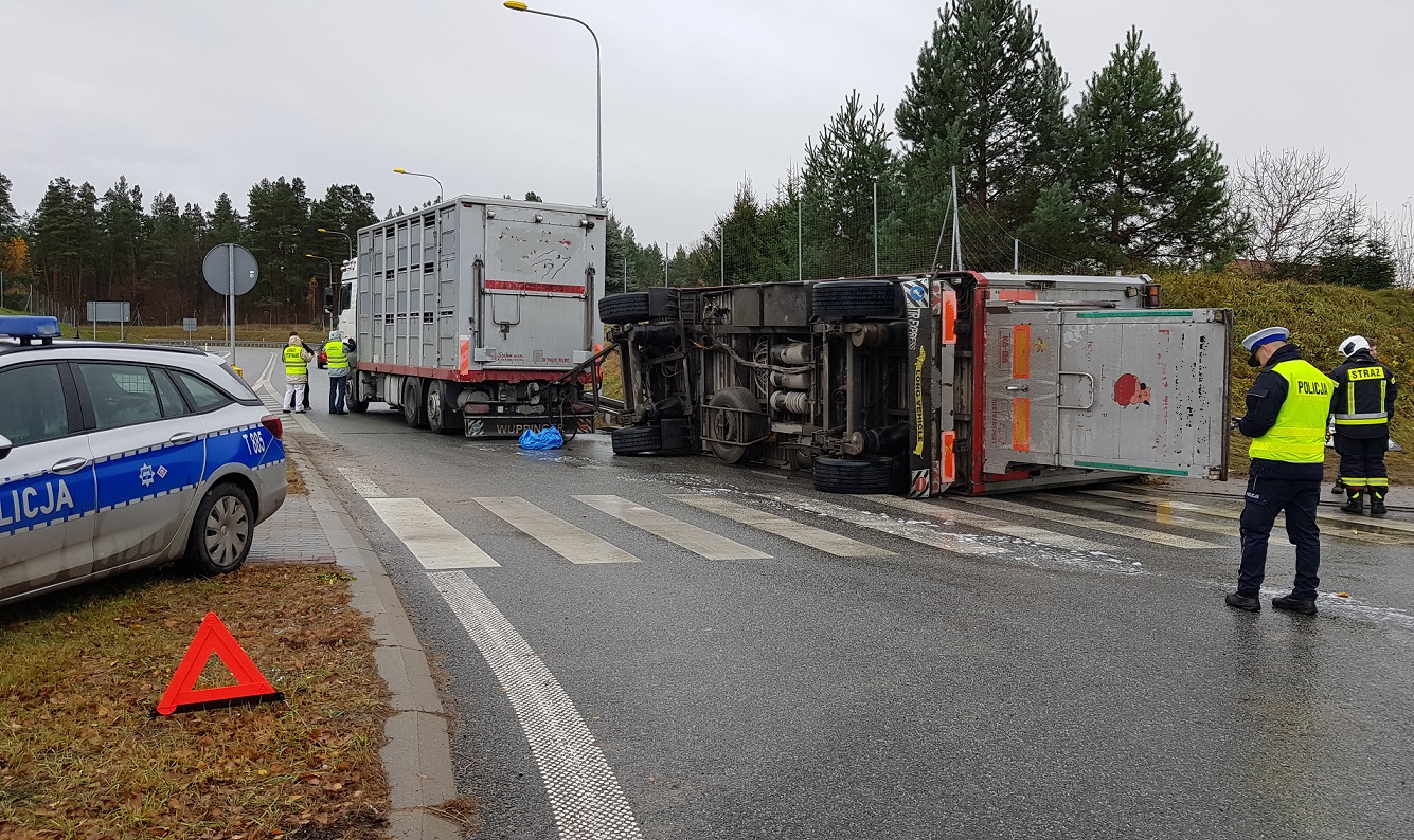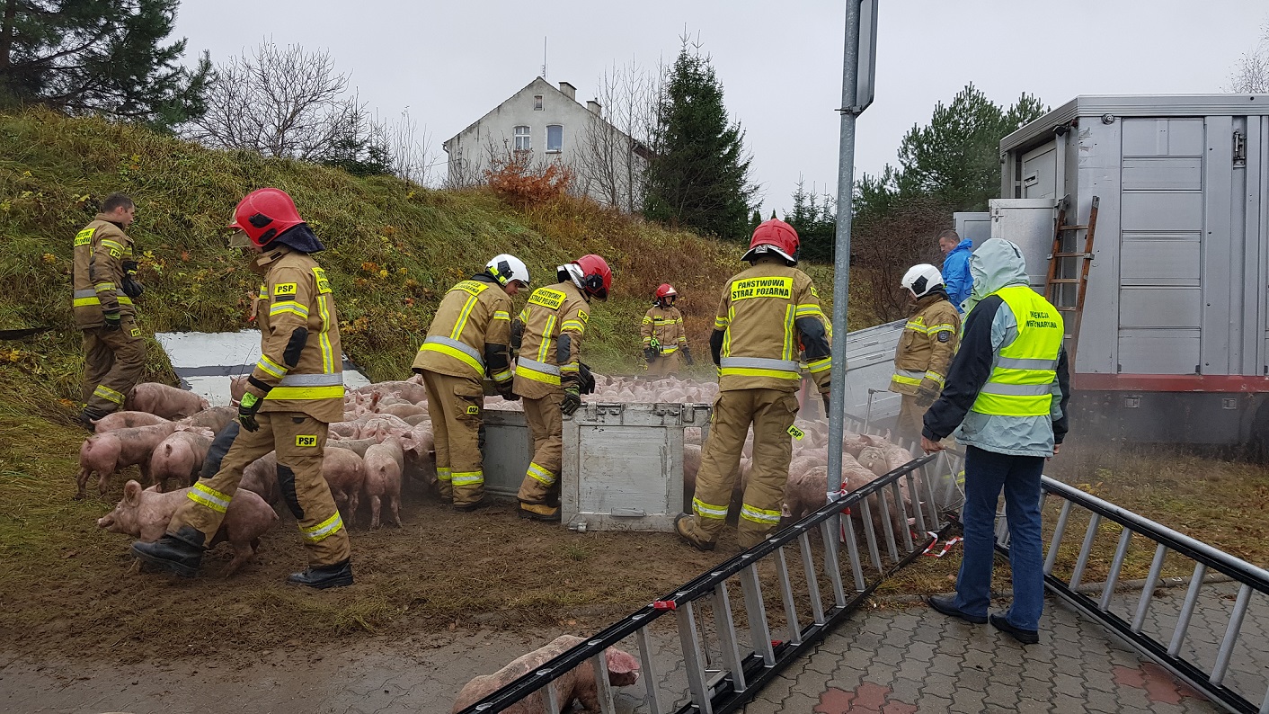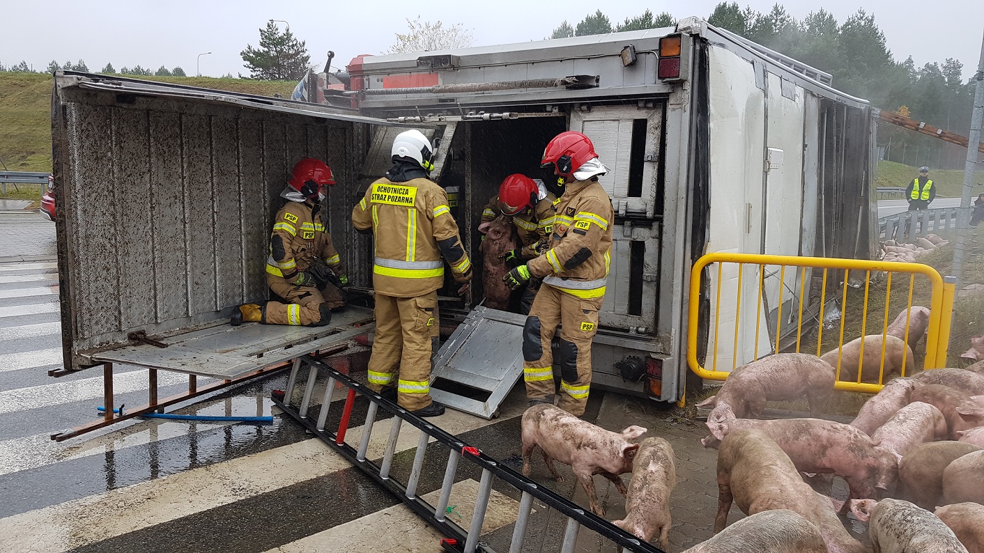 8 listopada tuż po godzinie jedenastej do dyżurnego stanowiska kierowania Państwowej Straży Pożarnej w Ostródzie wpłynęło zgłoszenie o kolizji pojazdu ciężarowego na węźle Miłomłyn południe drogi ekspresowej S-7. Ze zgłoszenia wynikało, że ciężarówka transportowała prosiaki w wieku około 3-4 miesięcy. Na miejsce zdarzenia zostały zadysponowane zastępy z Jednostki Ratowniczo-Gaśniczej w Ostródzie, samochód ciężki ratownictwa drogowego z Jednostki Ratowniczo-Gaśniczej w Morągu oraz zastęp z Ochotniczej Straży Pożarnej w Miłomłynie. Po dotarciu na miejsce zdarzenia kierujący działaniami ratowniczymi stwierdził, że doszło do wywrócenia jedynie przyczepy ciągniętej przez ciężarówkę. W związku z powyższym kierowca ciężarówki nie odniósł żadnych obrażeń. Natomiast w przewróconej przyczepie znajdowało się trzysta prosiaków, które wzajemnie się przygniatały. Działania strażaków były konieczne w celu uratowania jak największej liczby prosiaków. Dostęp do nich był utrudniony i wymagał dużego zaangażowania. Konieczna była również właściwa organizacja pola działań, gdyby prosiaki rozbiegły się po Miłomłynie były by bardzo trudne do złapania. Wyładowanie trzystu sztuk wymagało od strażaków dużego wysiłku. Dzięki użyciu drabin pożarniczych udawało się je skutecznie zatrzymywać na ograniczonym obszarze. Właściciel firmy transportowej zapewnił drugi pojazd dzięki czemu możliwy był szybki przeładunek. Działania obserwował przedstawiciel Powiatowego Lekarza Weterynarii. W wyniku zdarzenia zginęło 5 prosiąt, a 6 zostało rannych.