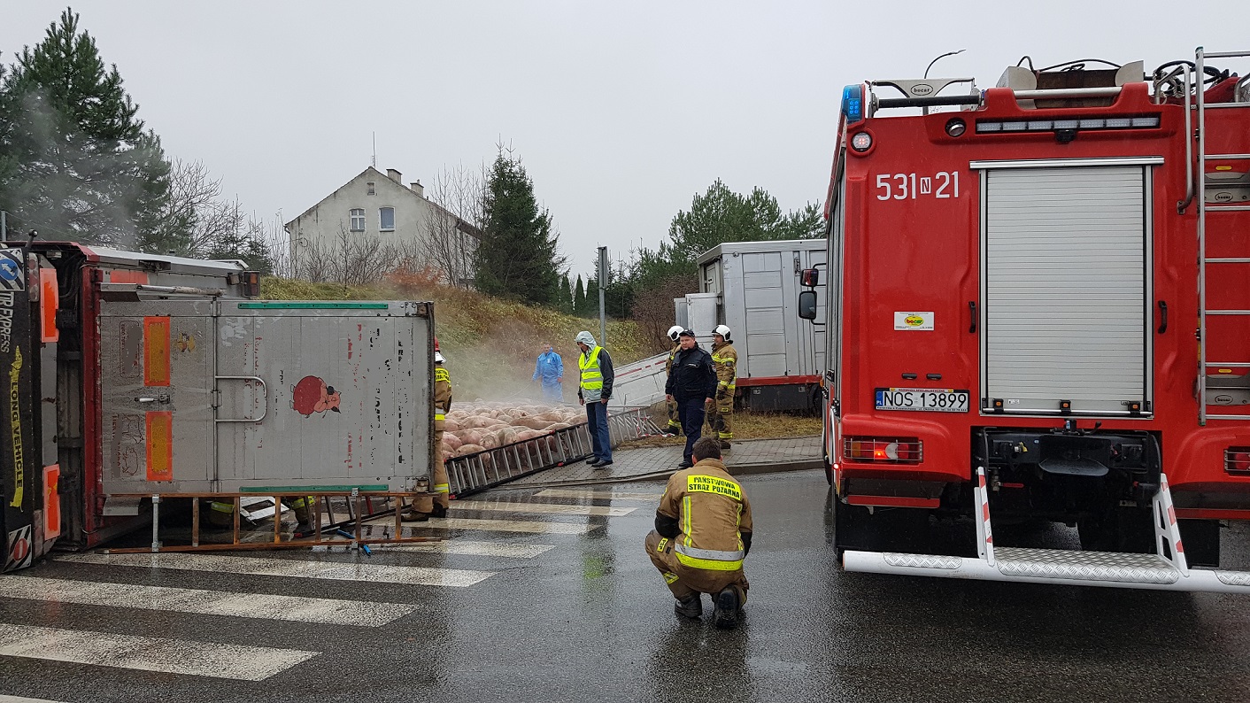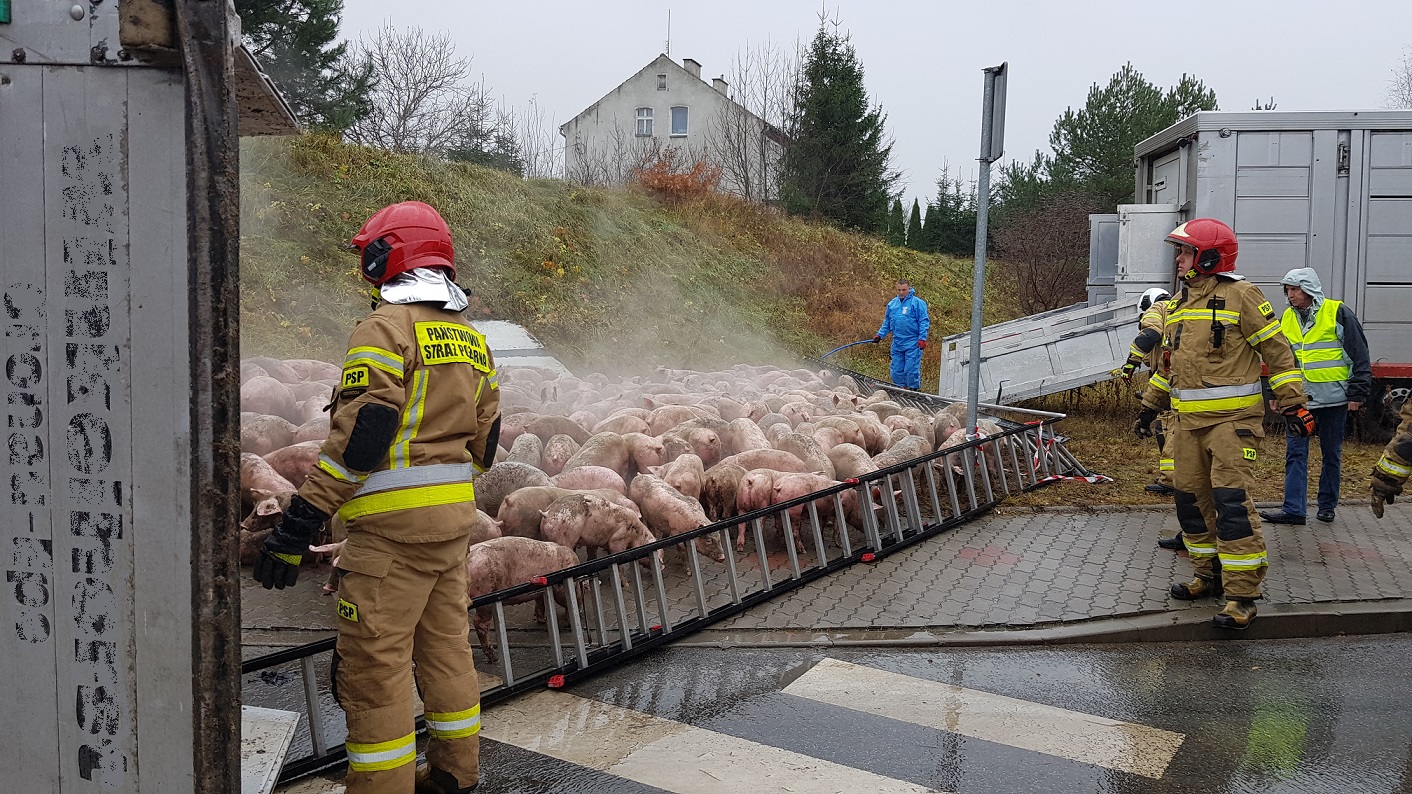 Przewrócona przyczepa z prosiętami