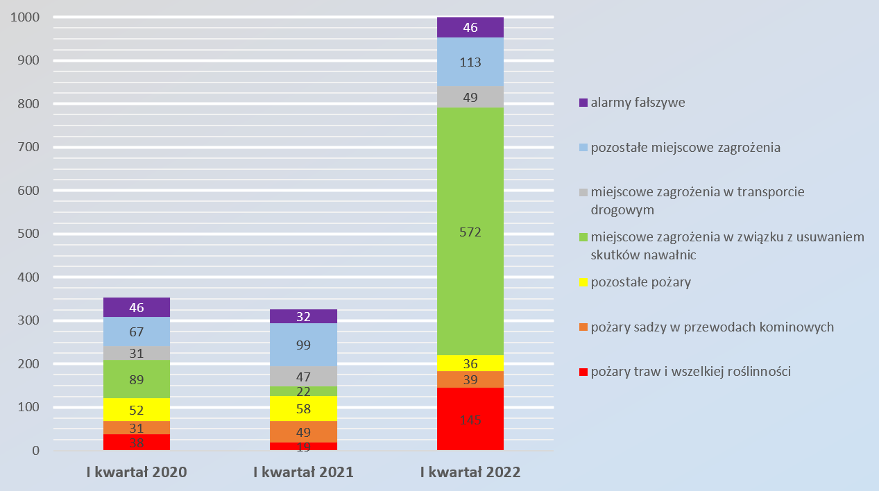 Główną przyczyną jest blisko czterokrotny wzrost liczby miejscowych zagrożeń, spośród których aż 78% (572 interwencje) dotyczyły działań związanych z usuwaniem skutków anomalii pogodowych. Znaczący jest także wzrost liczby pożarów traw (ponad 600% względem analogicznego okresu w 2021 roku.