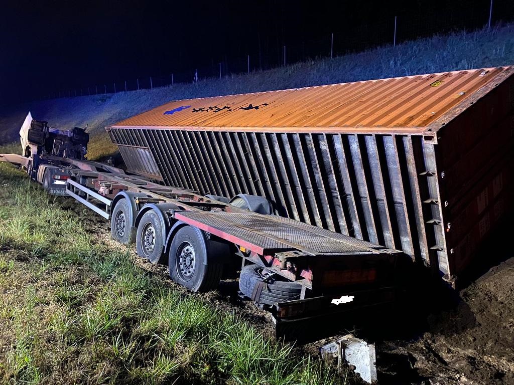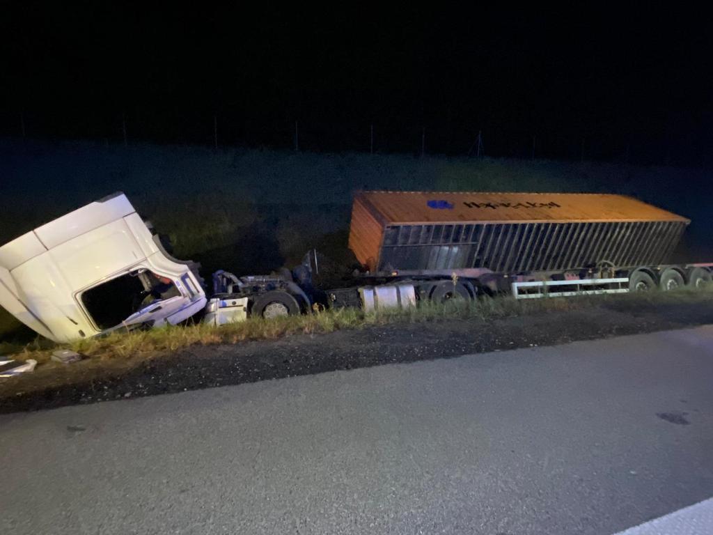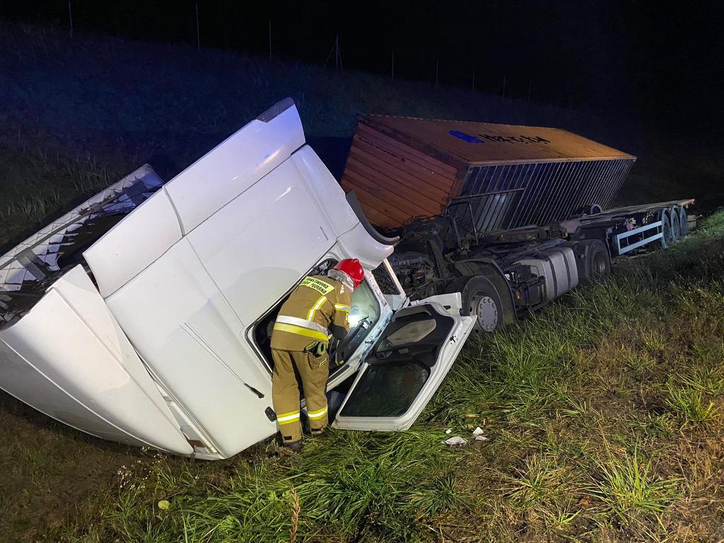 Samochód ciężarowy z naczepą zjechał do przydrożnego rowu. Do akcji ratowniczej z ostródzkiej JRG wyjechały dwa samochody ratowniczo-gaśnicze oraz ciężki ratownictwa drogowego. Na miejscu zdarzenia strażacy ustalili, że pojazdem podróżował sam kierowca. Ranny mężczyzna wydostał się z rozbitej ciężarówki samodzielnie. Miał widoczne obrażenia głowy. Strażacy udzielili mu pomocy medycznej, a następnie przekazali zespołowi ratownictwa medycznego. Poszkodowany został zabrany do szpitala. Ponadto strażacy zabezpieczyli pojazd pod względem pożarowym, a także sprawdzili, czy nie doszło do wycieków płynów eksploatacyjnych z ciężarówki.