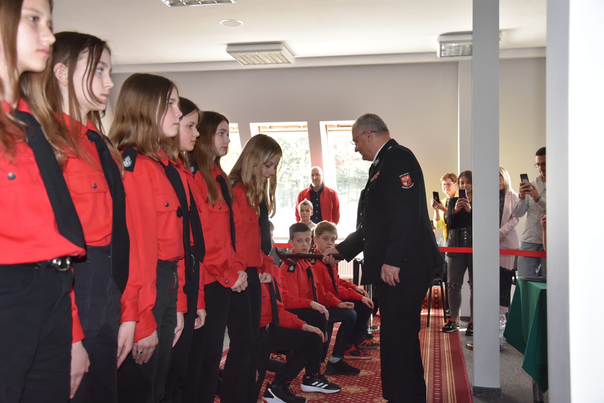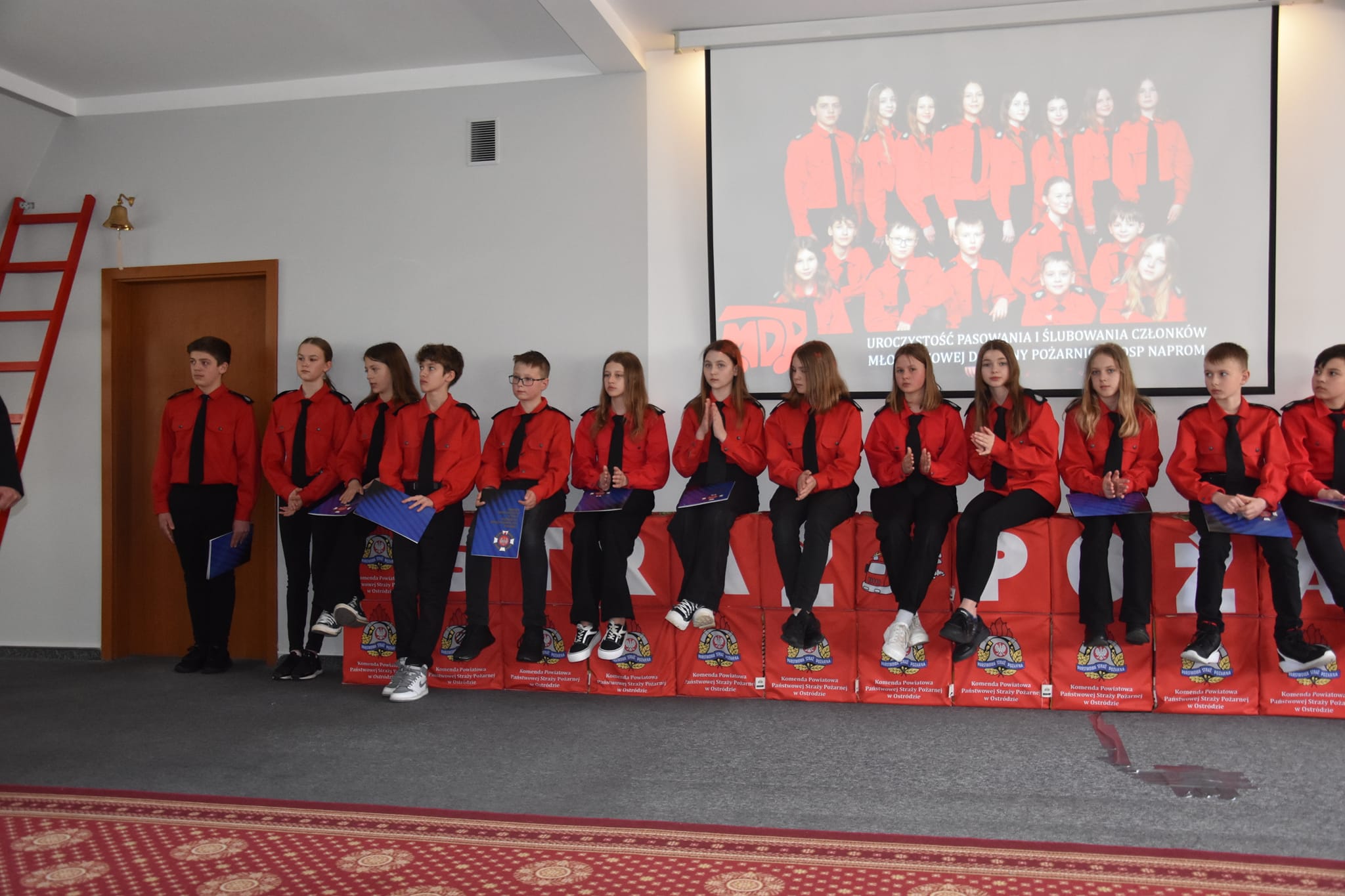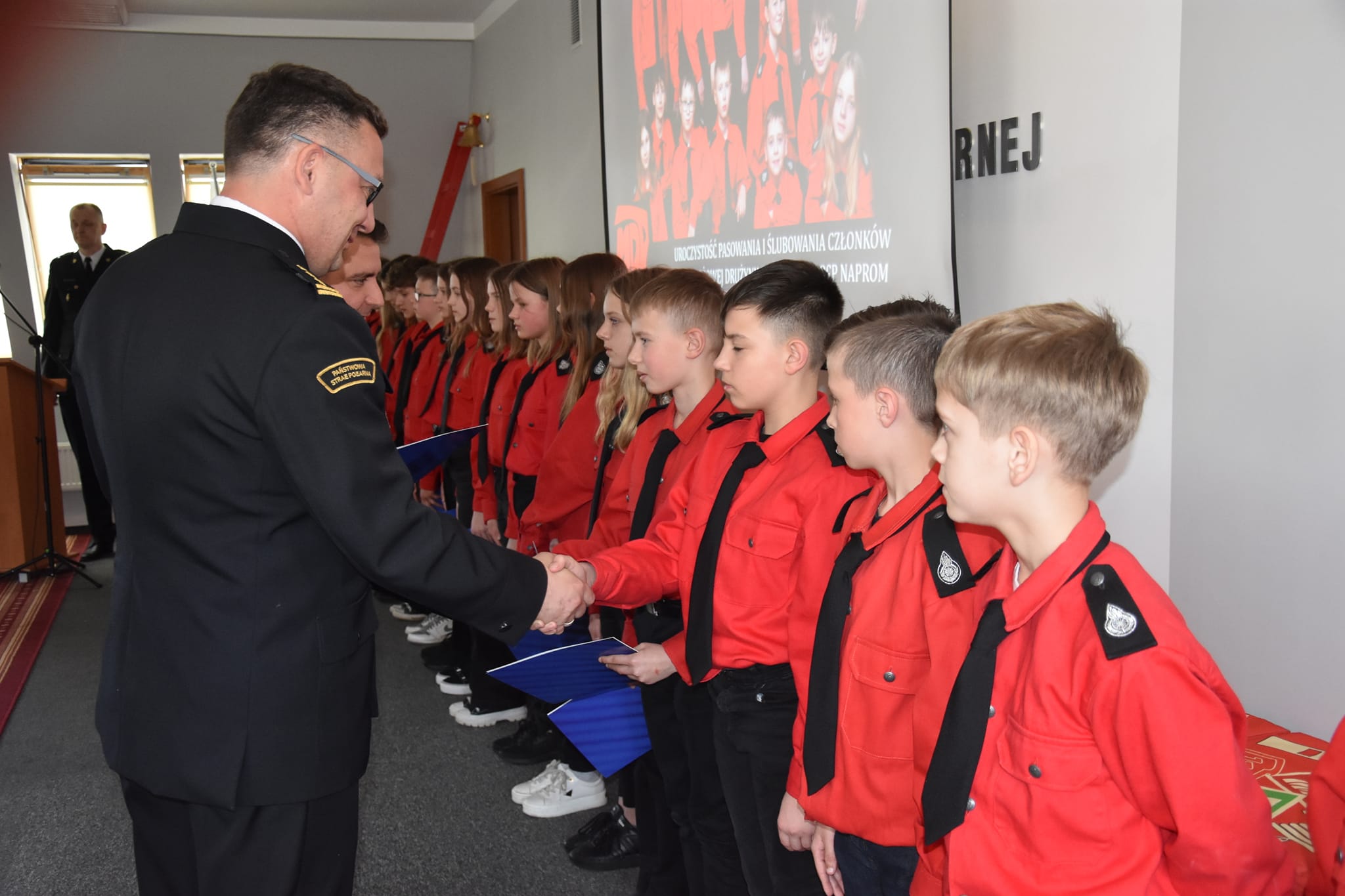 Piątek 28 kwietnia to historyczna data w dziejach Młodzieżowej Drużyny Pożarniczej przy Ochotniczej Straży Pożarnej w Napromie. Tego dnia członkowie MDP Naprom podczas uroczystej zbiórki złożyli pierwsze ślubowanie pożarnicze. Uroczystość odbyła się w sali edukacyjnej ostródzkiej Komendy Powiatowej Państwowej Straży Pożarnej, a rozpoczęła się od złożenia meldunku o gotowości do uroczystości przez Dowódcę MDP Naprom Borysa Waszkiewicza dh Ryszardowi Harasimowi Prezesowi Zarządu Oddziału Powiatowego ZOSP RP. Zgromadzonych przywitał pomysłodawca, założyciel i opiekun MDP Naprom st. kpt. Rafał Napiórkowski na co dzień ostródzki Zastępca Komendanta Powiatowego PSP. Pośród licznie przybyłych gości znaleźli się między innymi: st. bryg. Tomasz Ostrowski Zastępca Warmińsko-Mazurskiego Komendanta Wojewódzkiego PSP, Komendant Powiatowy PSP w Ostródzie mł. bryg. Łukasz Jasiński, Zastępca Wójta Gminy Ostróda Grzegorz Kastrau, dh Ryszard Harasim Prezes Zarządu Oddziału Powiatowego ZOSP RP, Prezes OSP Naprom dh Stanisław Blajda oraz rodzice i najbliżsi ślubujących. Symbolicznego pasowania toporkiem strażackim na strażaka młodzieżowej drużyny pożarniczej dokonał dh Prezes Ryszard Harasim, a rotę ślubowania odczytała Wiktoria Napiórkowska. Upamiętnieniem tej podniosłej chwili było wręczenie aktów ślubowania i legitymacji członkowskich, których dokonali st. bryg. Tomasz Ostrowski Zastępca Warmińsko-Mazurskiego Komendanta Wojewódzkiego PSP wraz z mł. bryg. Łukaszem Jasińskim ostródzkim Komendantem Powiatowym PSP. Po uroczystości młodzi druhowie zaprezentowali swoje umiejętności z zakresu udzielania pierwszej pomocy.
