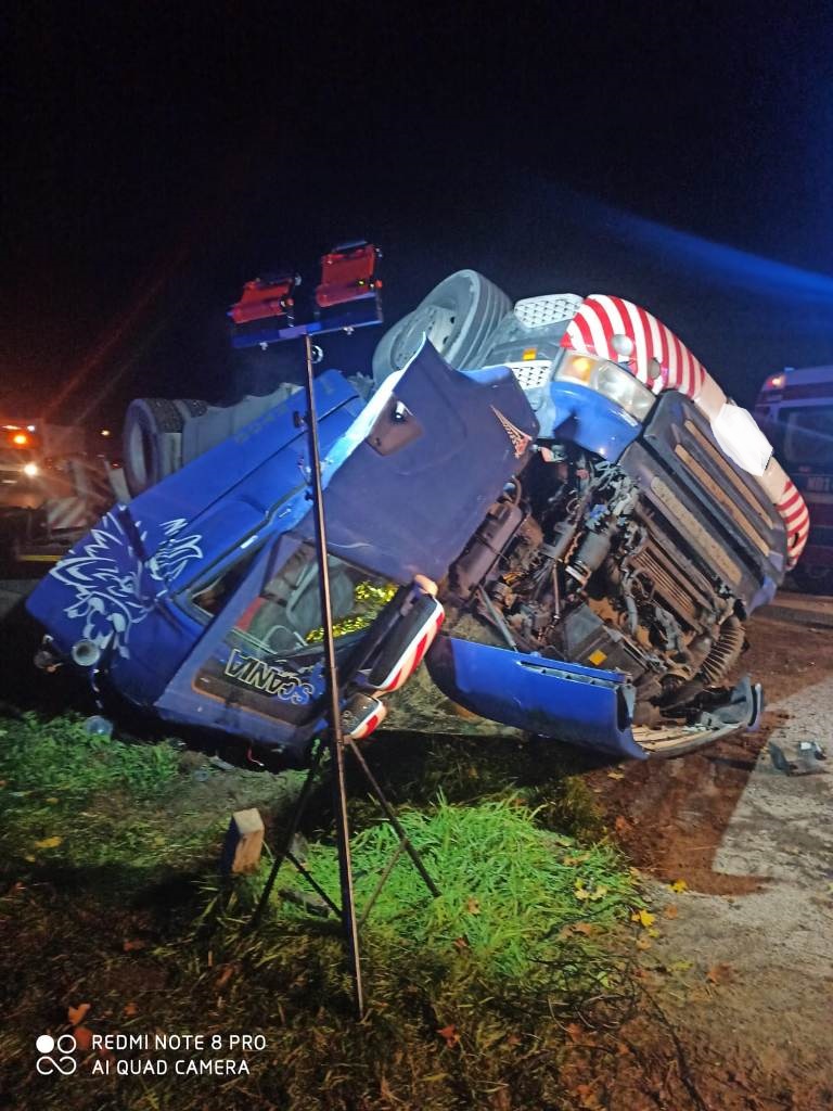 Z nieznanych na razie przyczyn ciężarowy zestaw przewożący przęsła mostowe, przewrócił się do rowu. Pojazdem podróżował 21-letni kierowca, który został zakleszczony w kabinie ciężarówki. Do akcji ratowniczej zadysponowano dwa samochody ratowniczo-gaśnicze i ciężki ratownictwa drogowego z ostródzkiej JRG oraz dwa zastępy pożarnicze z Ochotniczej Straży Pożarnej w Dąbrównie. Strażacy z OSP Dąbrówno, którzy mieli najbliżej miejsca zdarzenia, rozpoczęli wykonywania dostępu do uwięzionego mężczyzny. Równolegle zaczęli udzielanie pomocy medycznej rannemu. Mężczyzna był nieprzytomny, jego czynności życiowe były słabo wyczuwalne. Kabina była bardzo zdeformowana, aby wykonać dostęp do poszkodowanego, strażacy musieli użyć kilku ratowniczych narzędzi hydraulicznych jednocześnie. Dalszą operację wydobycia poszkodowanego kontynuowali strażacy z JRG Ostróda. Użyli specjalistycznych rozpieraczy kolumnowych, co pozwoliło na ewakuację rannego. Niestety przybyły na miejsce wypadku lekarz stwierdził zgon 21-latka. Ponadto strażacy zabezpieczyli miejsce zdarzenia pod względem pożarowym oraz zabezpieczyli wycieki płynów eksploatacyjnych z rozbitej ciężarówki.