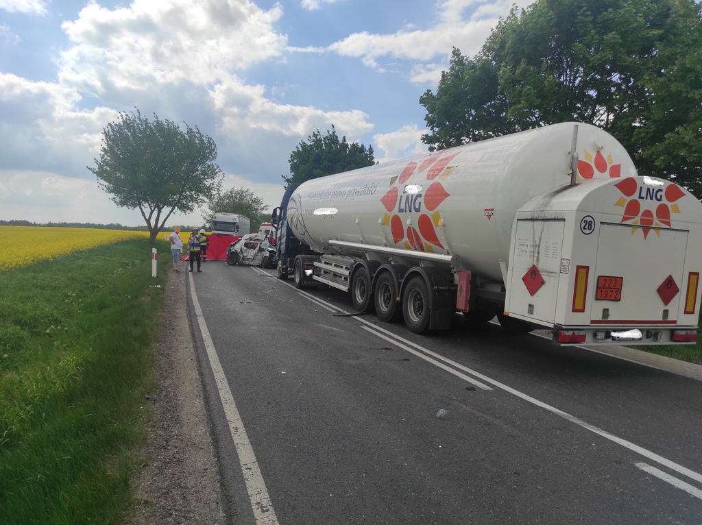 Kilkanaście minut przed godziną piętnastą 20 maja doszło do wypadku drogowego na drodze krajowej nr 15 w miejscowości Lipowo – gmina Ostróda. Samochód osobowy zderzył się z zestawem ciężarowym, którym przewożono gaz LNG. Do akcji ratowniczej z ostródzkiej JRG wyjechały dwa samochody ratowniczo-gaśnicze oraz rozpoznawczo ratowniczy. Dyspozycję wyjazdu otrzymały również ochotnicze straże pożarne w Smykówku i Pietrzwałdzie. Ponadto do akcji ratowniczej wyjechał Zastępca Komendanta Powiatowego PSP w Ostródzie. Na miejscu zdarzenia okazało się, że podróżujący osobową toyotą kobieta i mężczyzna ponieśli śmierć. Kierowca ciężarówki nie odniósł żadnych obrażeń. Strażacy zabezpieczyli pojazdy pod względem pożarowym. Ustalili również, że nie doszło do wycieku gazu z cysterny. Droga krajowa nr 15 o godzinie 17:30 wciąż była zablokowana.