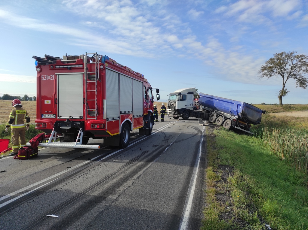 Kilka minut po godzinie ósmej 25 sierpnia doszło do czołowego zderzenie samochodu osobowego ze składem ciężarowym. Wypadek miał miejsce na drodze krajowej nr 15 w okolicy miejscowości Ryńskie. Do akcji ratowniczej z ostródzkiej JRG wyjechały dwa samochody ratowniczo-gaśnicze oraz operacyjny i specjalistyczny ratownictwa technicznego. Na miejsce wypadku udał się również Komendant Powiatowy PSP w Ostródzie. Na miejscu zdarzenia strażacy zastali poważnie rozbite pojazdy. W osobowym volkswagenie znajdowała się nieprzytomna kobieta, bez oznak życia. Nieopodal auta na trawie siedział 13-letni chłopiec z widocznymi obrażeniami, którego z rozbitego auta ewakuowali świadkowie zdarzenia. Kierowcy ciężarówki nic się nie stało. Strażacy udzielili kwalifikowanej pierwszej pomocy chłopcu, między innymi unieruchomili złamanie ręki, a następnie przekazali ratownikom medycznym. Trzynastolatek został zabrany do szpitala. Równolegle strażacy przystąpili do oceny stanu nieprzytomnej kobiety. Obrażenia były bardzo rozległe. Przybyły na miejsce zdarzenia lekarz z zespołu Państwowego Ratownictwa Medycznego stwierdził zgon kobiety. Strażacy ponadto zabezpieczyli pojazdy pod względem pożarowym. Obecnie tj. przed godziną 15 droga krajowa nr 15 w miejscu wypadku wciąż jest zablokowana. Policja pod nadzorem prokuratora ustala przyczyny zdarzenia.