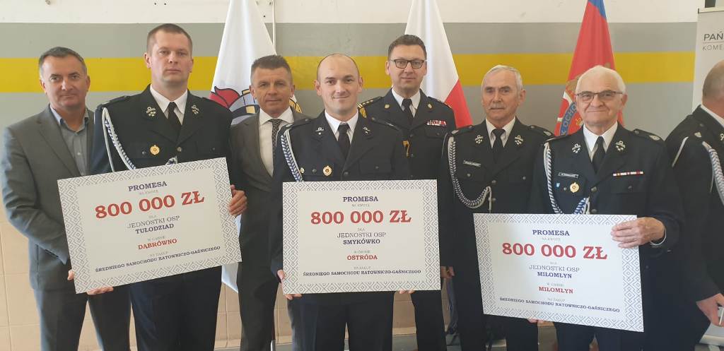 27 kwietnia w Olsztynie wręczone zostały promesy 19 jednostkom ochotniczych straży pożarnych z województwa warmińsko-mazurskiego, na zakup nowych samochodów ratowniczo-gaśniczych. W tym gronie znalazły się 3 jednostki z powiatu ostródzkiego: OSP Miłomłyn, OSP Smykówko i OSP Tułodziad. Promesy podczas uroczystej zbiórki wręczył Podsekretarz Stanu w Ministerstwie Spraw Wewnętrznych i Administracji Pan Błażej Poboży W uroczystości udział wzięli: Wojewoda Warmińsko-Mazurski – Pan Artur Chojecki, Warmińsko-Mazurski Komendant Wojewódzki PSP – nadbryg. Tomasz Komoszyński, Dyrektor w WFOŚiGW – Pani Hanna Teodorowicz, przedstawiciel Marszałka Województwa Warmińsko-Mazurskiego – Pan Jakub Klepański, a także komendanci miejscy i powiatowi PSP, między innymi ostródzki Komendant Powiatowy PSP st. bryg. Tomasz Ostrowski, burmistrzowie i wójtowie, a w tym gronie znaleźli się Burmistrz Miłomłyna Pan Stanisław Siwkowski, Wójt Gminy Ostróda Pan Bogusław Fijas oraz Wójt Gminy Dąbrówno Pan Piotr Zwaliński oraz prezesi jednostek OSP, którzy odebrali promesy. Środki finansowe przekazane w promesach pochodzą z Ministerstwa Spraw Wewnętrznych i Administracji w kwotach: OSP Smykówko 420 tys. zł, OSP Miłomłyn 400 tys. zł i OSP Tułodziad 400 tys. zł. Pozostałą część ceny zakupu pojazdów pożarniczych sfinansują samorządy, przy udziale Samorządu Województwa Warmińsko-Mazurskiego w kwocie 50 tys. zł dla każdej z jednostek.