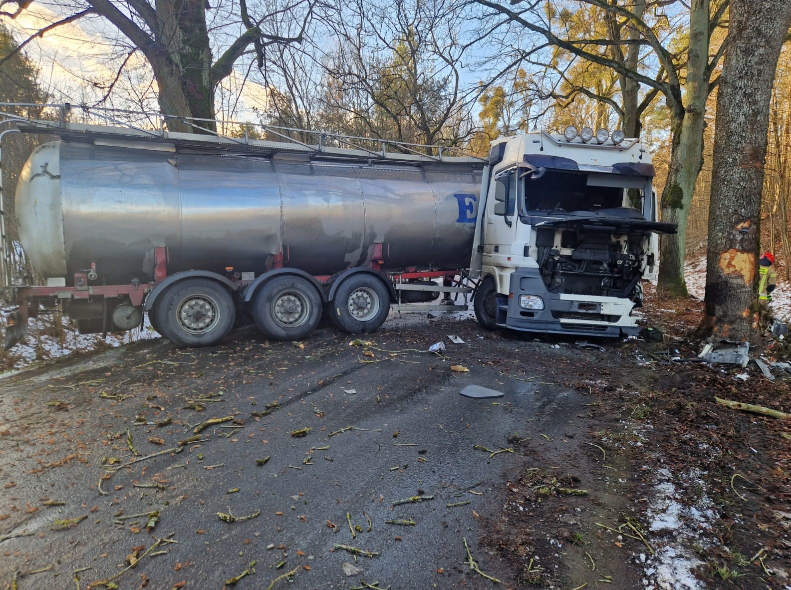 W niedzielę w samo południe strażacy z obu Jednostek Ratowniczo-Gaśniczych tj. z Morąga i Ostródy, a także zastęp z OSP Jurki wyjechali do zdarzenia w miejscowości Niebrzydowo Wielkie (gmina Morąg), gdzie samochód ciężarowy wpadł w poślizg i stanął w poprzek drogi. Naczepa pojazdu w postaci cysterny wypełnionej serwatką nie została uszkodzona, jednak z uszkodzonego ciągnika siodłowego wydostawał się olej napędowy i niezbędne było jego wychwycenie oraz przepompowanie do zewnętrznych zbiorników. Działania prowadzone przez strażaków trwały nieco ponad 3 godziny.