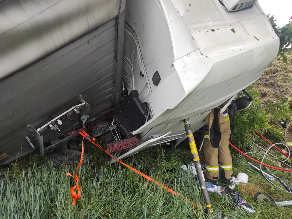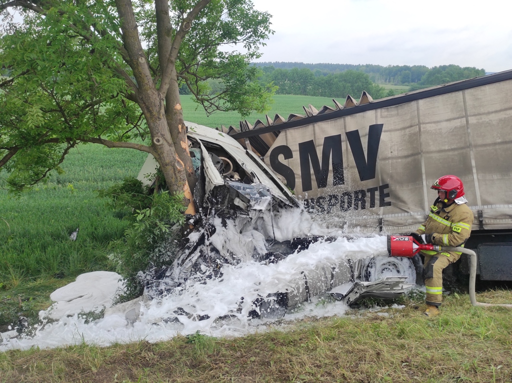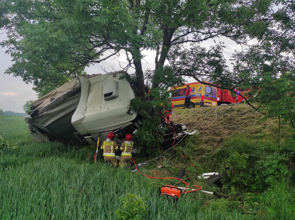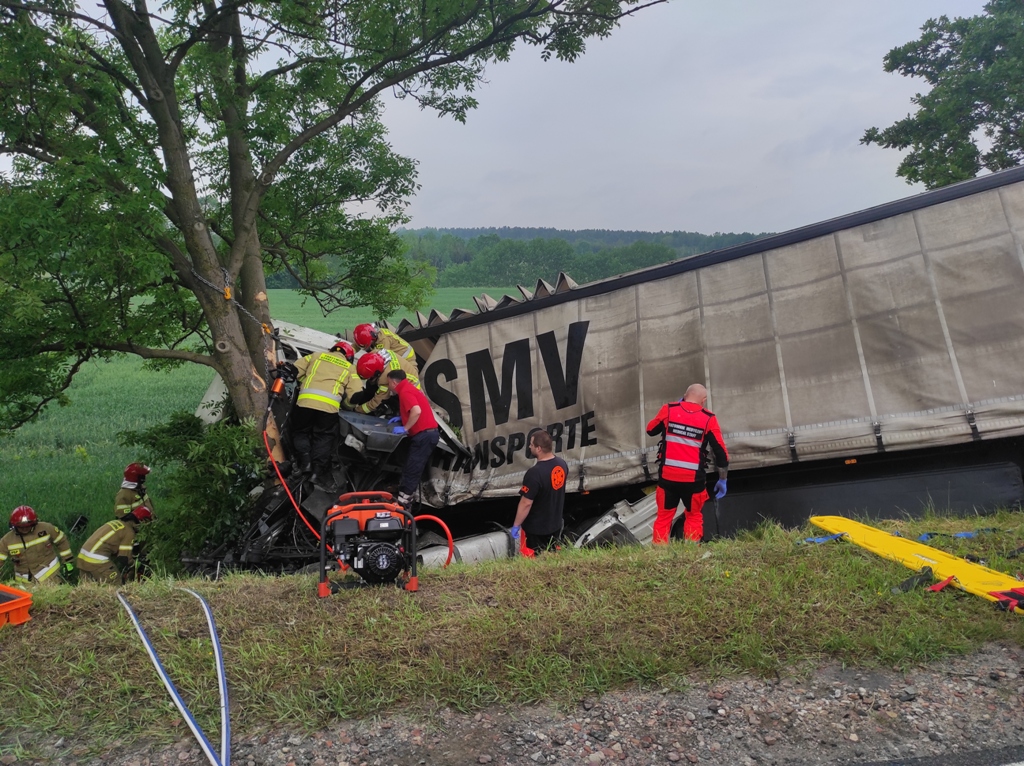 Kwadrans po godzinie siódmej 8 czerwca do stanowiska kierowania komendanta powiatowego Państwowej Straży Pożarnej w Ostródzie wpłynęło zgłoszenie o wypadku drogowym na DK 16 w pobliżu miejscowości Idzbark. Ciągnik siodłowy z naczepą zjechał z drogi i uderzył w drzewo. Do akcji ratowniczej z JRG Ostróda wyjechały dwa samochody ratowniczo-gaśnicze oraz samochód ciężki ratownictwa technicznego typu ”rotator”, a także rozpoznawczo ratowniczy. Na miejsce wypadku udali się również ostródzki Komendant Powiatowy PSP wraz ze swoim zastępcą. Na miejscu zdarzenia strażacy zastali poważnie rozbity samochód ciężarowy. Kabina była kompletnie zdeformowana, a cały zestaw dociskał ją do drzewa. W szoferce był uwięziony, ranny kierowca. Był przytomny, jednak miał liczne złamania i inne obrażenia. Strażacy przy pomocy zestawów ratowniczych narzędzi hydraulicznych przystąpili do uwolnienia kierowcy. Ratownicy medyczni Państwowego Ratownictwa Medycznego kontrolowali stan poszkodowanego. Akcja była niezwykle trudna. Równolegle strażacy wykonywali dostęp do kierowcy i stabilizowali kabinę, która w każdej chwili mogła oderwać się od podwozia. Aby uwolnić mężczyznę, konieczne było odciągnięcie kolumny kierowniczej, a także wycięcie oparcia fotela kierowcy i rozparcie deski rozdzielczej. Poszkodowany w poważnym stanie został zabrany do szpitala. W wyniku wypadku doszło do wycieku płynów eksploatacyjnych z rozbitej ciężarówki, między innymi oleju napędowego. Strażacy wokół pojazdu położyli tak zwany „dywan” piany średniej, który zabezpieczył miejsce przed ewentualnym pożarem. Droga krajowa nr 16 na tym odcinku była zablokowana przez 6 godzin. Policja zorganizowała objazdy.