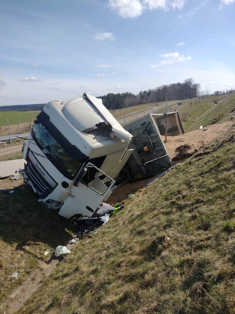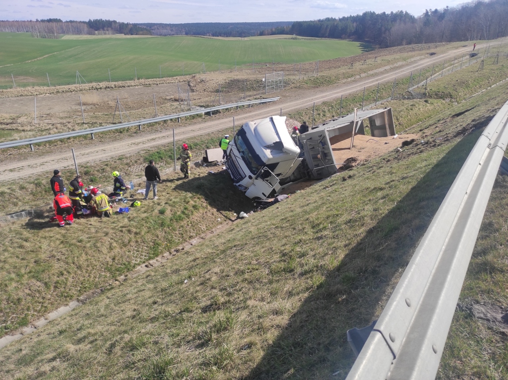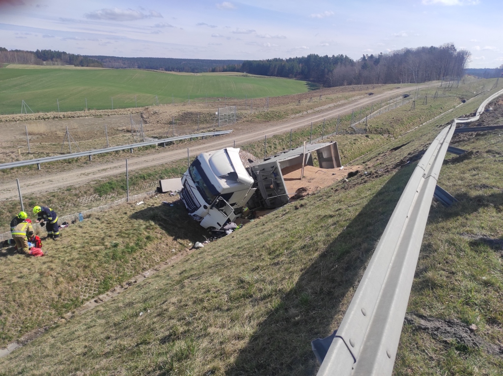 Wypadek na S7 – ciężarówka wypadła z drogi i stoczyła się do rowu