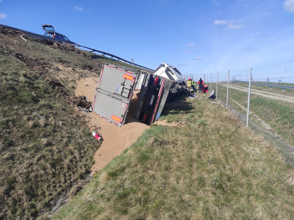 Kilka minut przed godziną dziesiątą 19 kwietnia doszło do wypadku drogowego na drodze S7 w okolicy miejscowości Rychnowo – gm. Grunwald. Ciągnik siodłowy z naczepą wypełnioną zbożem wypadł z drogi i stoczył się z kilkumetrowego nasypu do rowu. Zestawem ciężarowym podróżował sam kierowca. Do akcji ratowniczej z ostródzkiej JRG wyjechał samochód ratowniczo-gaśniczy i samochód rozpoznawczo ratowniczy, a także dyspozycję wyjazdu otrzymała jednostka Ochotniczej Straży Pożarnej w Gierzwałdzie. W momencie przybycia służb ratunkowych kierowca znajdował się poza rozbitym pojazdem pod opieką świadków zdarzenia. Był przytomny, ale z widocznymi licznymi obrażeniami. Strażacy udzielili mężczyźnie kwalifikowanej pierwszej pomocy i przekazali go zespołowi Państwowego Ratownictwa Medycznego, który zabrał rannego do szpitala. Ponadto strażacy zabezpieczyli pojazd pod względem pożarowym.