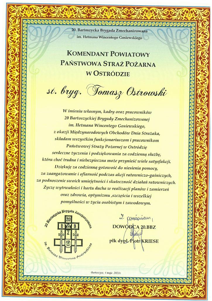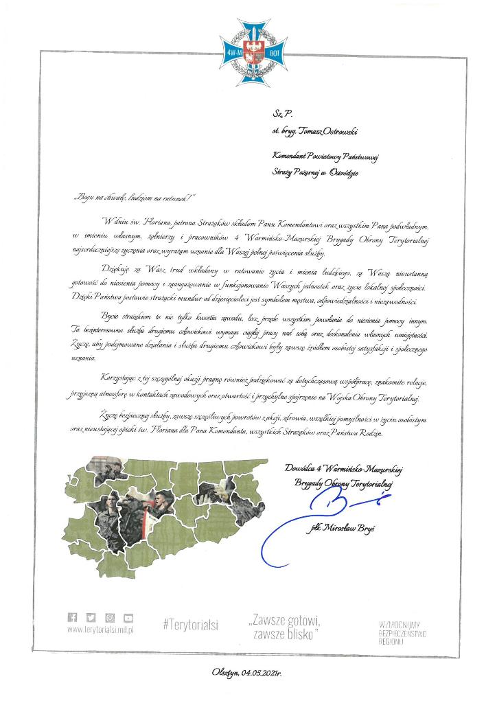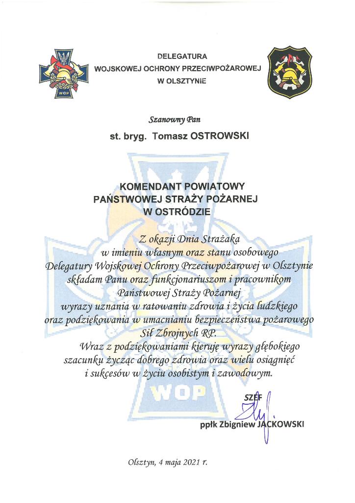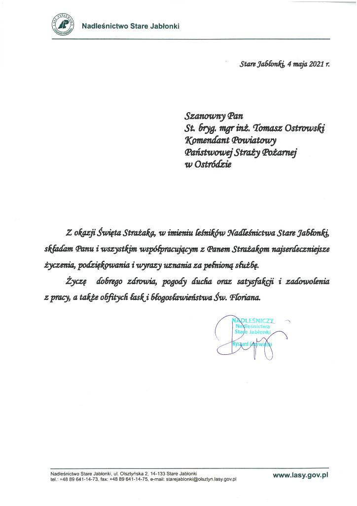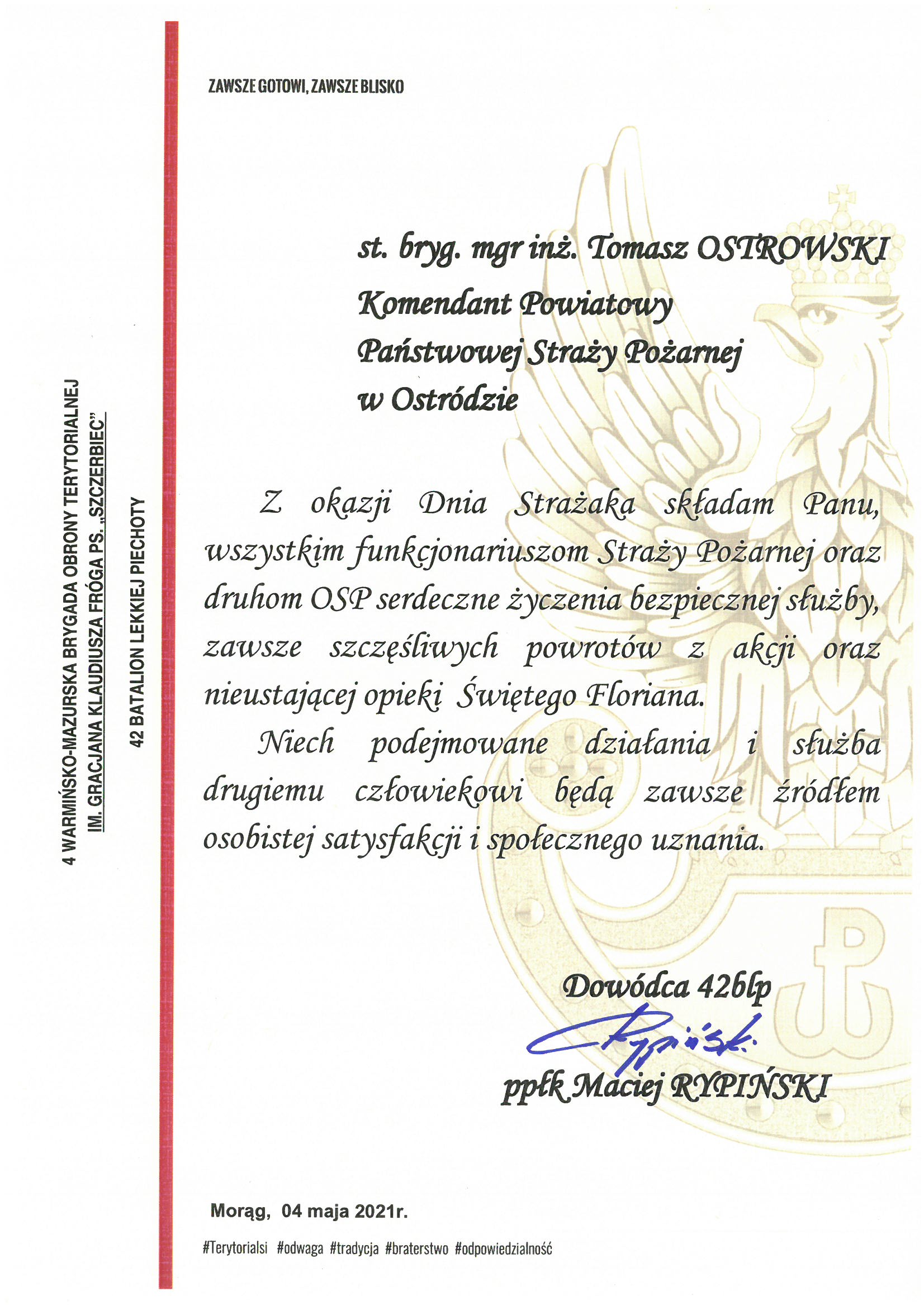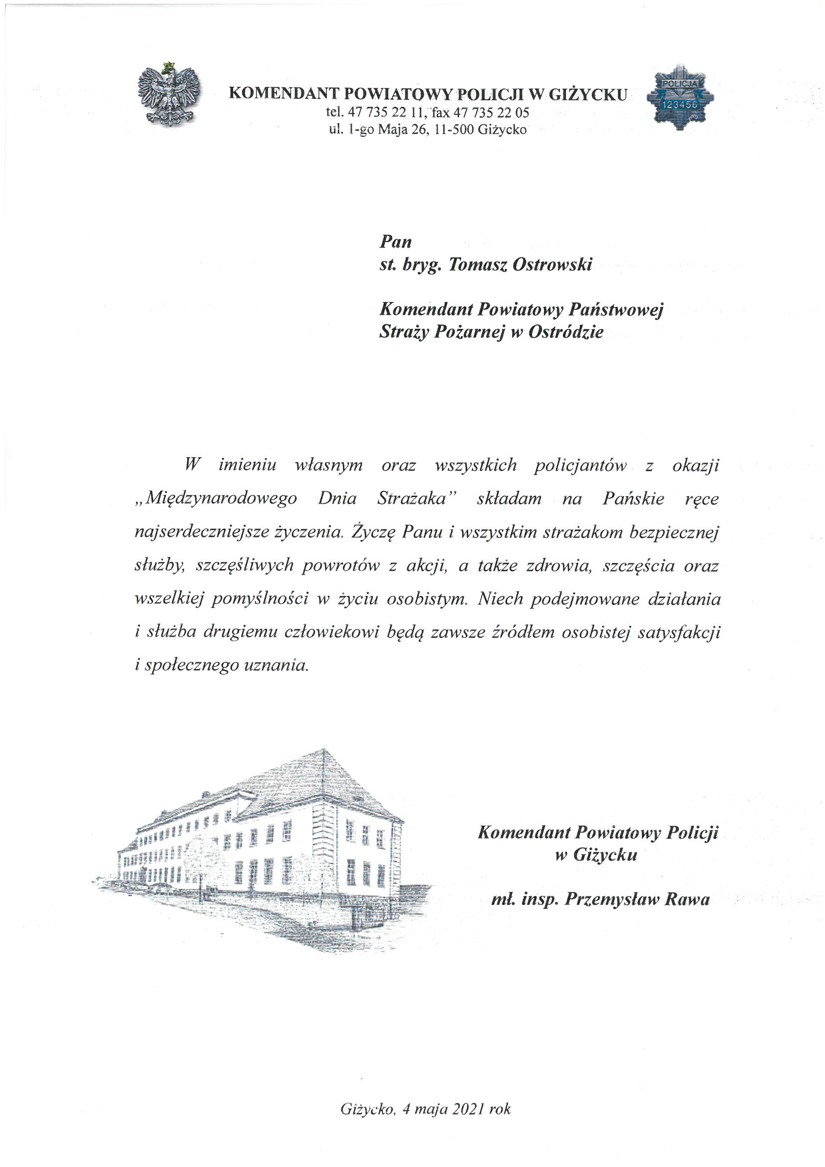Z okazji Dnia Strażaka 2021 do ostródzkiej Komedny Powiatowej Państwowej Straży Pożarnej napłynęły życzenia.
