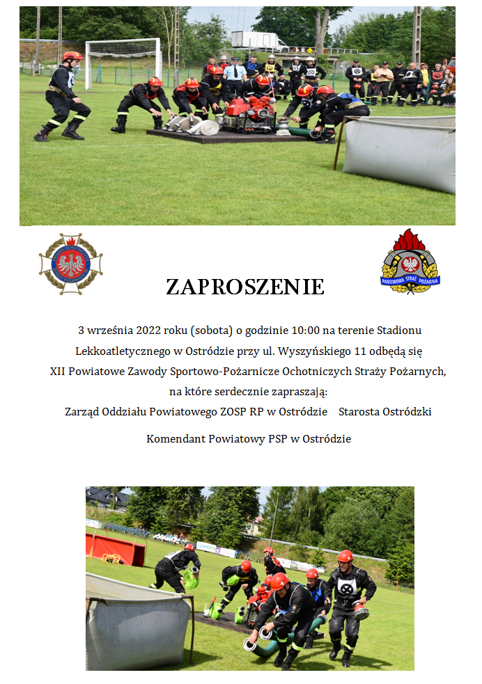 Zaproszenie na XII Powiatowe Zawody Sportowo-Pożarnicze 03.09.2022 Zdjęcia (1) Pokaż zdjęcie 1 z galerii.