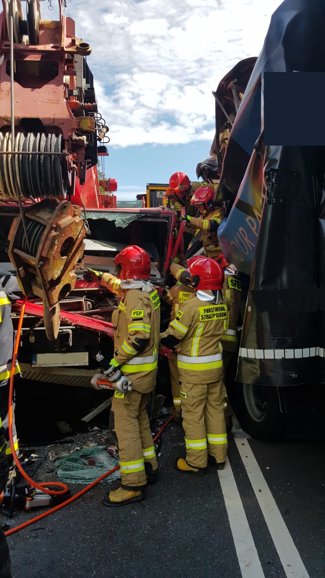 13 lipca przed godziną jedenastą na drodze krajowej nr 16 w okolicach miejscowości Stare Jabłonki, doszło do zderzenia samochodu ciężarowego z wielotonowym dźwigiem. Na miejsce zdarzenia zostały zadysponowane trzy zastępy z Jednostki Ratowniczo-Gaśniczej w Ostródzie, zastęp z Ochotniczej Straży Pożarnej w Starych Jabłonkach oraz Idzbarka. Na miejsce udał się również dowódca JRG oraz zastępca komendanta. Kierowca ciężarówki nie odniósł obrażeń i o własnych siłach opuścił kabinę. Natomiast w wyniku zdarzenia kierujący dźwigiem został zakleszczony we wnętrzu uszkodzonej kabiny pojazdu. Dzięki zastosowaniu wyciągarek o dużej sile, strażacy odsunęli przyczepę ciężarówki od rannego kierowcy dźwigu, a następnie przy użyciu narzędzi hydraulicznych wykonali dostęp do poszkodowanego. Ze względu na ogromną masę pojazdów oraz rozmiar zniszczeń działania wymagały zastosowania specjalistycznego sprzętu, a strażacy włożyli ogromy wysiłek aby wydobyć rannego kierowcę z uszkodzonej kabiny dźwigu.