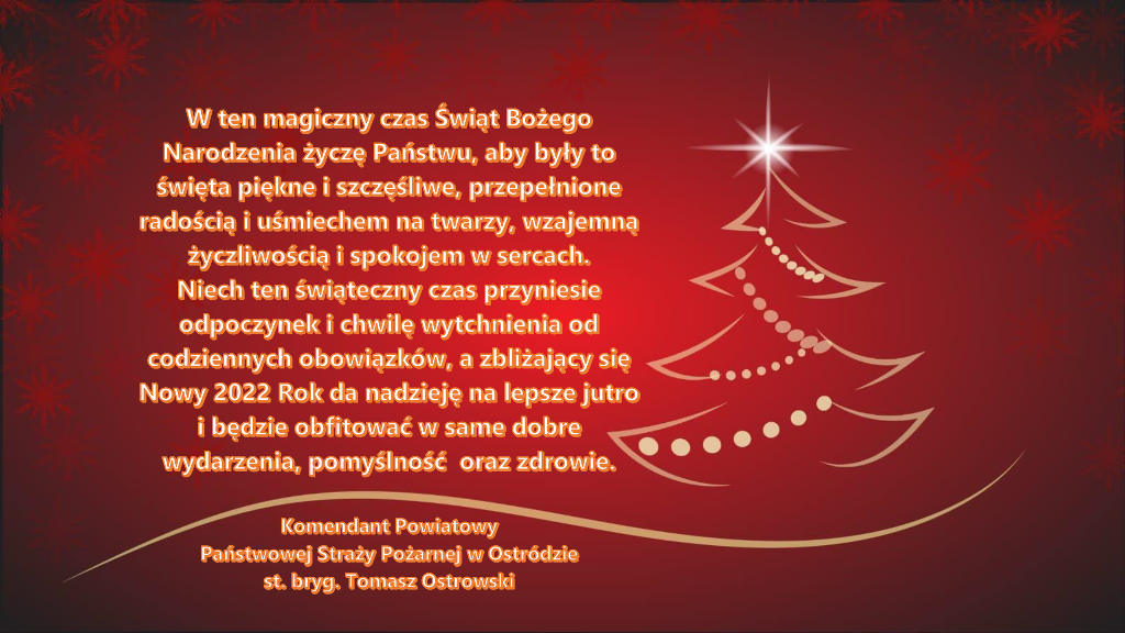 Życzenia świąteczne ostródzkiego Komendanta Powiatowego PSP 22.12.2021 Wideo Zdjęcia (1) Pokaż zdjęcie 1 z galerii.