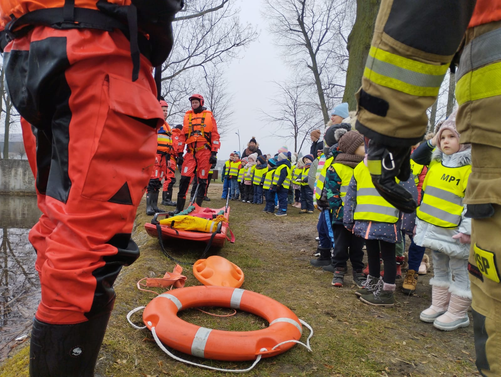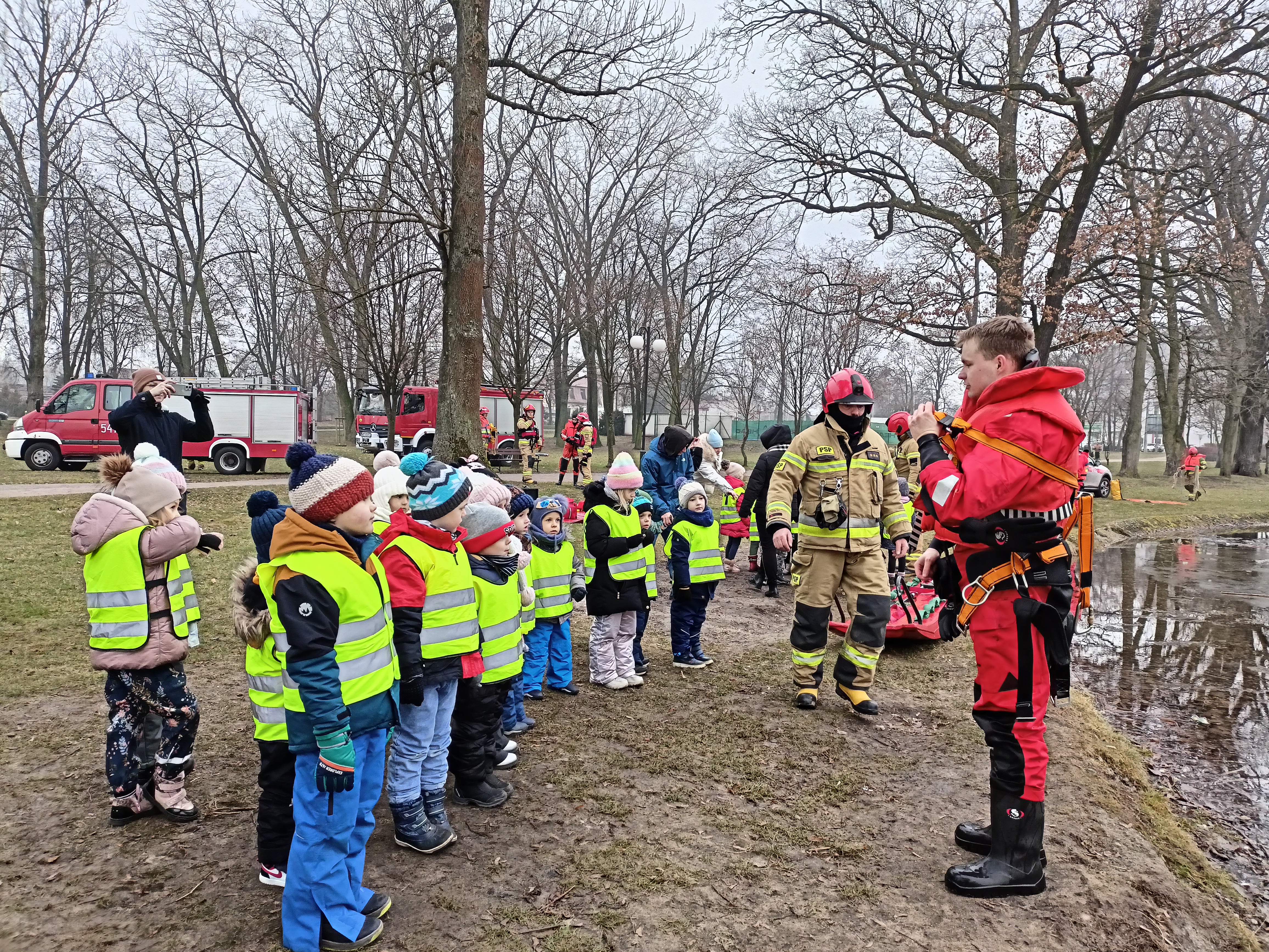 Strażacy przedstawili symulacje zdarzenia, podczas którego pod człowiekiem załamuje się lód. W trakcie pokazu zademonstrowano jak należy zachować się w takiej sytuacji jako poszkodowany i jako świadek zdarzenia. Omówiono z przybyłymi na spotkanie dziećmi zasady wzywania służb ratunkowych oraz przedstawiono sposoby udzielania tonącemu pomocy z zachowaniem własnego bezpieczeństwa.