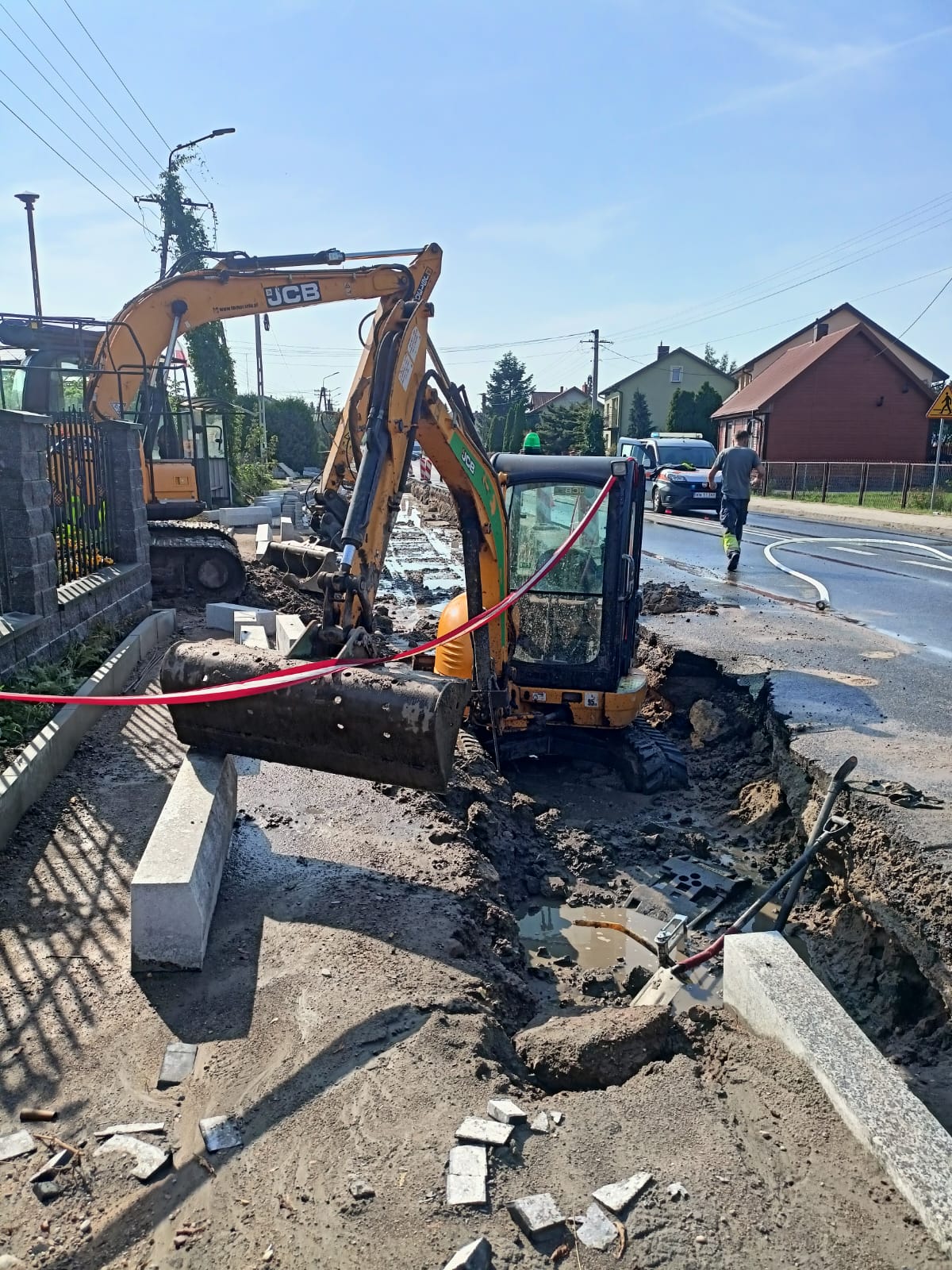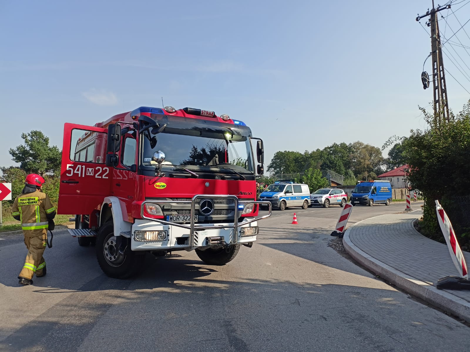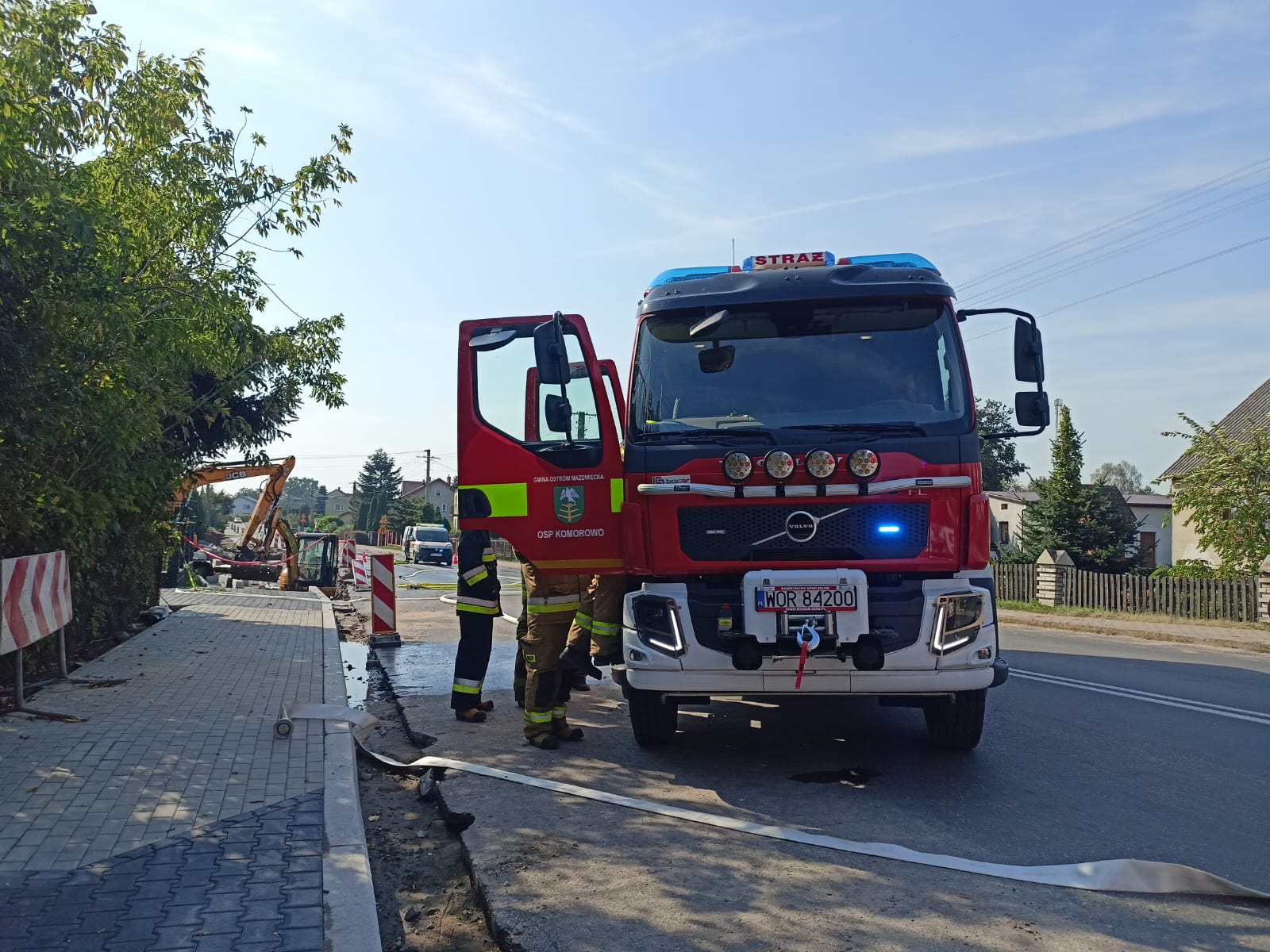 W dniu dzisiejszym (16.09.2024 r.) podczas prowadzonych prac ziemnych doszło do uszkodzenia przyłącza gazowego w miejscowości Komorowo przy ul. Mazowieckiej. Na miejsce udały się cztery zastępy straży. W działaniach brało udział łącznie 20 strażaków oraz przedstawiciele Pogotowia Gazowego, Policji i Pogotowia wodno-kanalizacyjnego.