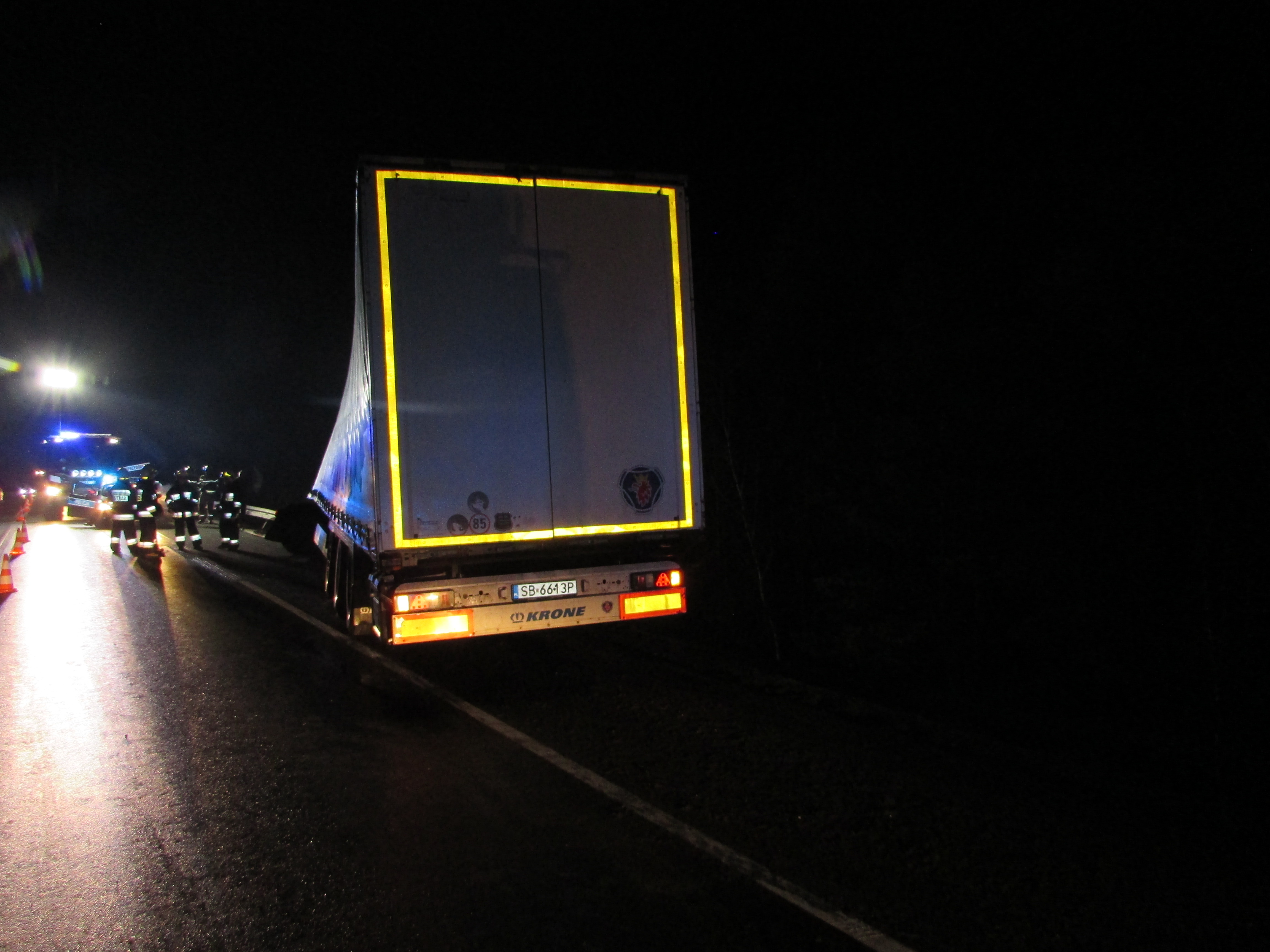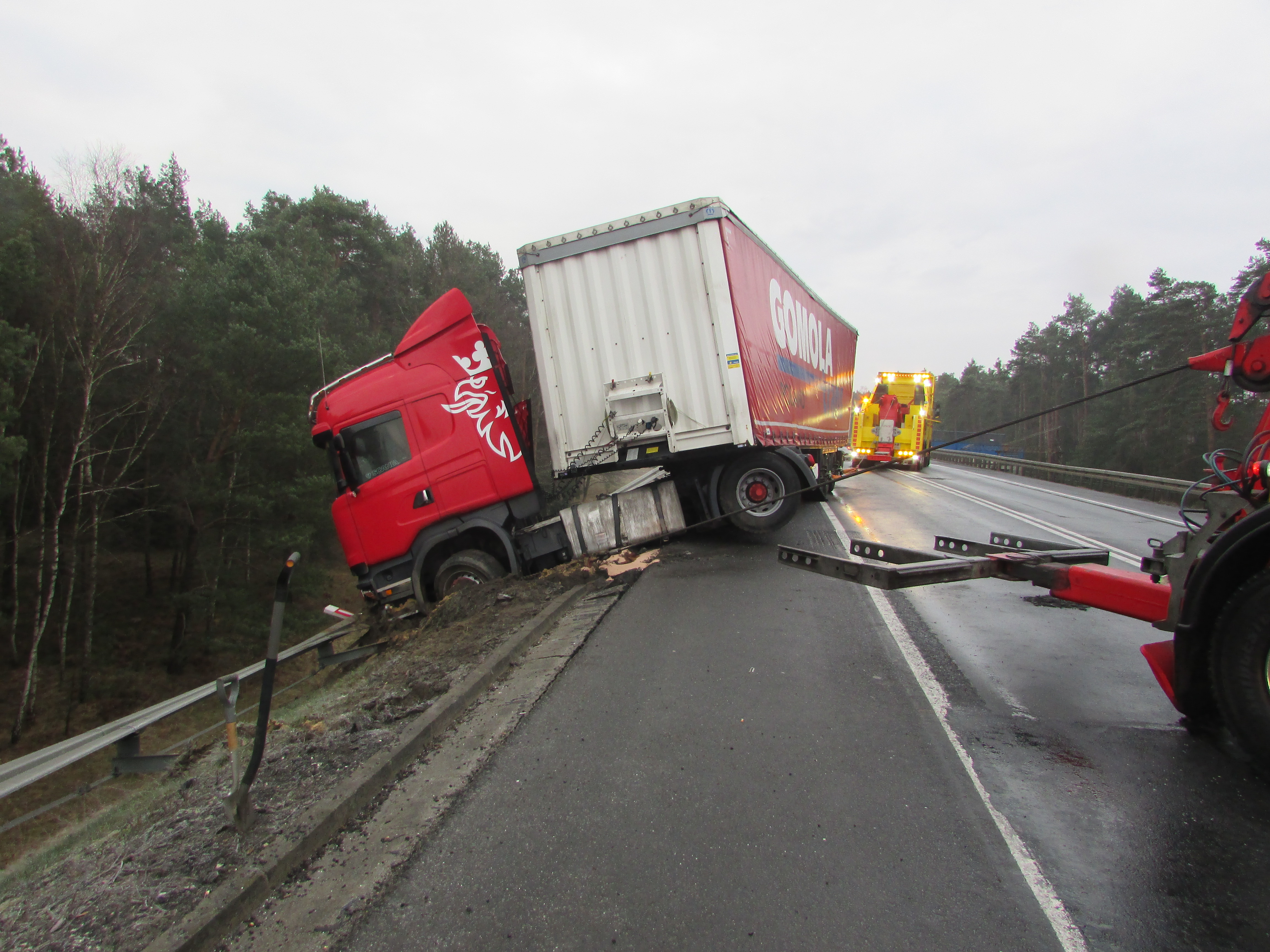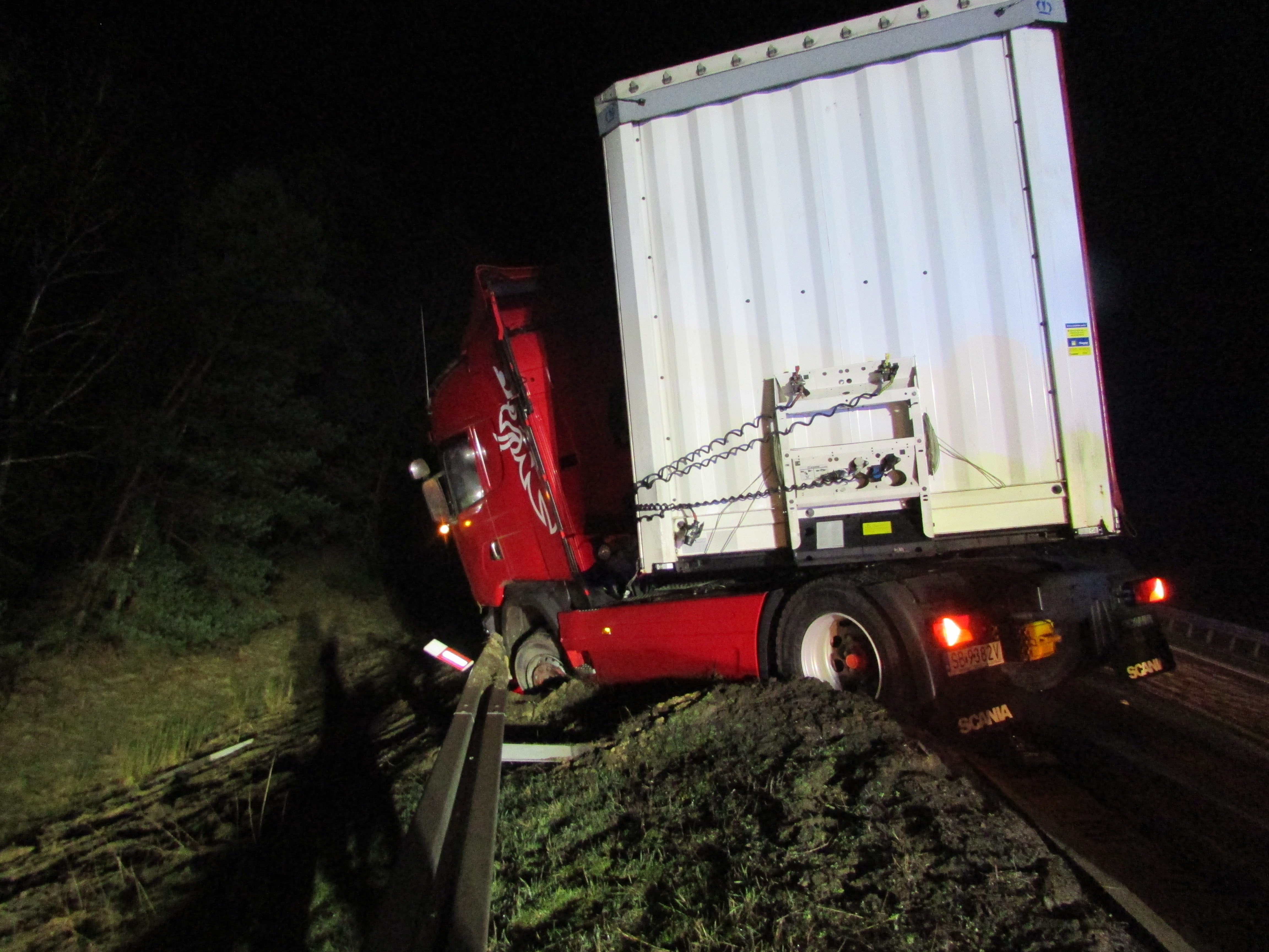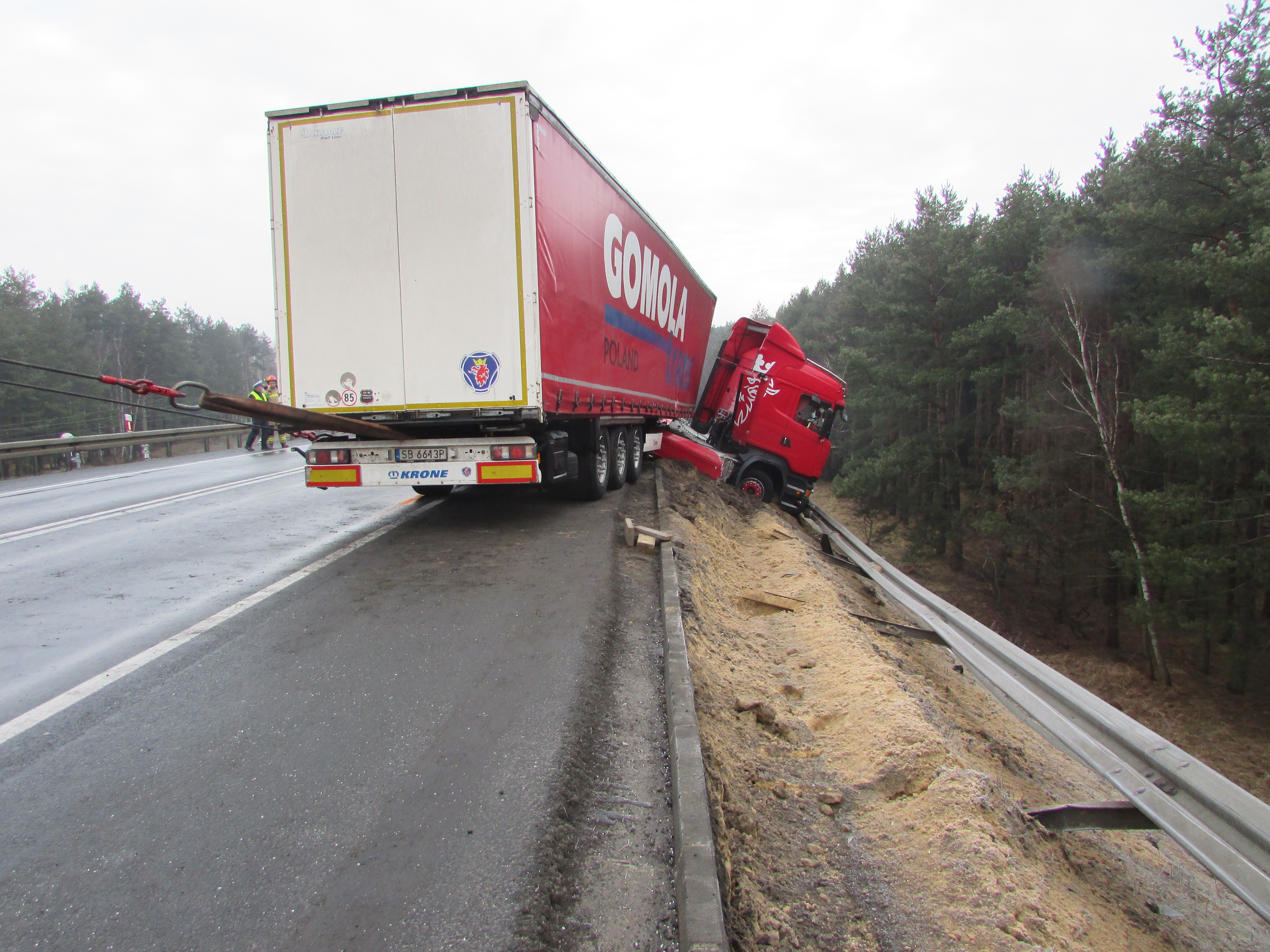Przybyłe na miejsce zdarzenia jednostki ochrony przeciwpożarowej stwierdziły, że samochód ciężarowy uderzył w bariery energochłonne na wiadukcie kolejowym. Naczepa samochodu znajdowała się na jezdni, natomiast ciągnik siodłowy został złamany i dzięki barierom nie spadł z całym zestawem z wiaduktu. Na szczęście kierowca samochodu ciężarowego nie odniósł żadnych obrażeń i sam o własnych siłach opuścił pojazd przed przybyciem zastępów straży pożarnej. Obecny na miejscu kierujący działaniami ratowniczymi podjął działania mające na celu zabezpieczenia miejsca zdarzenia oraz dokładnemu sprawdzeniu czy zestaw nie stwarza zagrożenia osunięcia się z wiaduktu. Po dokładnym sprawdzeniu okazało się że samochód ciężarowy wraz z naczepą stoi stabilnie dzięki barierom energochłonnym i nie było potrzeby zastosowania stabilizacji. Po przybyciu na miejsce pomocy drogowej SP zabezpieczała wyciagnięcie zestawu na jezdnię.