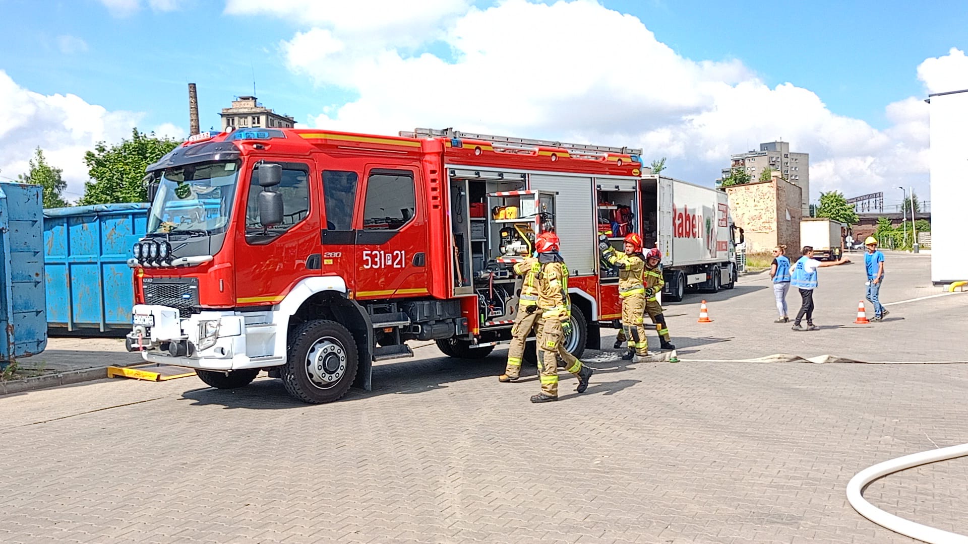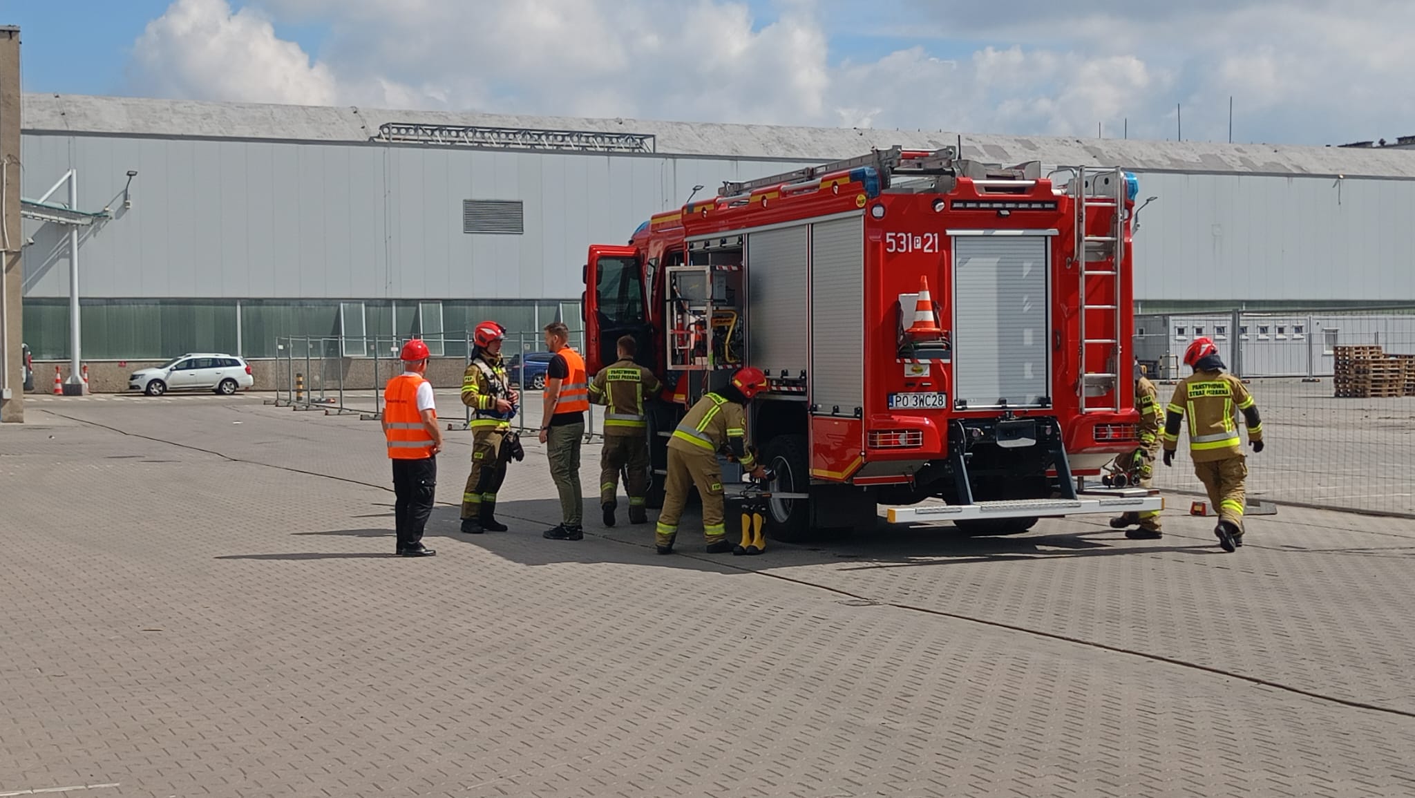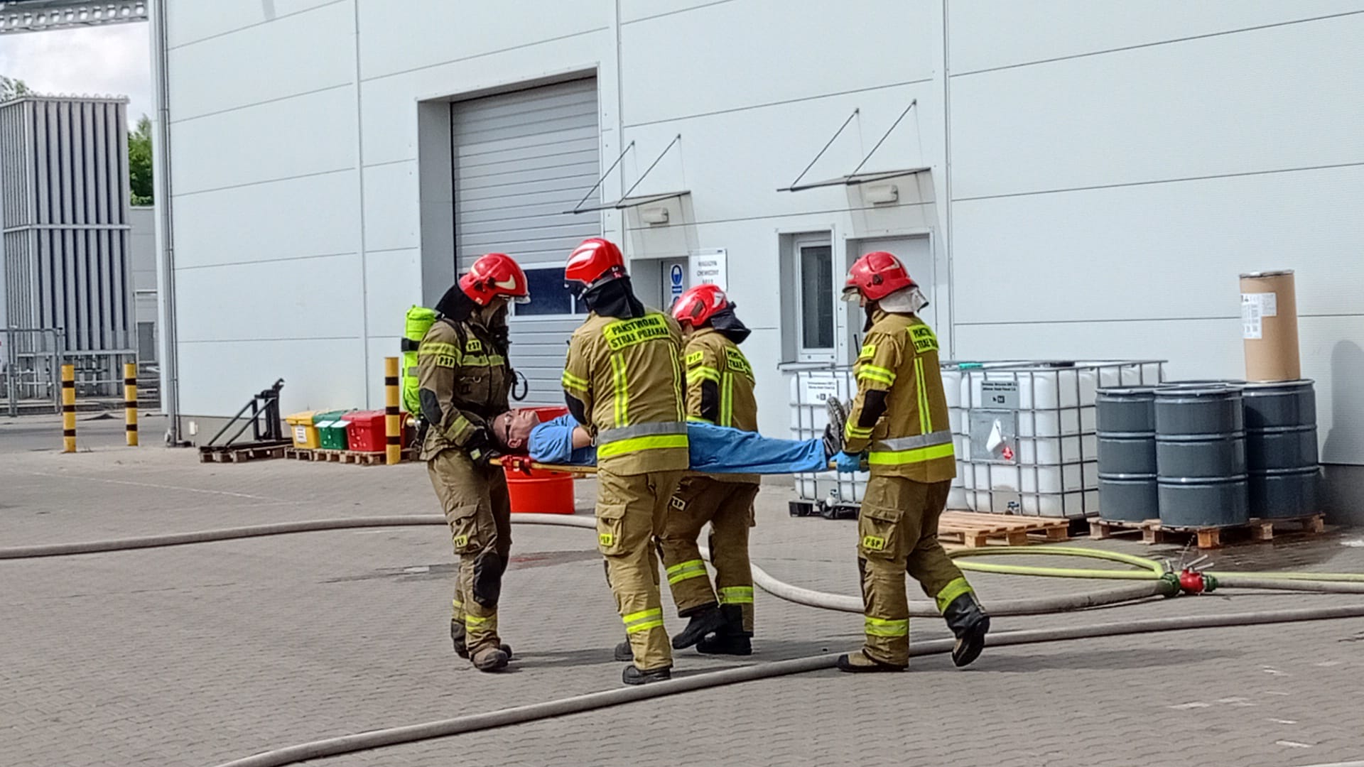 Scenariusz ćwiczeń obejmował pożar składowiska palet. W związku z wystąpieniem zagrożenia na terenie zakładu zdecydowano się na przeprowadzenie ewakuacji pracowników. Podczas ogłoszenia alarmu jeden z pracowników przypadkowo rozlał substancję chemiczną, w wyniku czego doznał poparzenia czynnikiem i stracił przytomność.
