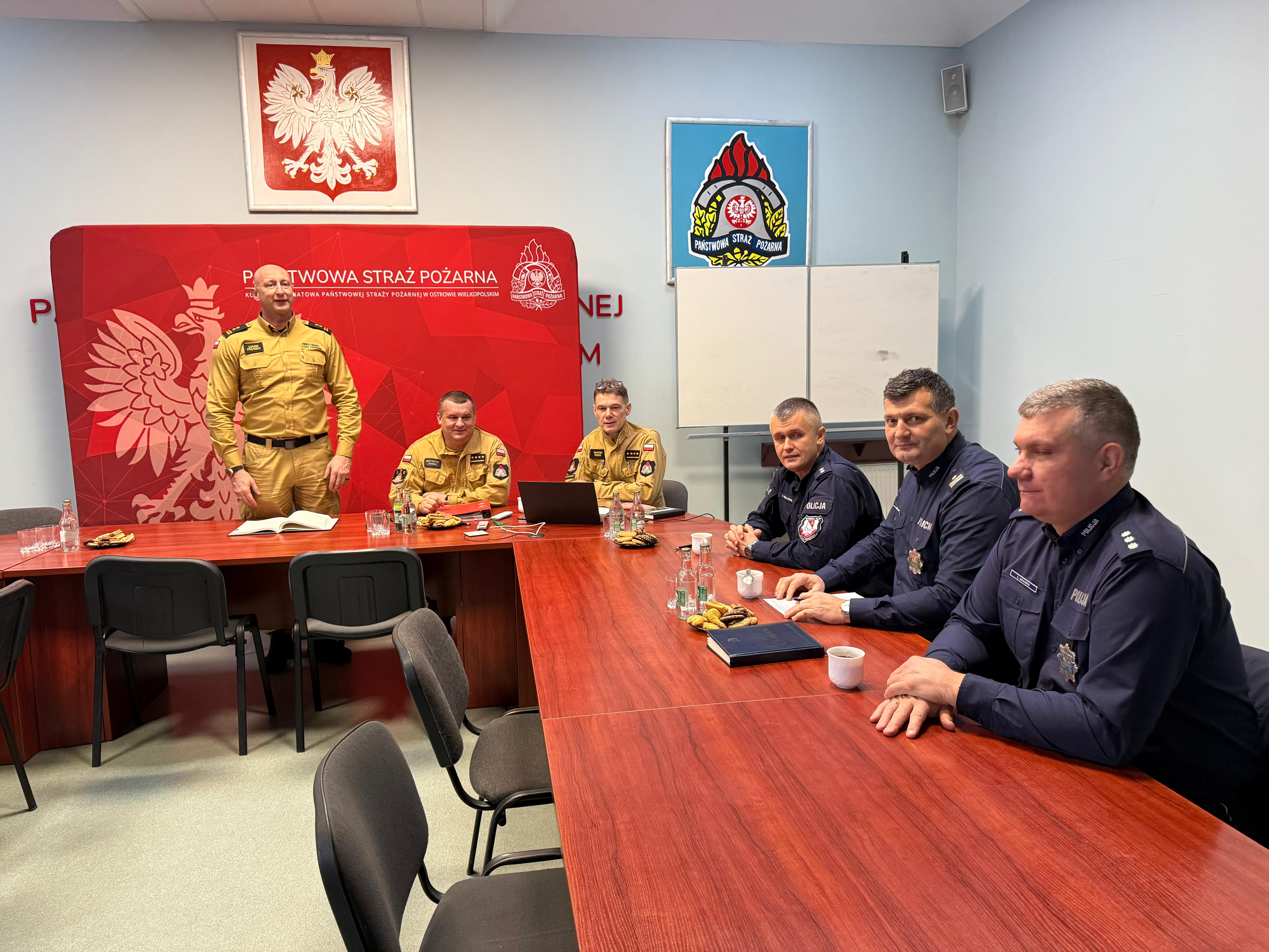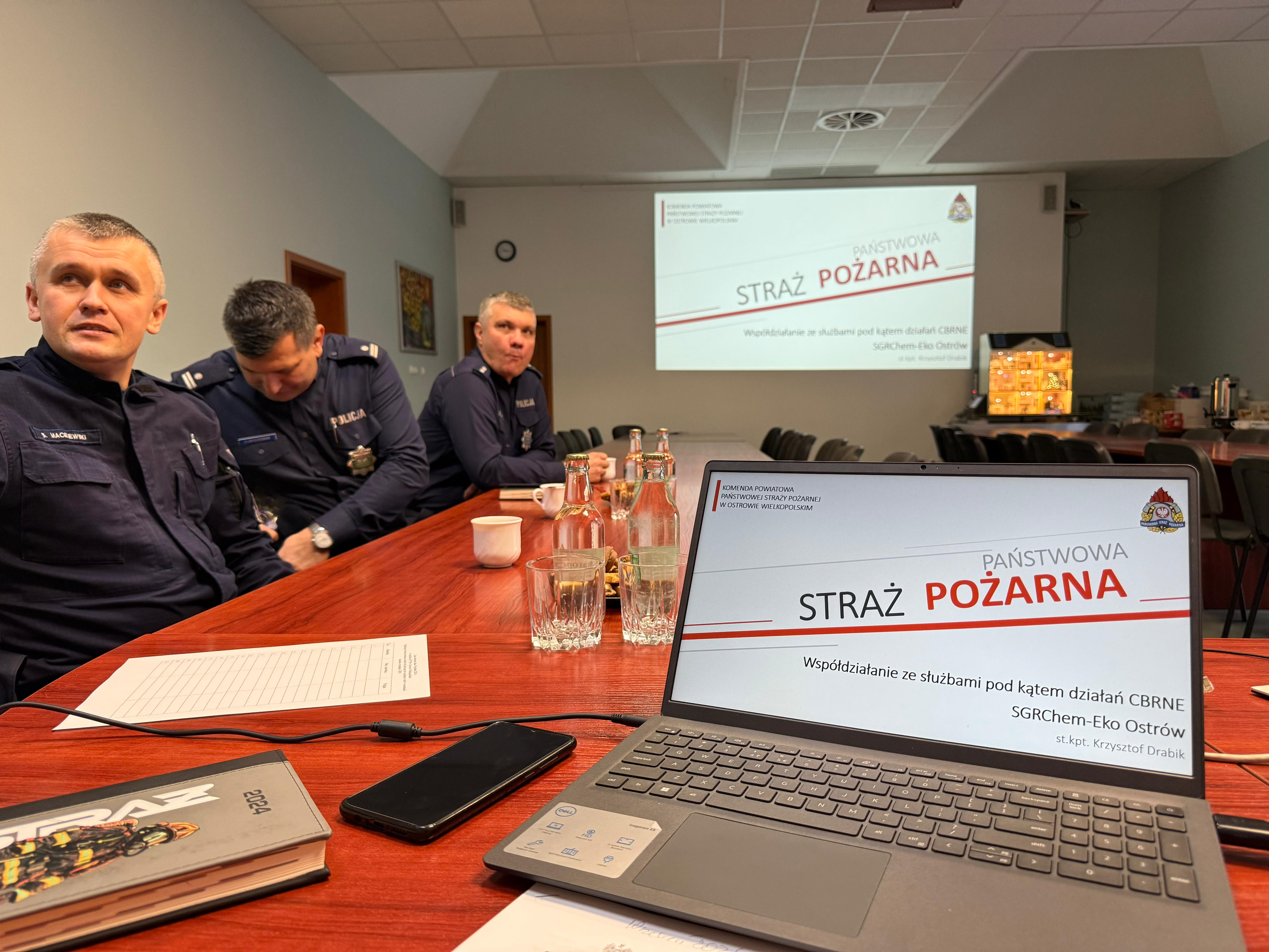 18 grudnia 2024 roku w budynku Komendy Powiatowej Państwowej Straży Pożarnej w Ostrowie Wielkopolskim odbyły się ćwiczenia dowódczo-sztabowe Państwowej Straży Pożarnej oraz Policji dotyczące współpracy na miejscu zdarzenia o charakterze CBRN-E.