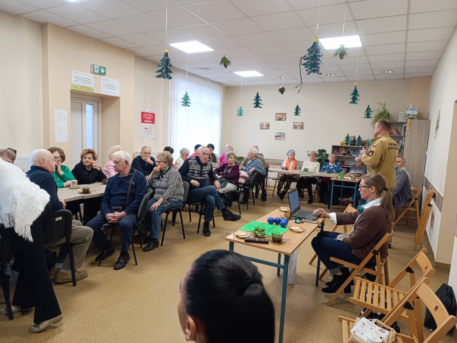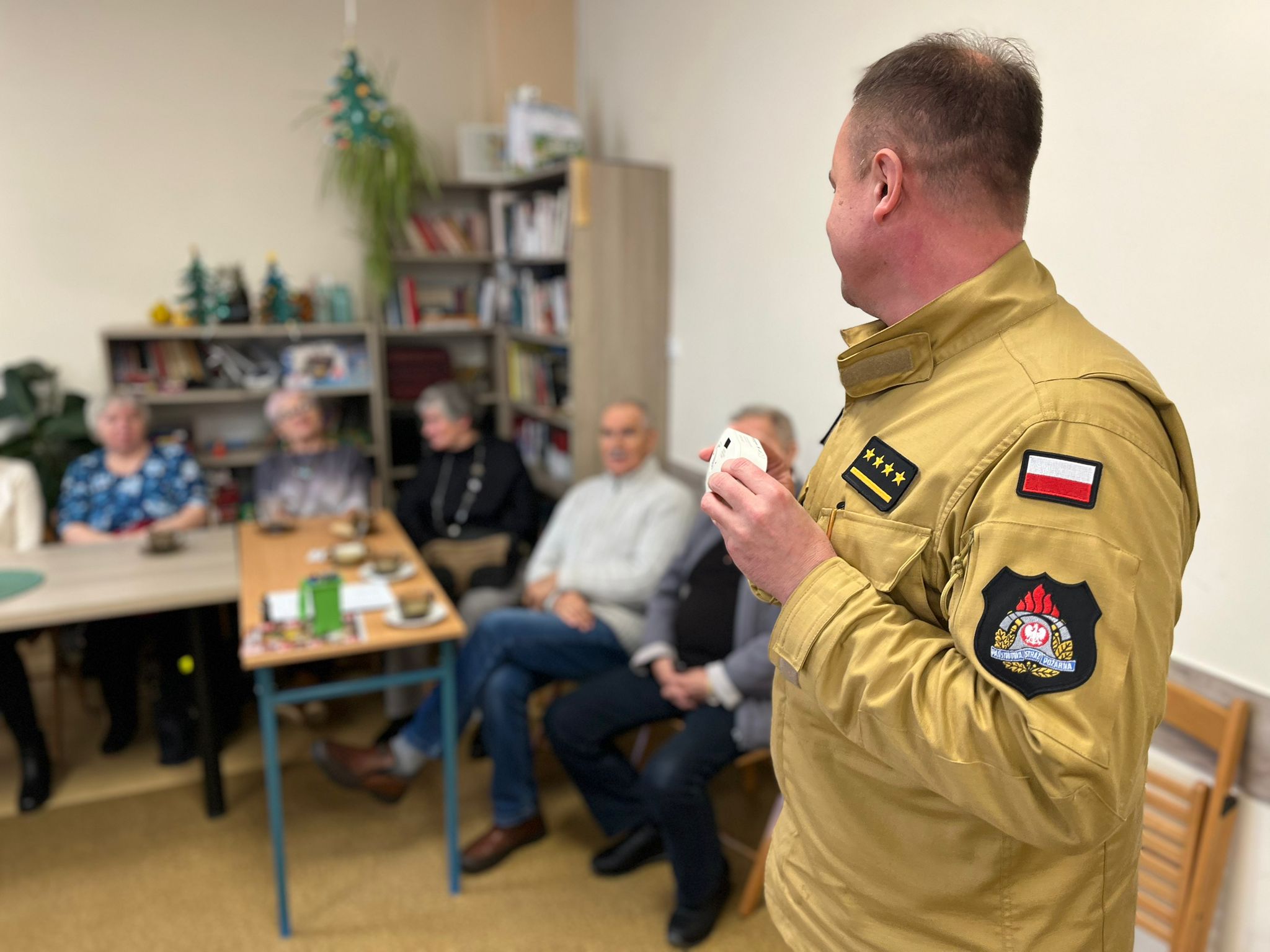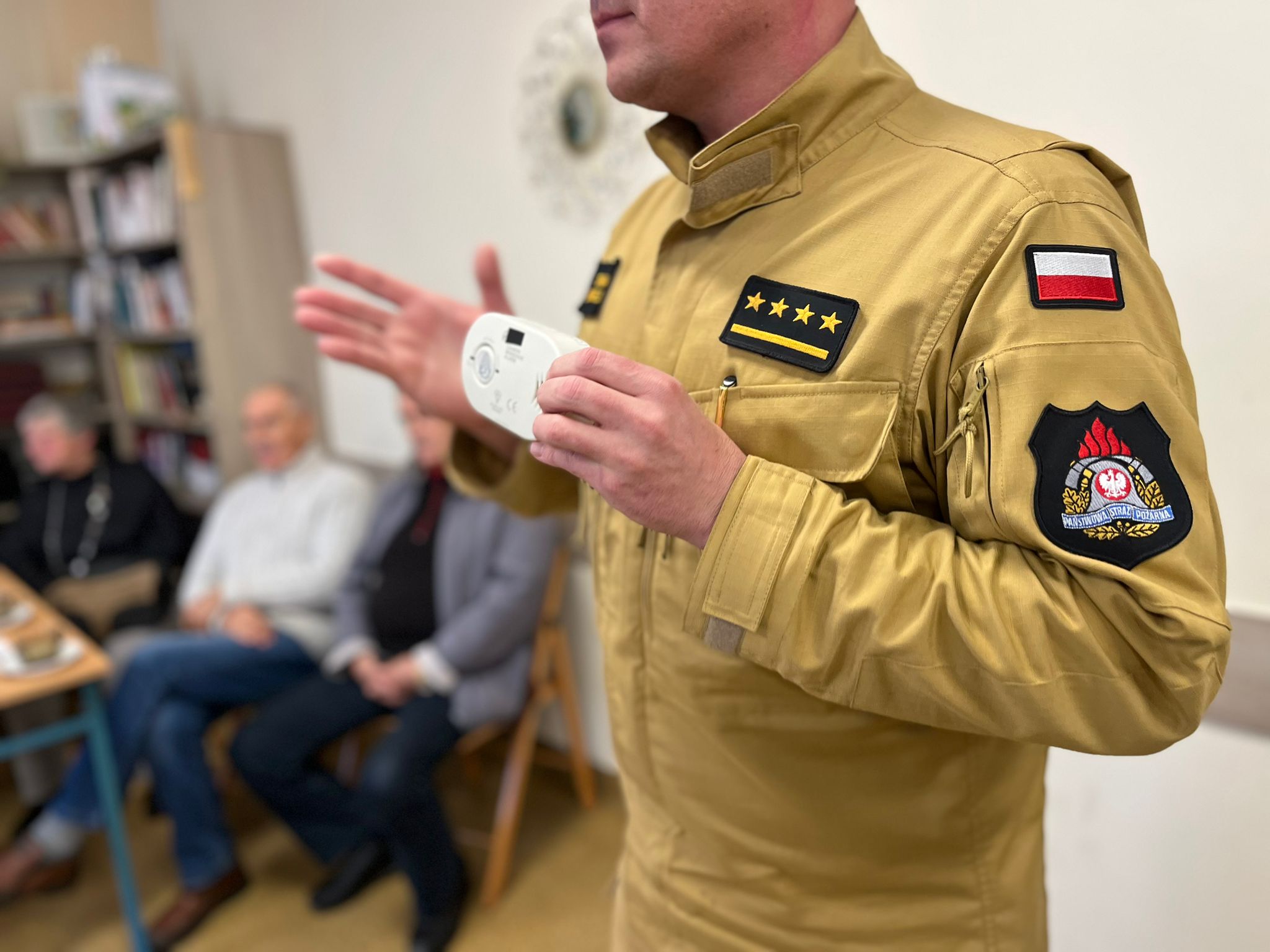 Druga część spotkania została poświęcona tematowi bezpieczeństwa w kontekście tlenku węgla. Seniorzy poznali najważniejsze informacje dotyczące rodzajów czujników dymu i czadu, zasad ich prawidłowego montażu oraz bezpiecznej eksploatacji w mieszkaniach i domach jednorodzinnych.