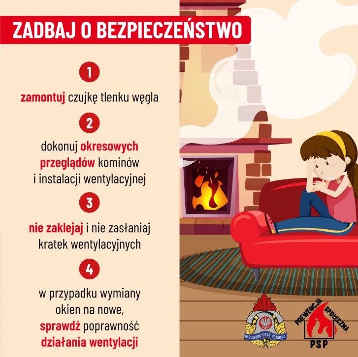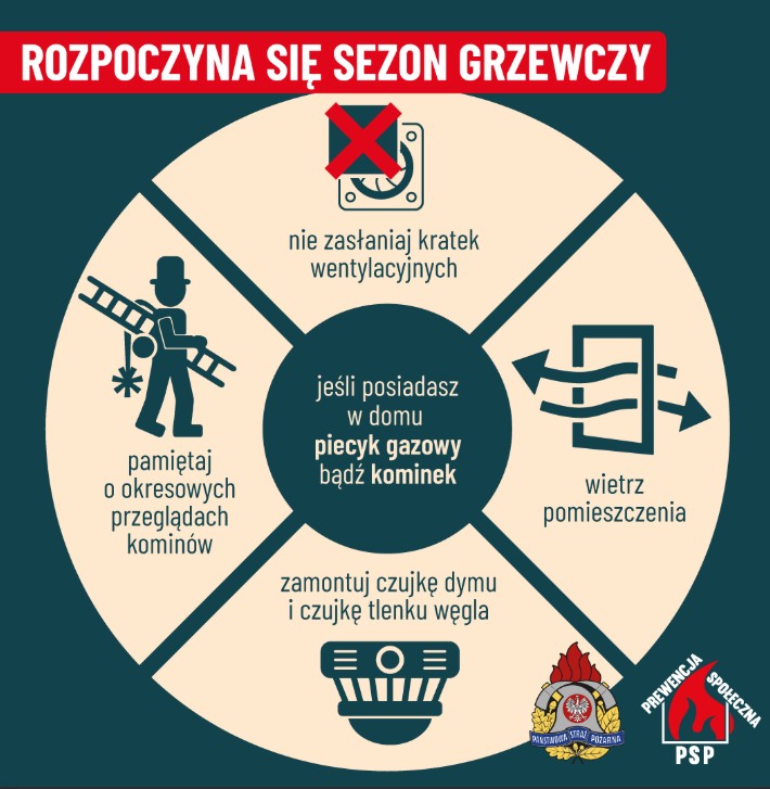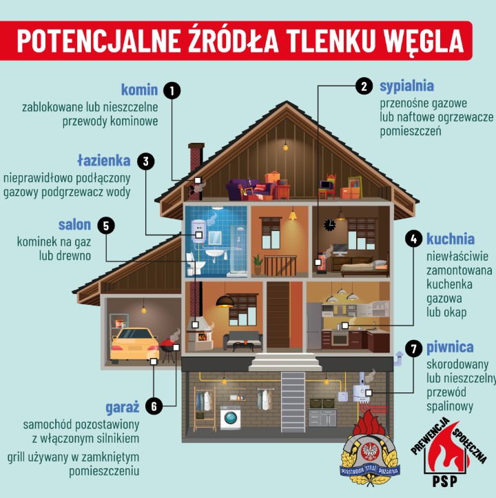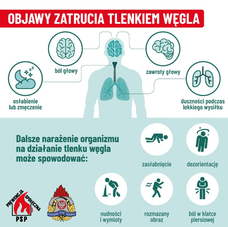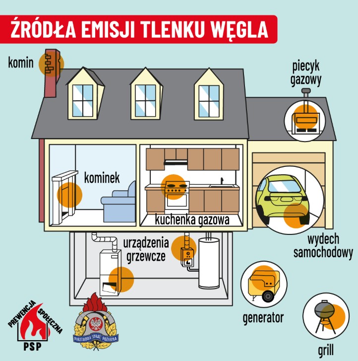 - W okresie grzewczym wzrasta ryzyko powstania pożarów i zatruć tlenkiem węgla w budynkach mieszkalnych. Źródłem emisji tlenku węgla są urządzenia grzewcze opalane drewnem, węglem, gazem, olejem opałowym.