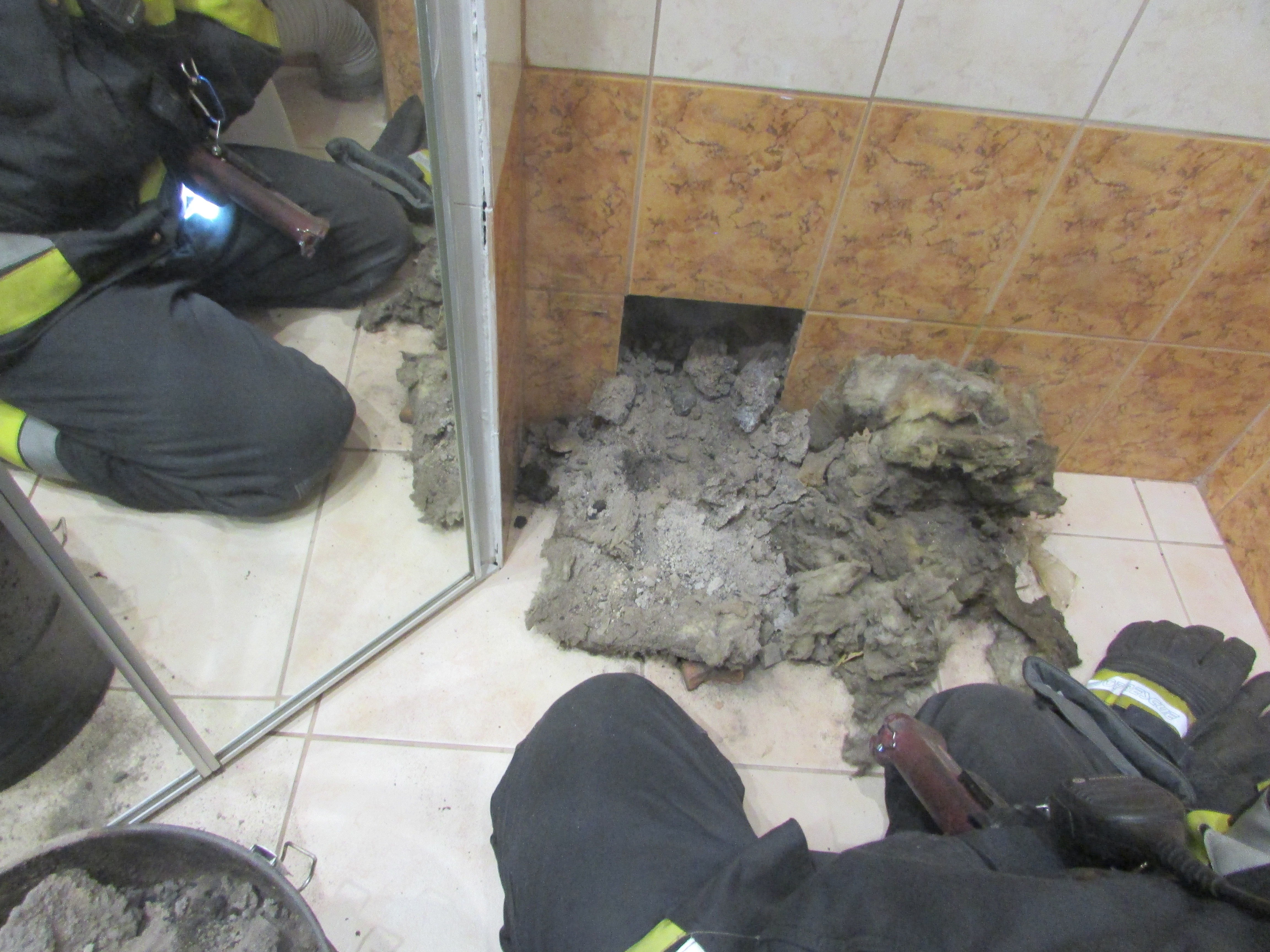 Mieszkańcy opuścili budynek przed przybyciem zastępów straży pożarnej. Nasze działania polegały na zabezpieczeniu miejsca zdarzenia, ugaszeniu pożaru za pomocą sita kominowego oraz oczyszczeniu komina zestawem kominiarskim. Po ugaszeniu pożaru sprawdzono przewody kominowe przy użyciu kamery termowizyjnej oraz monitorowano poziom tlenku węgla przy użyciu sprzętu pomiarowego. Właścicielowi zalecono przeprowadzenie kontroli kominiarskiej, a do tego czasu nieużytkowanie kominka.