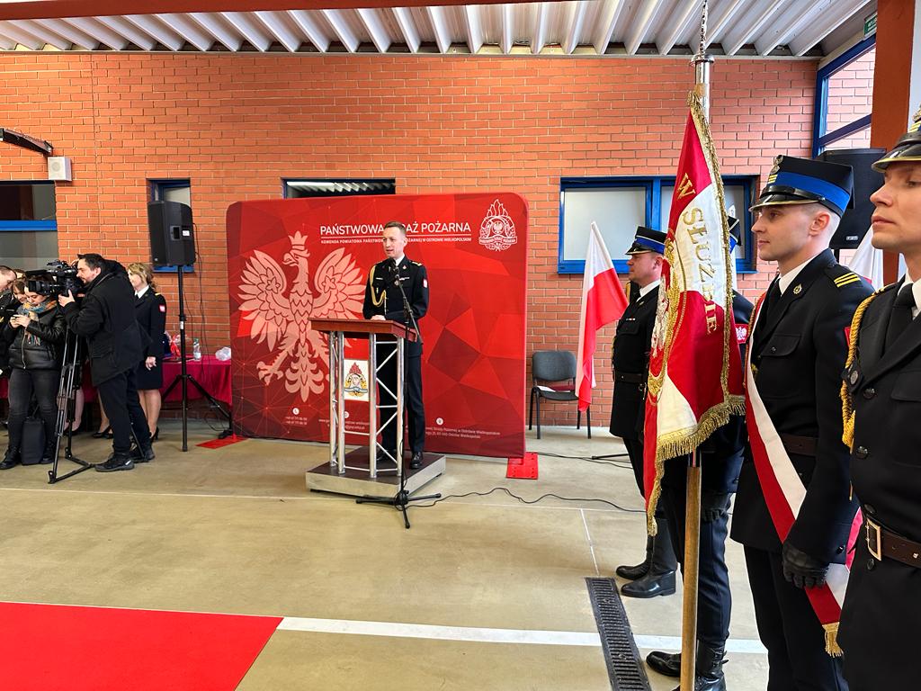 Druga część spotkania rozpoczęła się złożeniem meldunku przez dowódcę uroczystości, który przyjął p.o. Wielkopolskiego Komendanta Wojewódzkiego PSP - st. bryg. Tomasz Grelak. Następnie wprowadzony został sztandar oraz odegrano hymn narodowy.